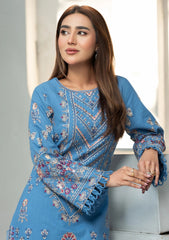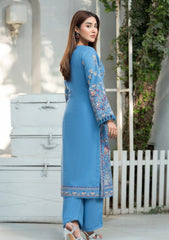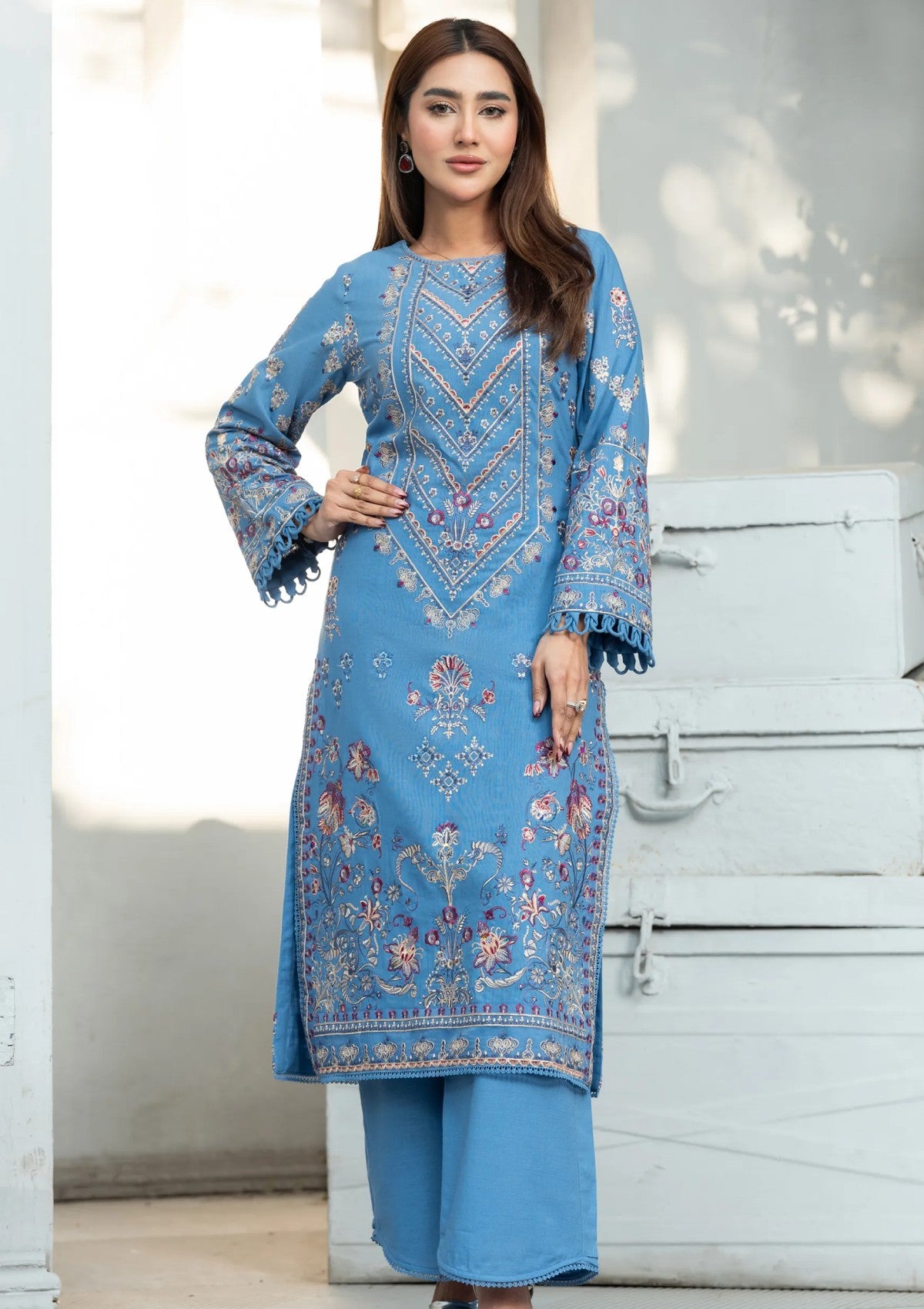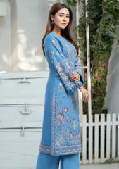 The is a classic Blue Khaddar fabric dress that provides a canvas for multicolored embroidery to shine through in the form of delicate artwork. Pairder with U shaped culottes to add extra oomph to the dress.