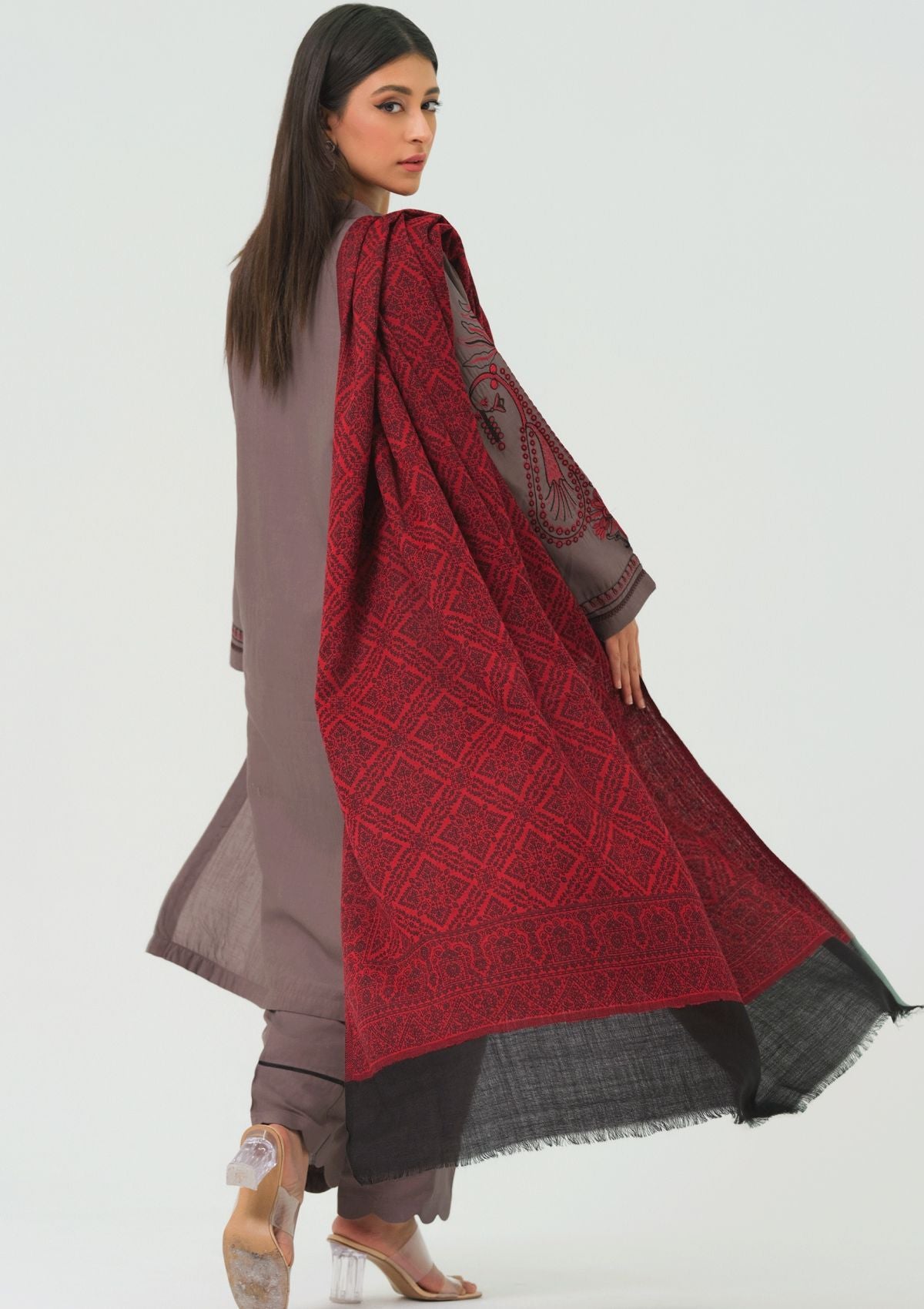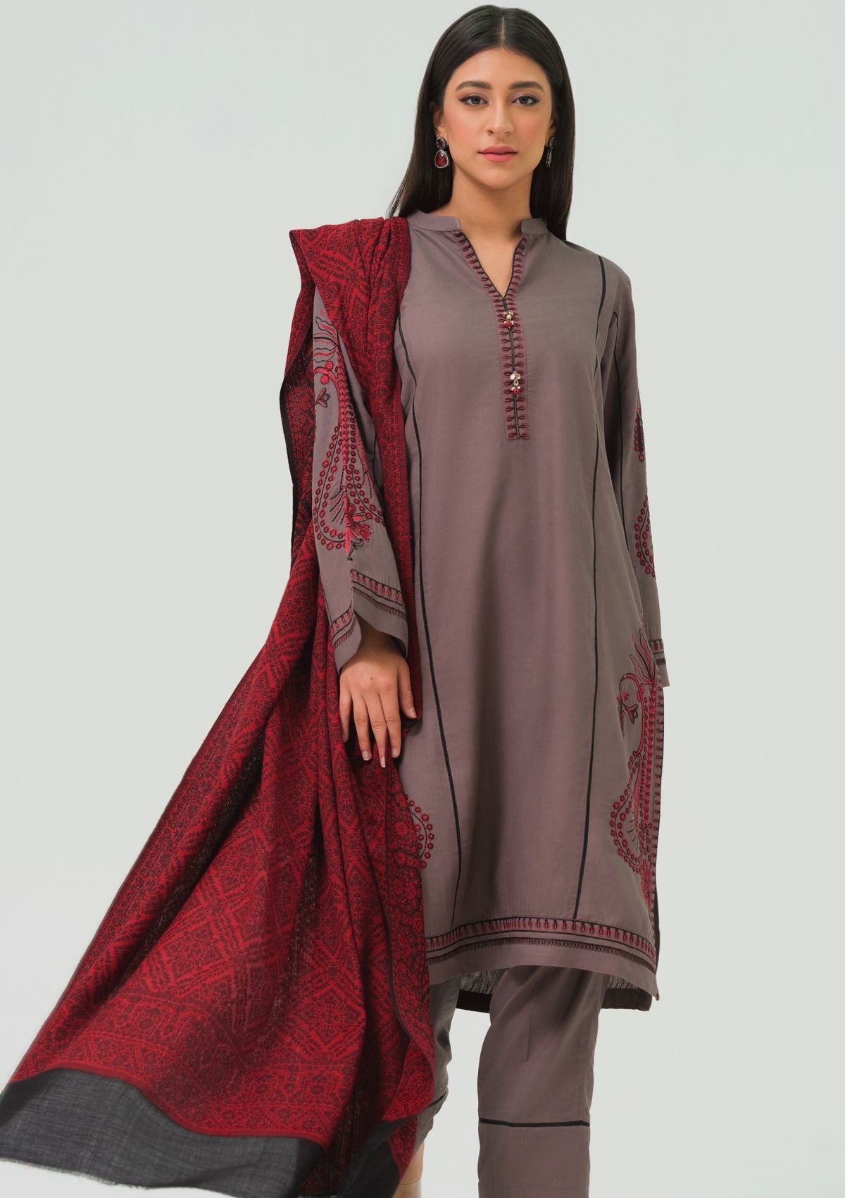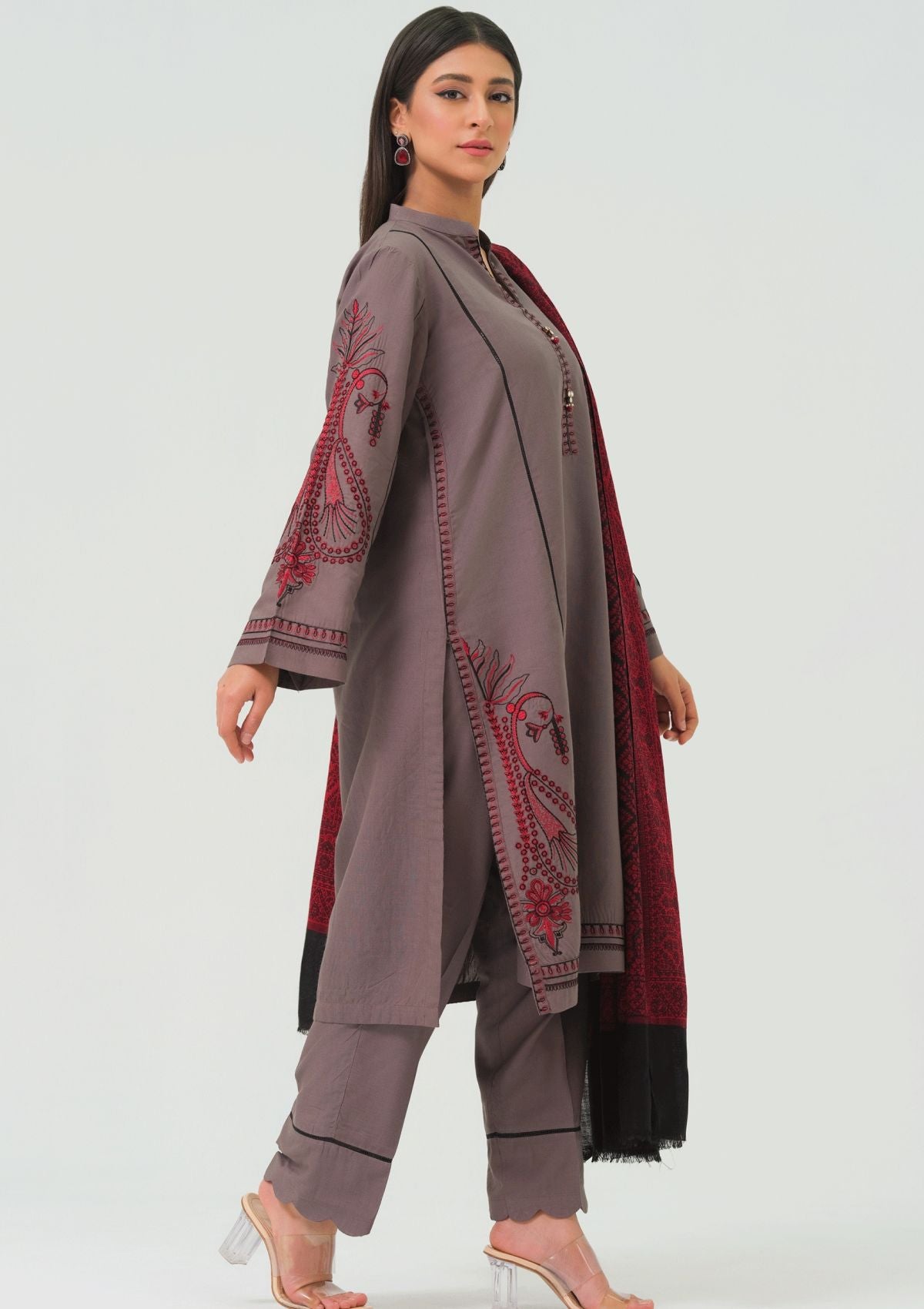 The dress is a sophisticated grey, characterized by its sleek and neutral tone. It features intricate paisley embroidery in red and black, adding a touch of elegance and detail. The paisley motifs are woven into the fabric using single stitch technique. Complementing the dress is a vibrant red shawl that drapes gracefully over the shoulders. The bold red of the shawl contrasts vividly with the subdued grey of the dress, enhancing the overall visual appeal.