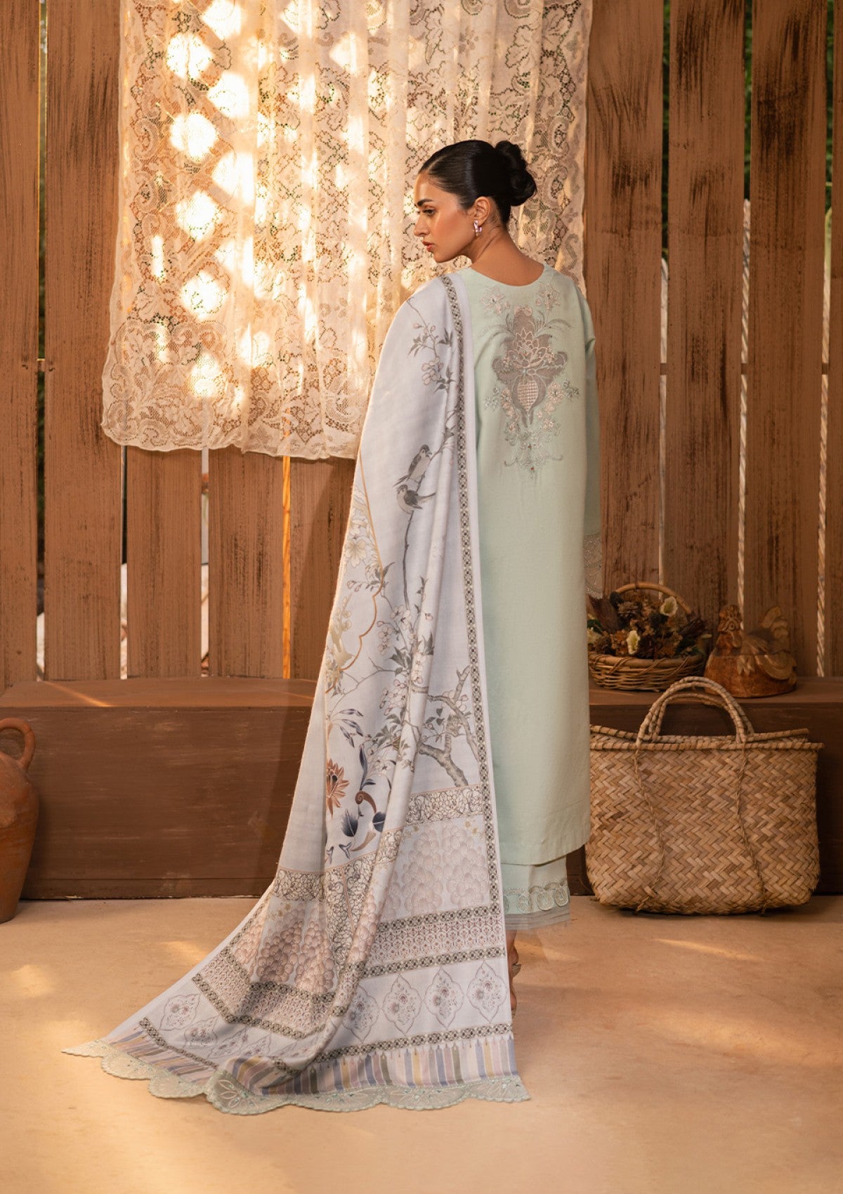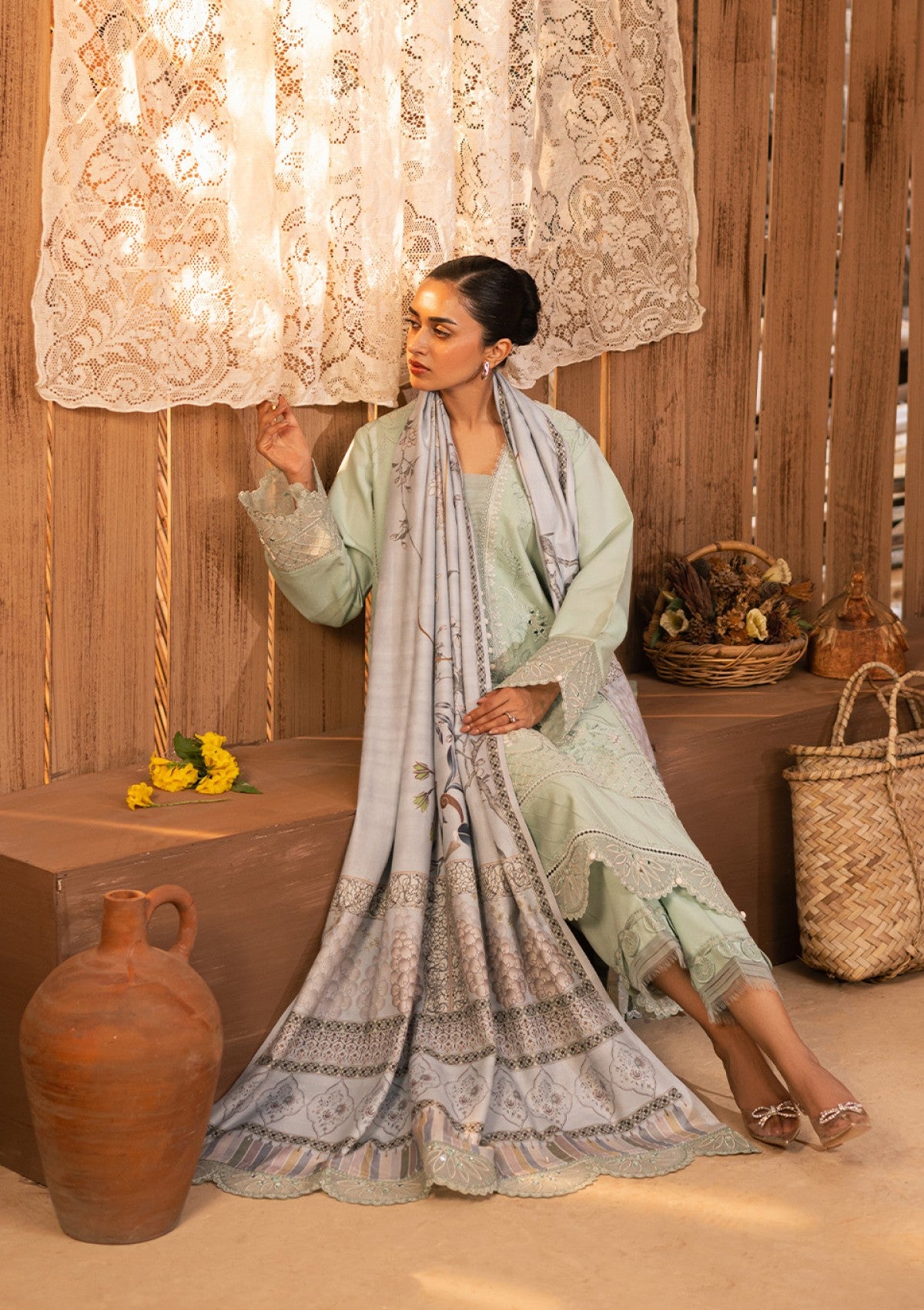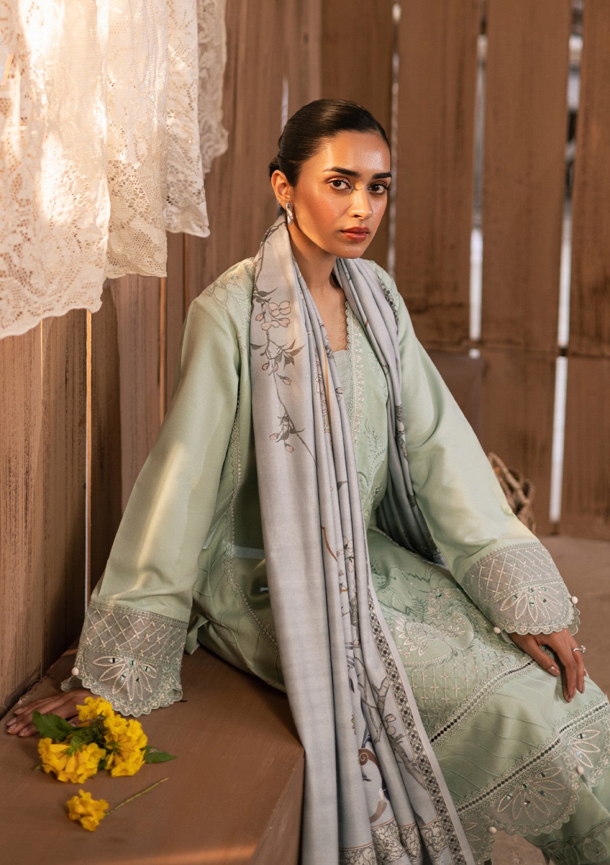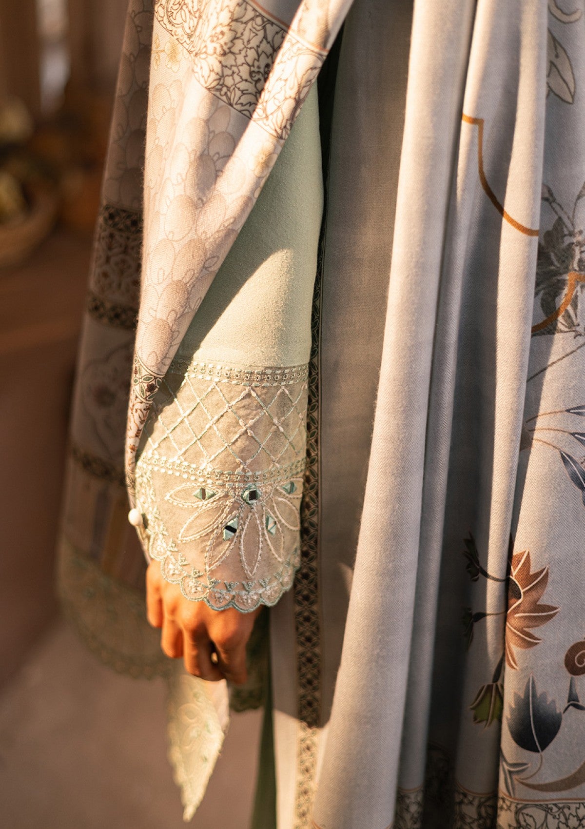 Behold "AYLA" a sartorial marvel that epitomizes sophistication and artistic finesse. Its glacial green hue serves as a captivating canvas, meticulously adorned with intricate embroidery depicting ivory floral in a state of enchanting bloom enhanced with mirror work detailing, paired with tonal detailed culottes. The pièce de résistance lies in the meticulously etched borders, each thread a testament to unparalleled craftsmanship, adding a uniquely exquisite dimension to the shirt. Accompanied by an impeccably crafted digital printed woolen shawl, adorned with complementary embroidered pallus enhanced with mirror work. This ensemble transcends mere attire to become a veritable masterpiece of wearable art. "Ayla" is a symbol of refined taste and discerning elegance, a testament to the wearer's appreciation for beauty and mastery in every meticulous detail.