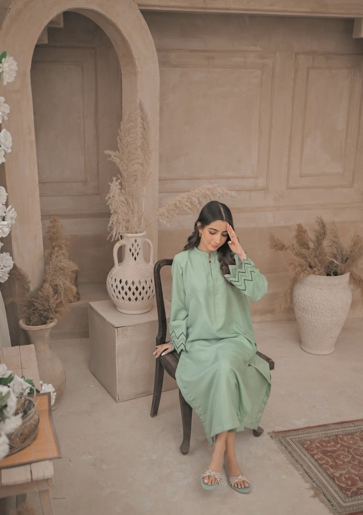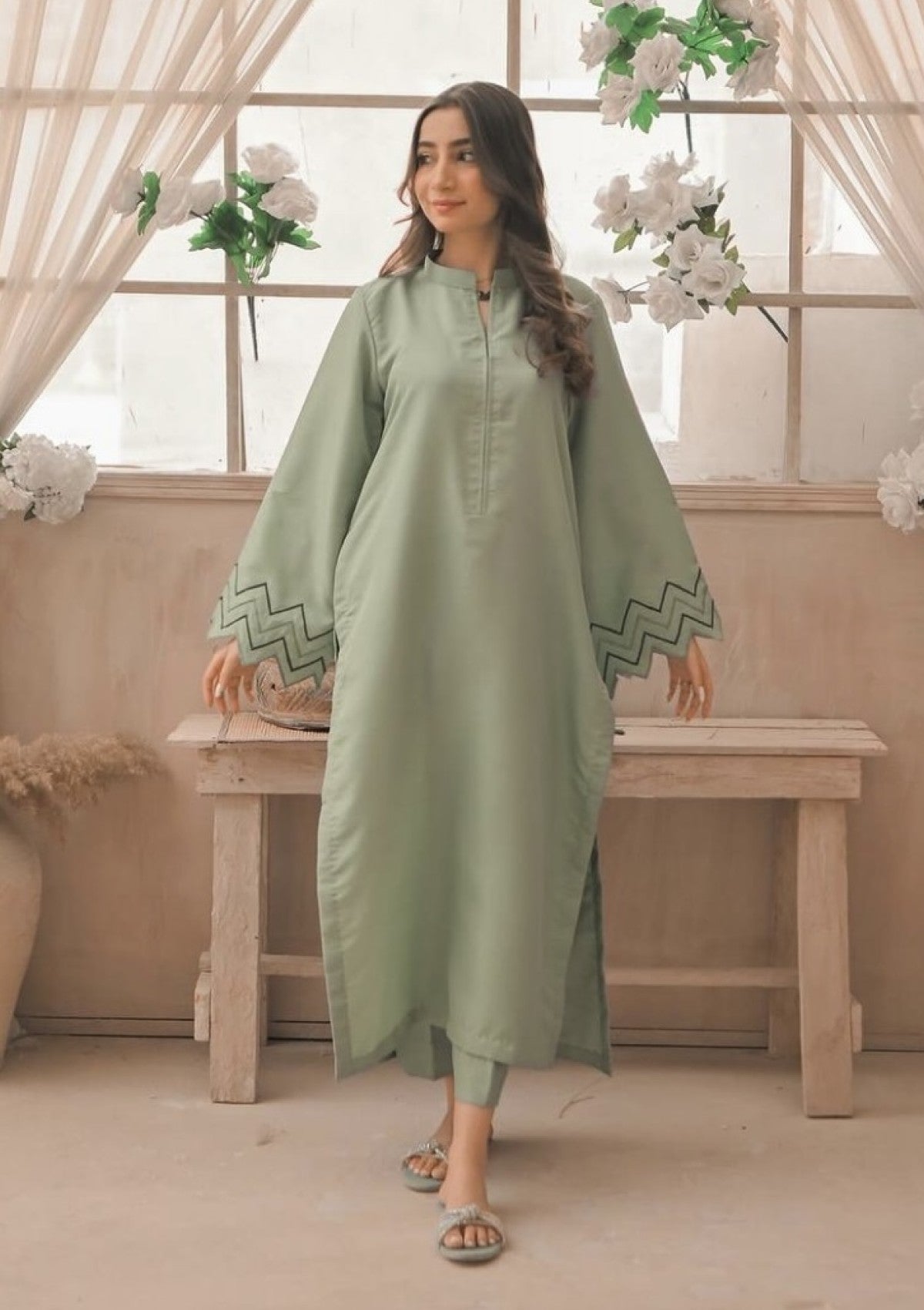 Apple green matching set includes a long shirt with embroidered details on sleeves along with straight trouser.