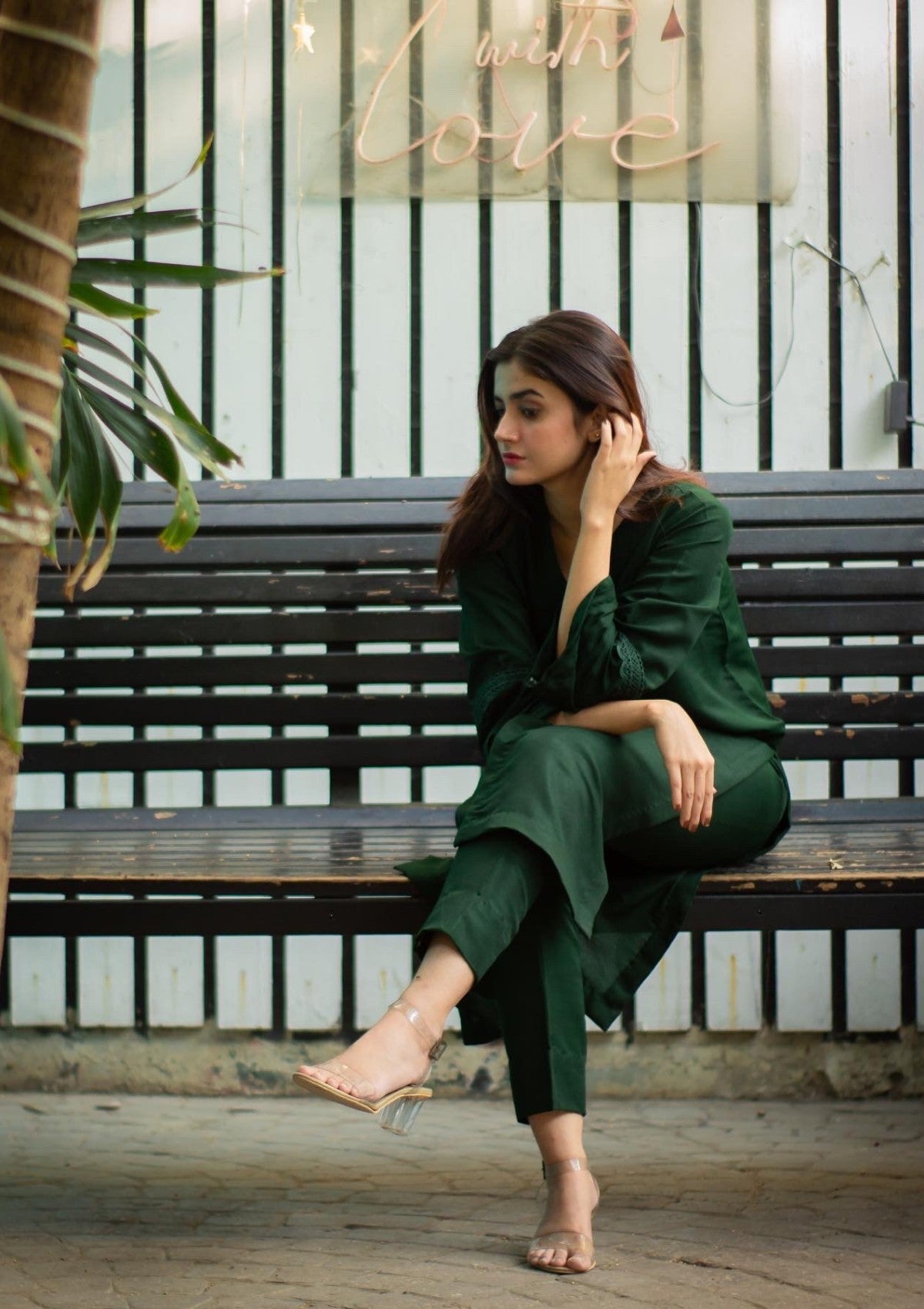 Bottle green two piece with a front open shirt with pleated and lace details on sleeves with matching pants