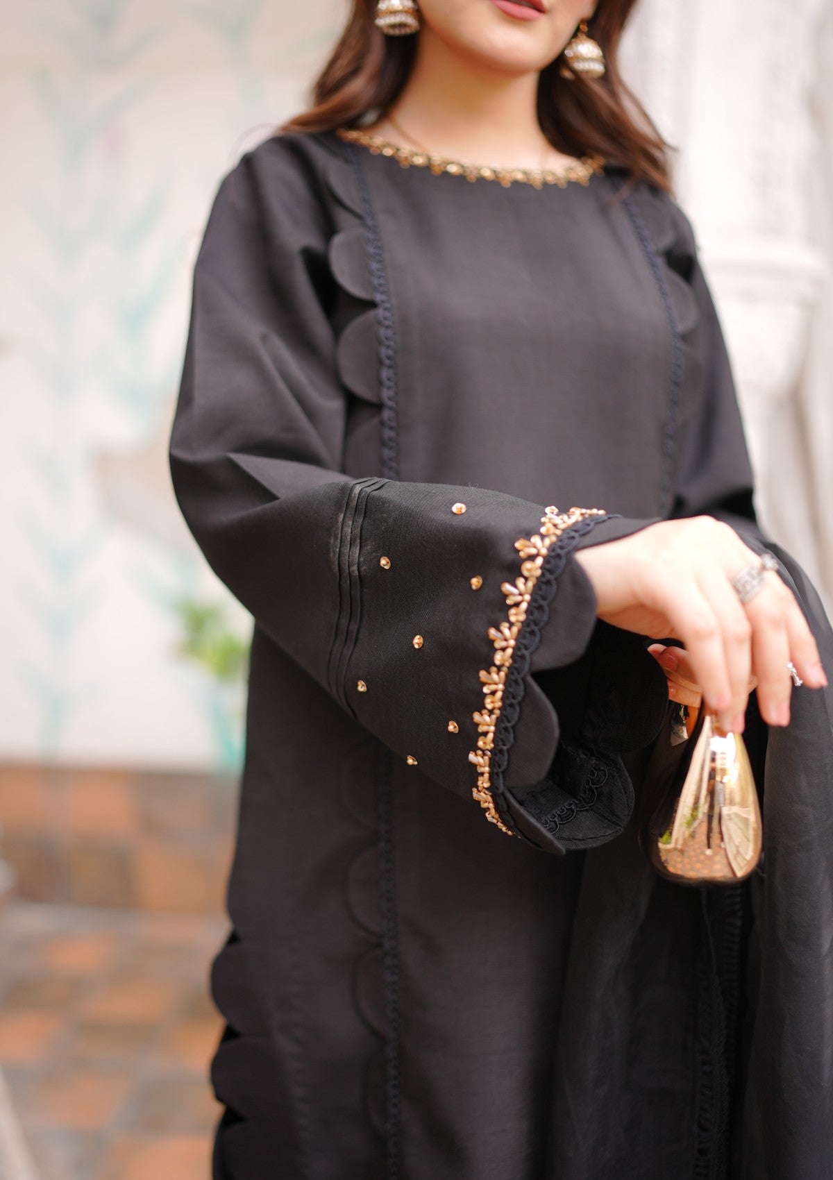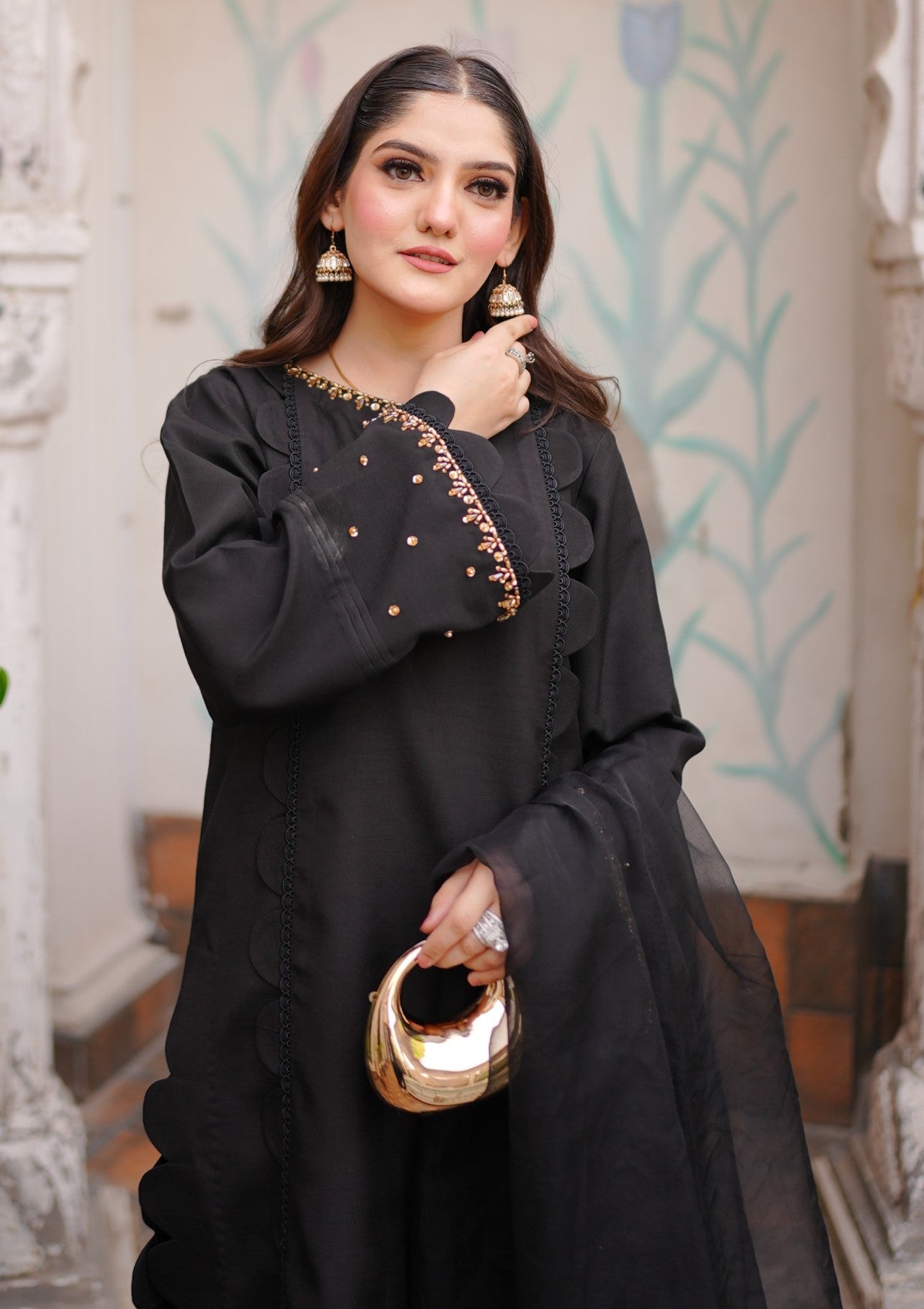 This black 3-piece embroidered silk dress with an organza dupatta is the perfect fusion of classic sophistication and graceful detailing. Crafted from luxurious silk, the shirt features elegant embroidery that adds richness and texture to its timeless black base. Paired with sleek matching trousers, the ensemble creates a refined silhouette ideal for formal or festive occasions. The look is beautifully completed with a sheer embroidered organza dupatta, adding a touch of delicacy and elegance. Whether for a special evening event or a traditional celebration, this outfit offers a poised and polished statement