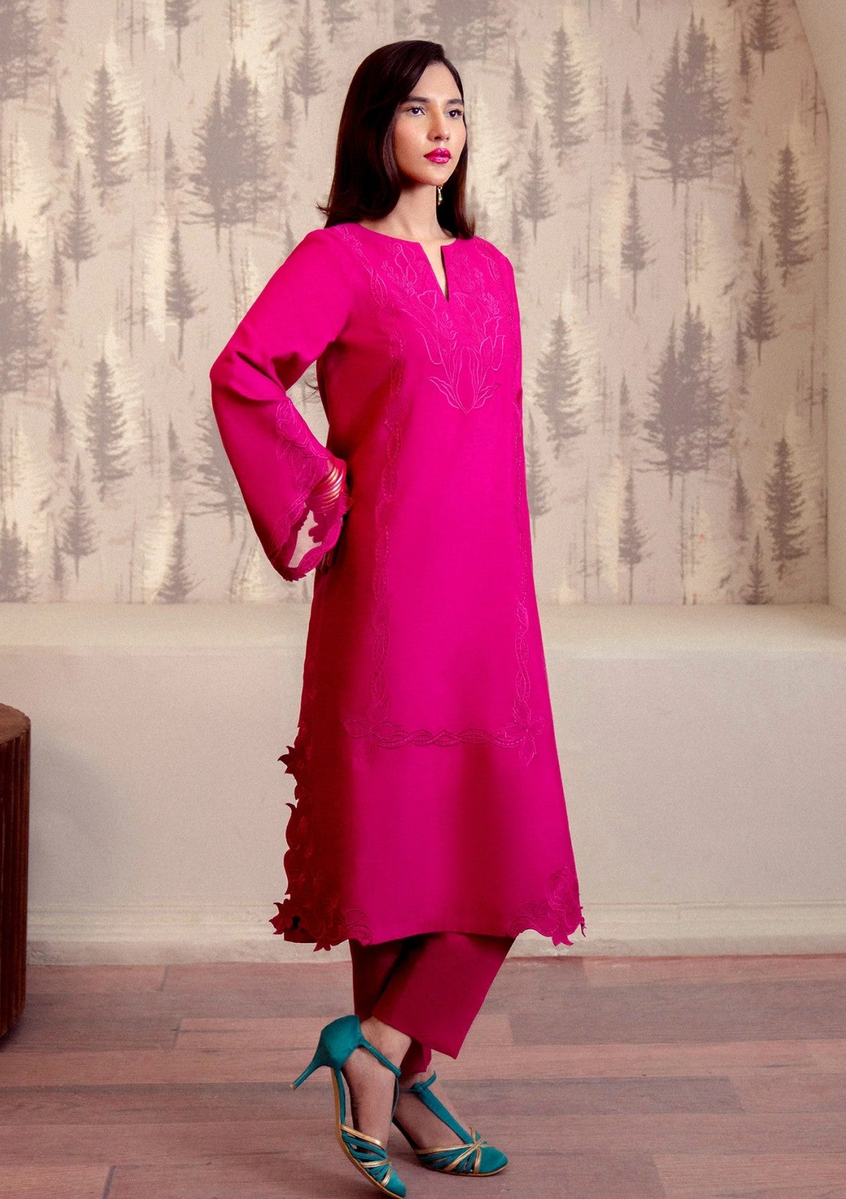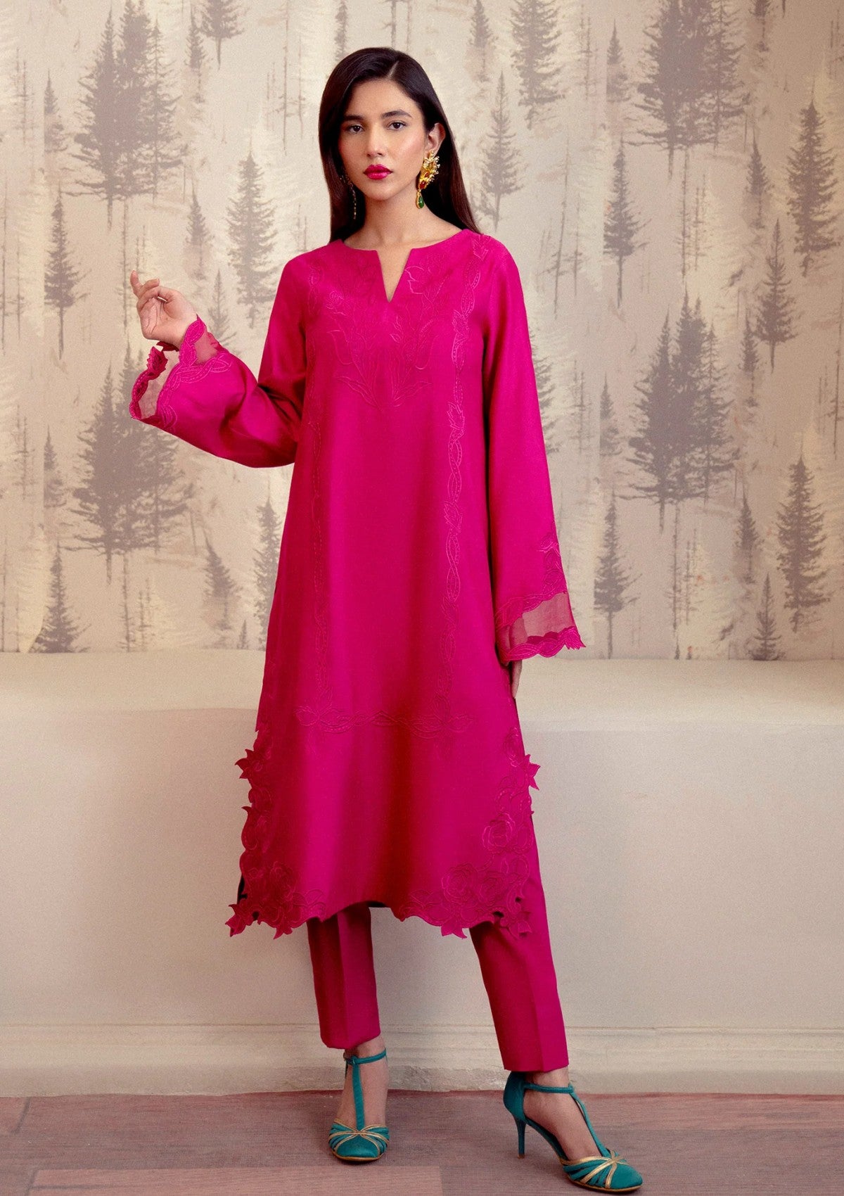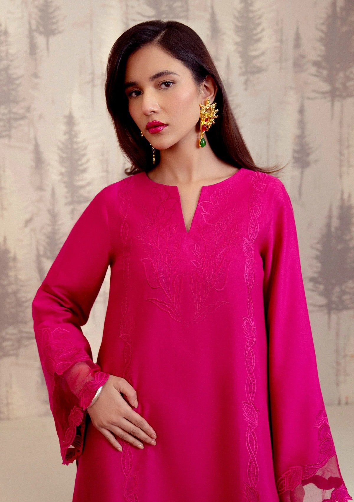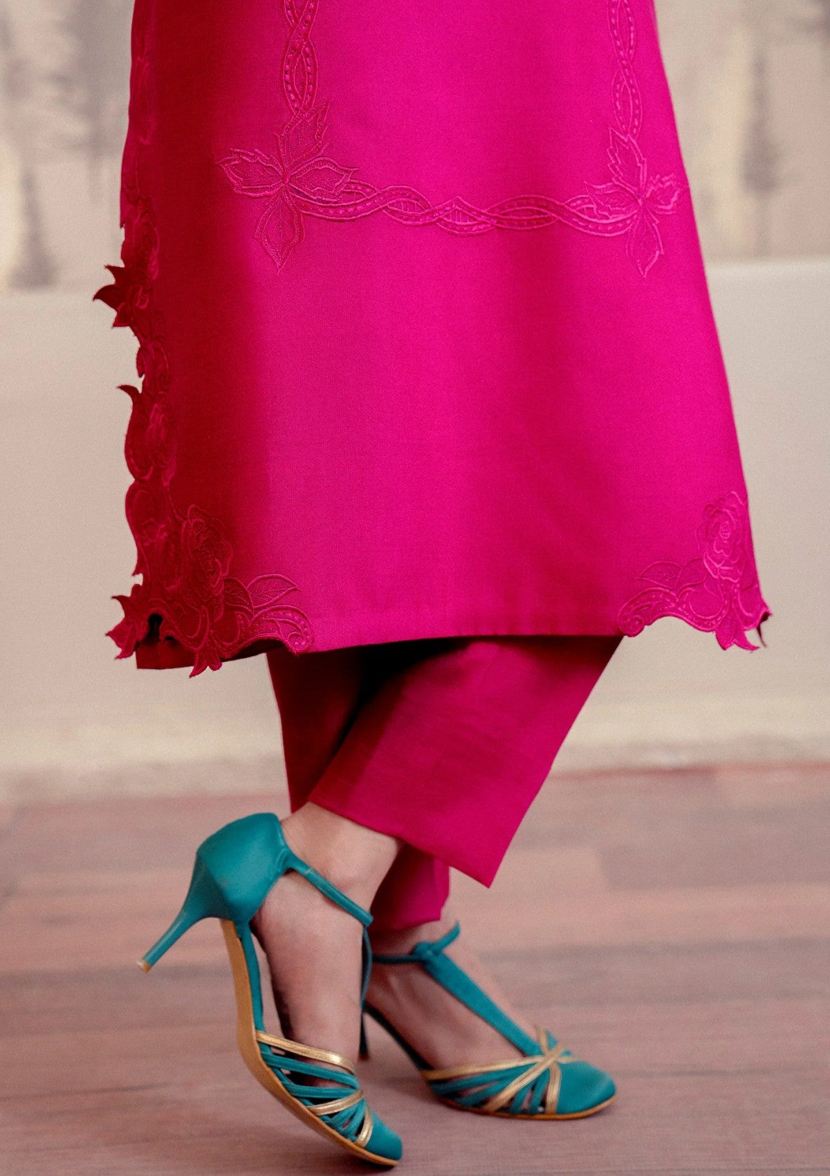Bold and beautiful, this shocking pink kurta set radiates modern style. Crafted in cotton net, the kurta is adorned with intricate botanical self-embroidery and delicate cutwork detailing along the side slits, creating a stunning texture. Organza appliqué accents on the sleeves.