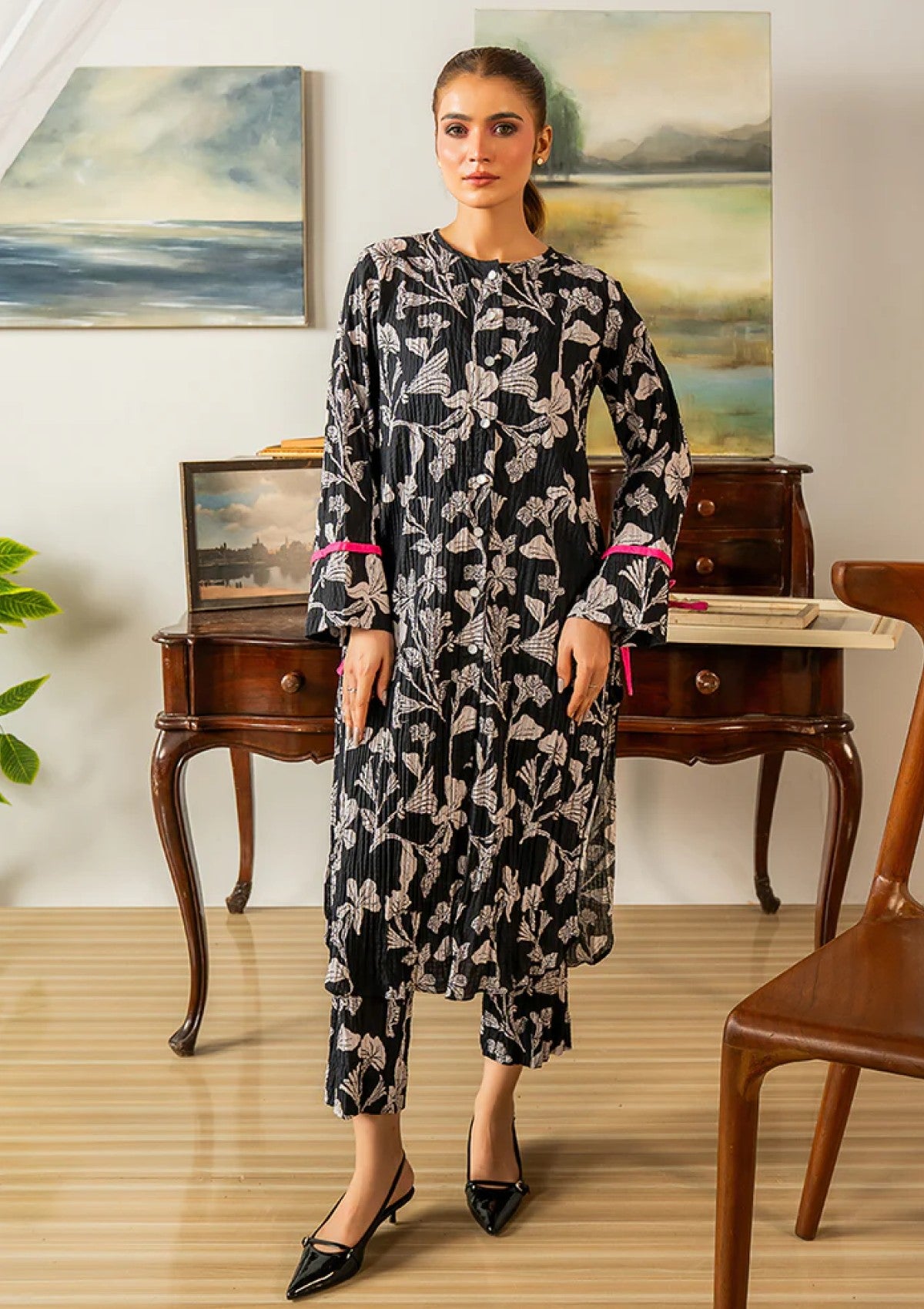 Turn heads with this black seersucker long shirt and trouser set, where breathable cotton and natural crinkle meet a touch of playful charm. Delicate pink bows grace each sleeve, creating a soft contrast against the deep black base and adding a feminine, eye-catching detail.