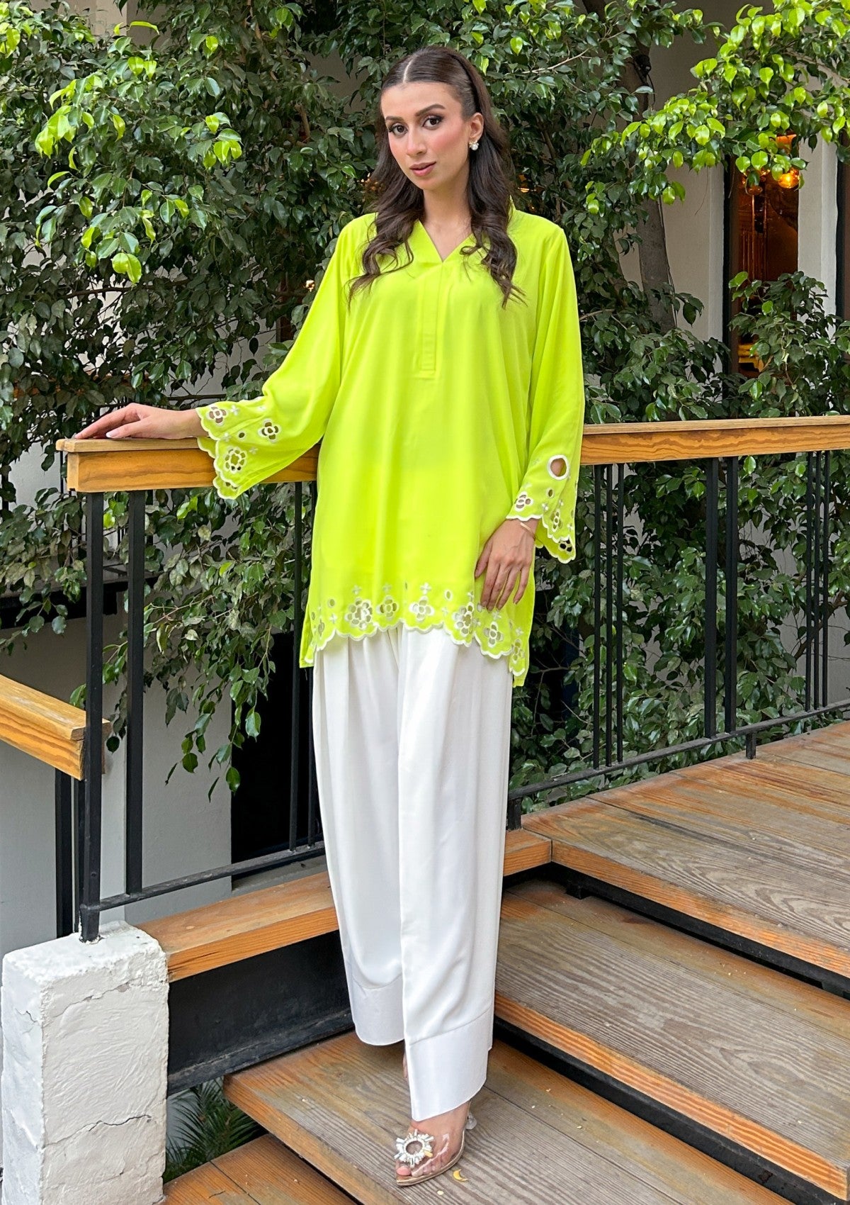 Beautiful fusion of colour combination, embroidery on short shirt with white farshi shalwar