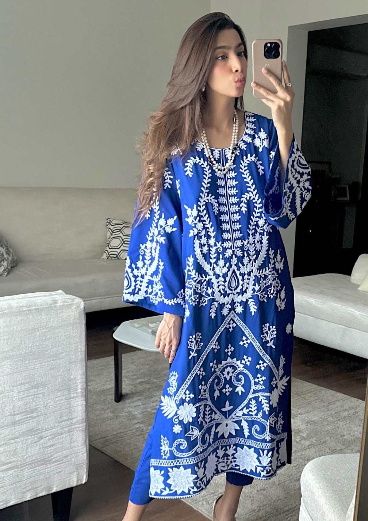 Royal Blue  Embroidered Ari Beautiful fusion of colour, embroidery on long shirt with plain pants TRIPLE GEORGETTE FABRIC