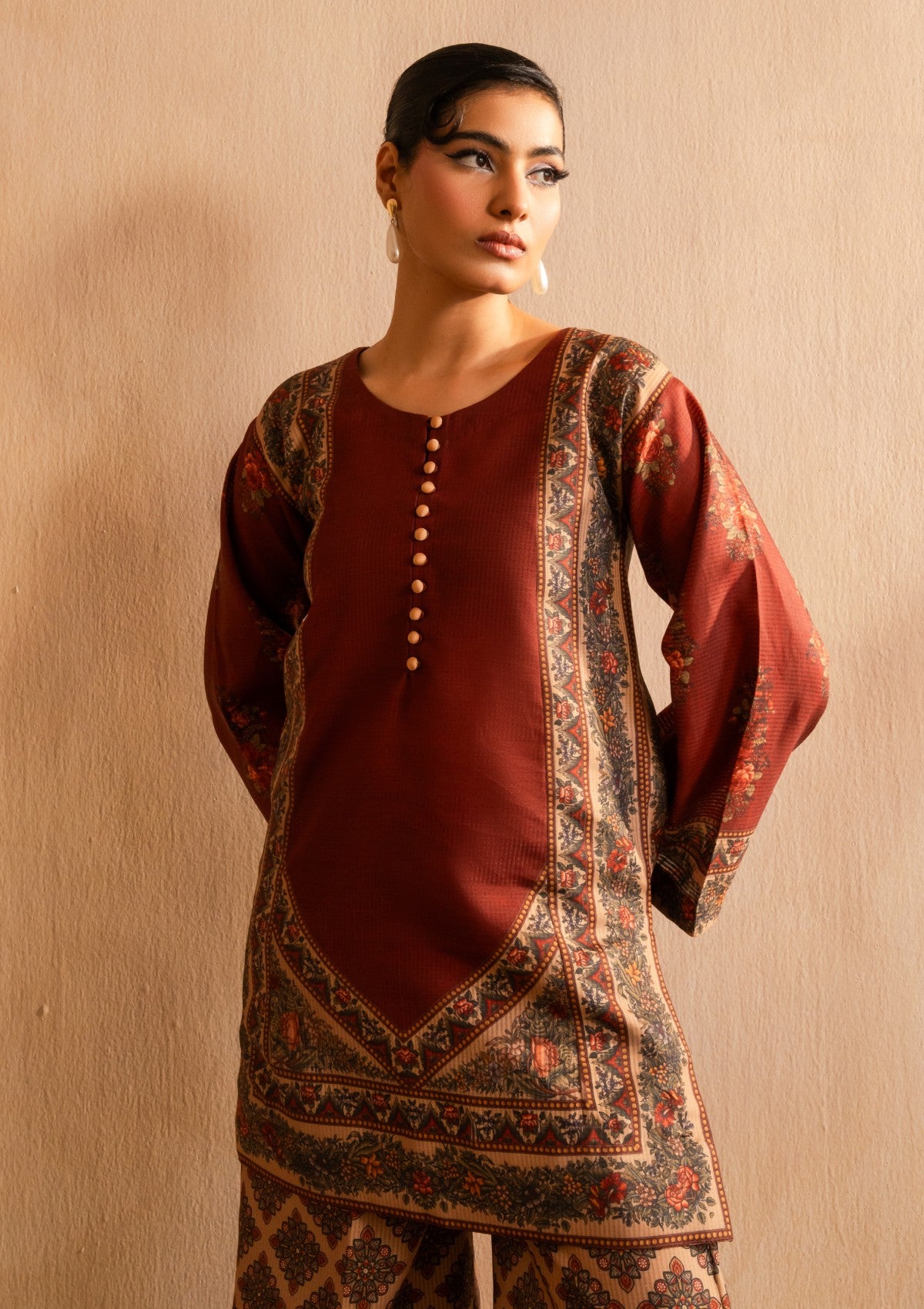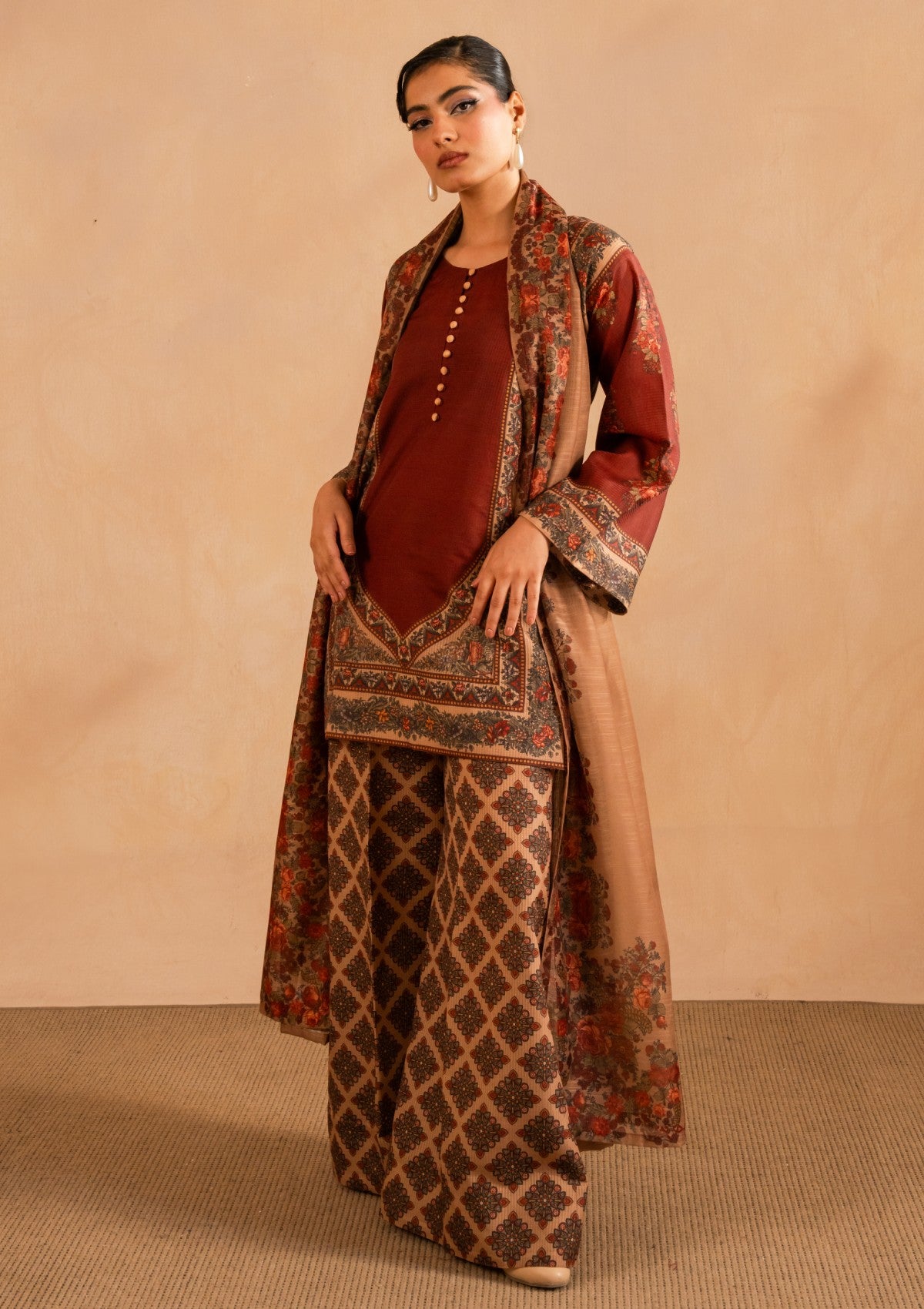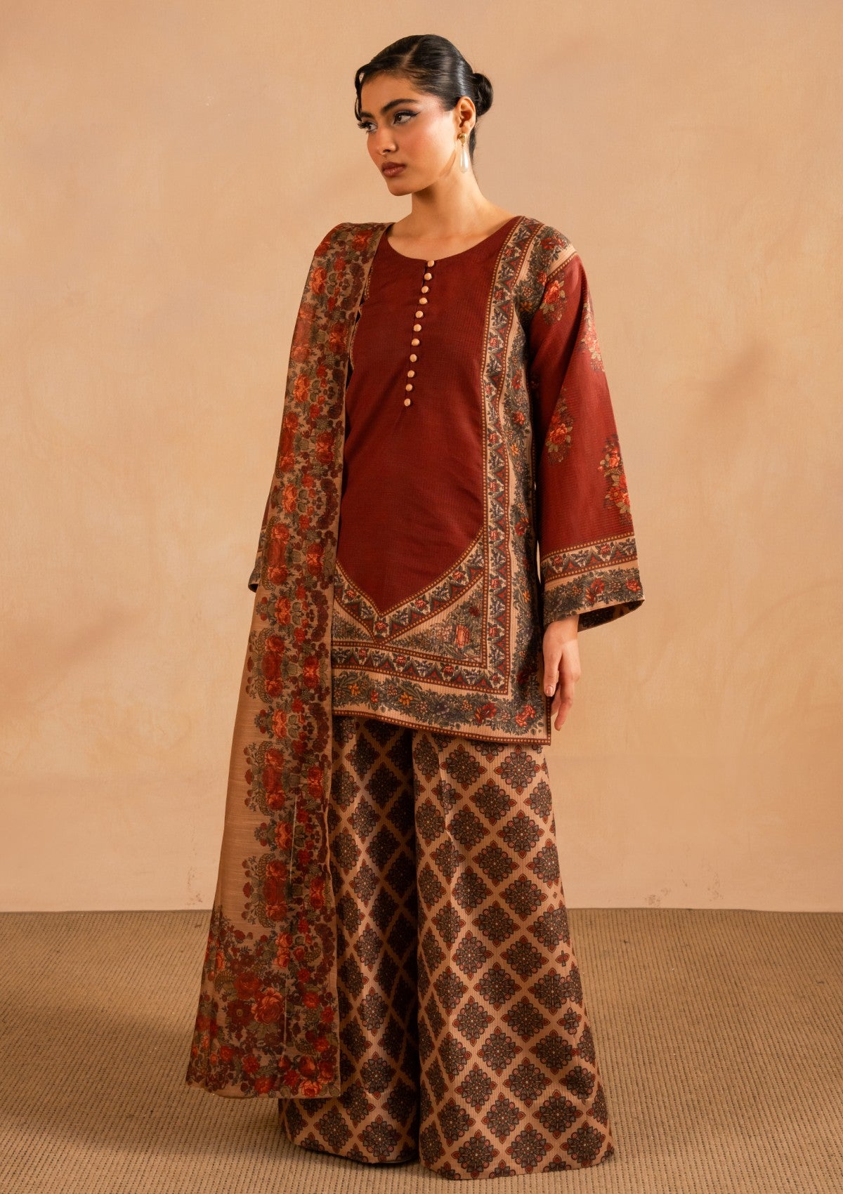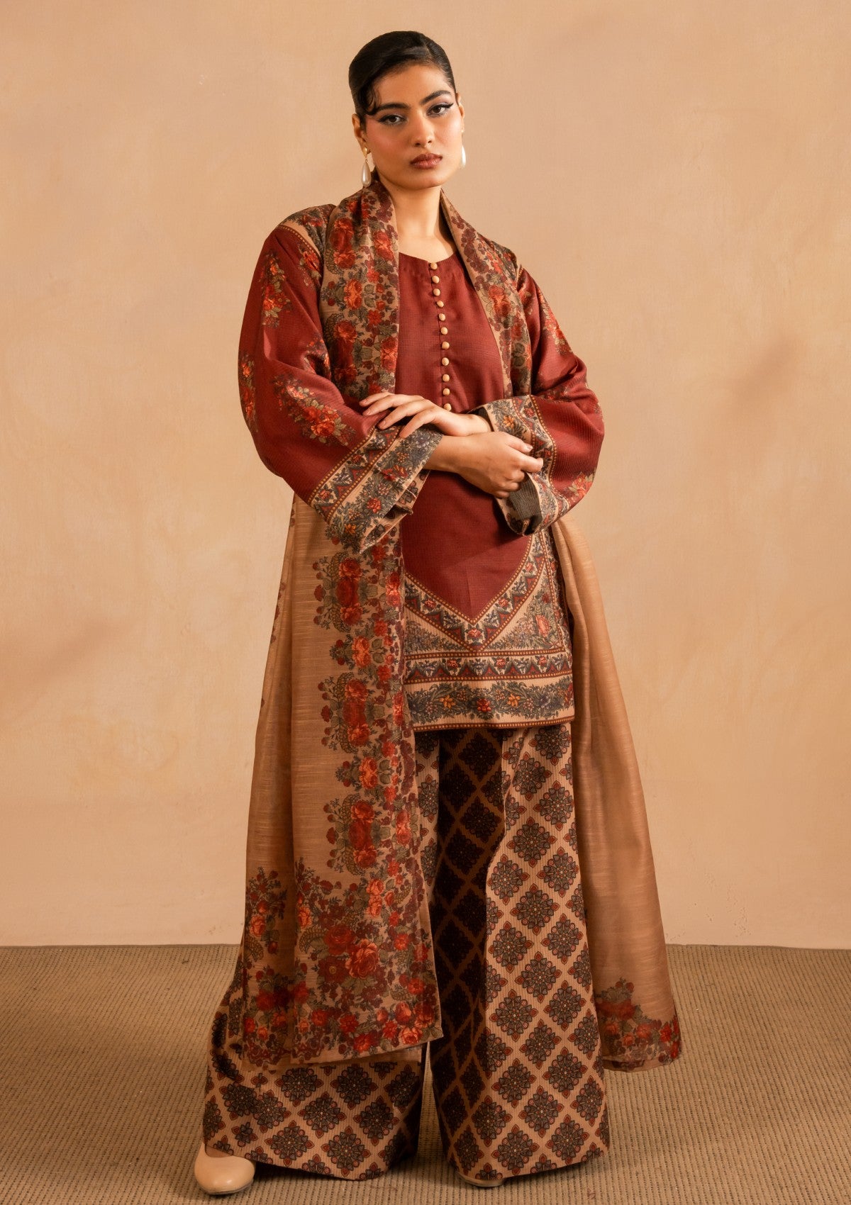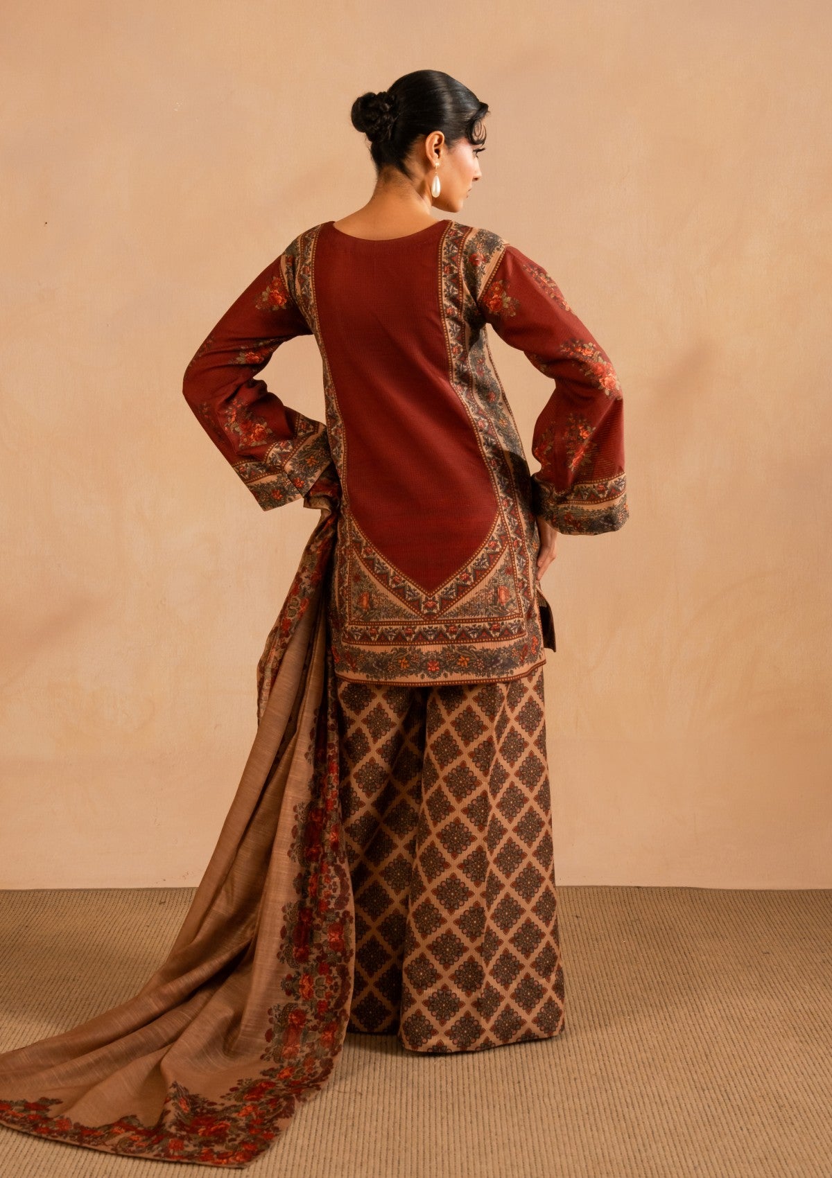 This outfit features a short maroon shirt with detailed stunning design symmetry and gold buttons, paired with flared pants in a matching palette. The look is completed with a Monark silk dupatta in earthy brown tones, adorned with intricate floral and traditional motifs print adding a luxurious finish to the outfit.