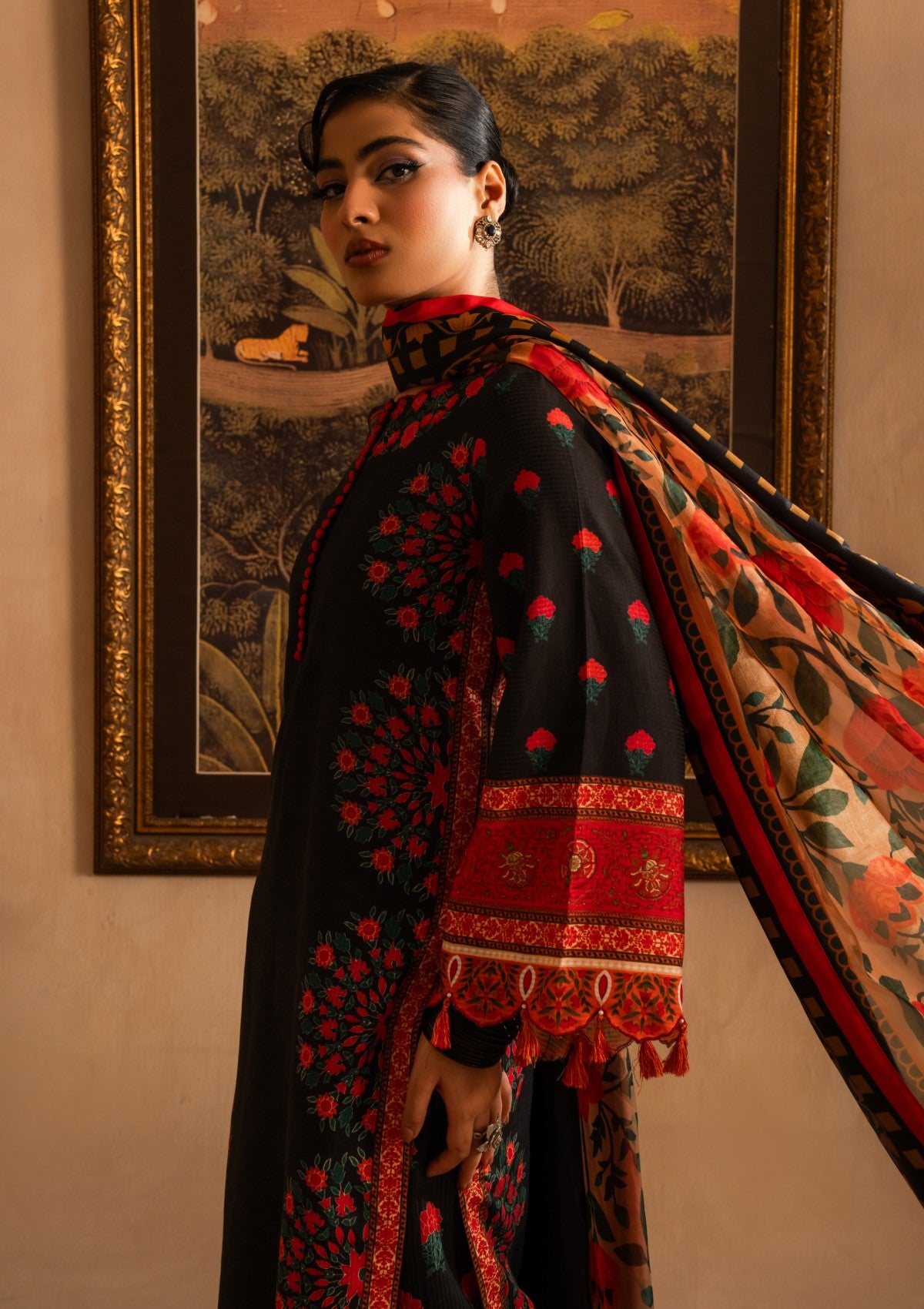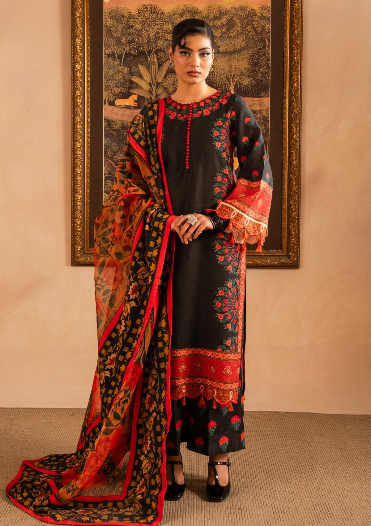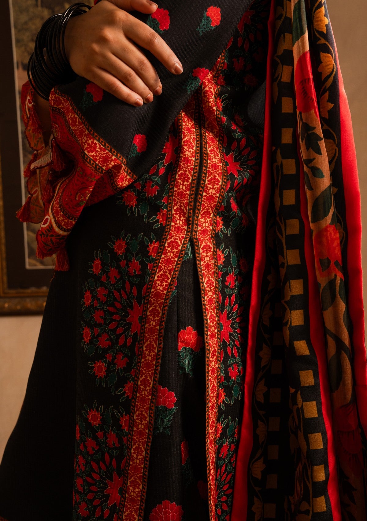 This outfit features a long black shirt with striking red and orange print, creating a bold and elegant look. It is paired with cigarette pants that echo the same rich color palette. The ensemble is completed with a Monark silk dupatta, showcasing intricate floral and traditional design.