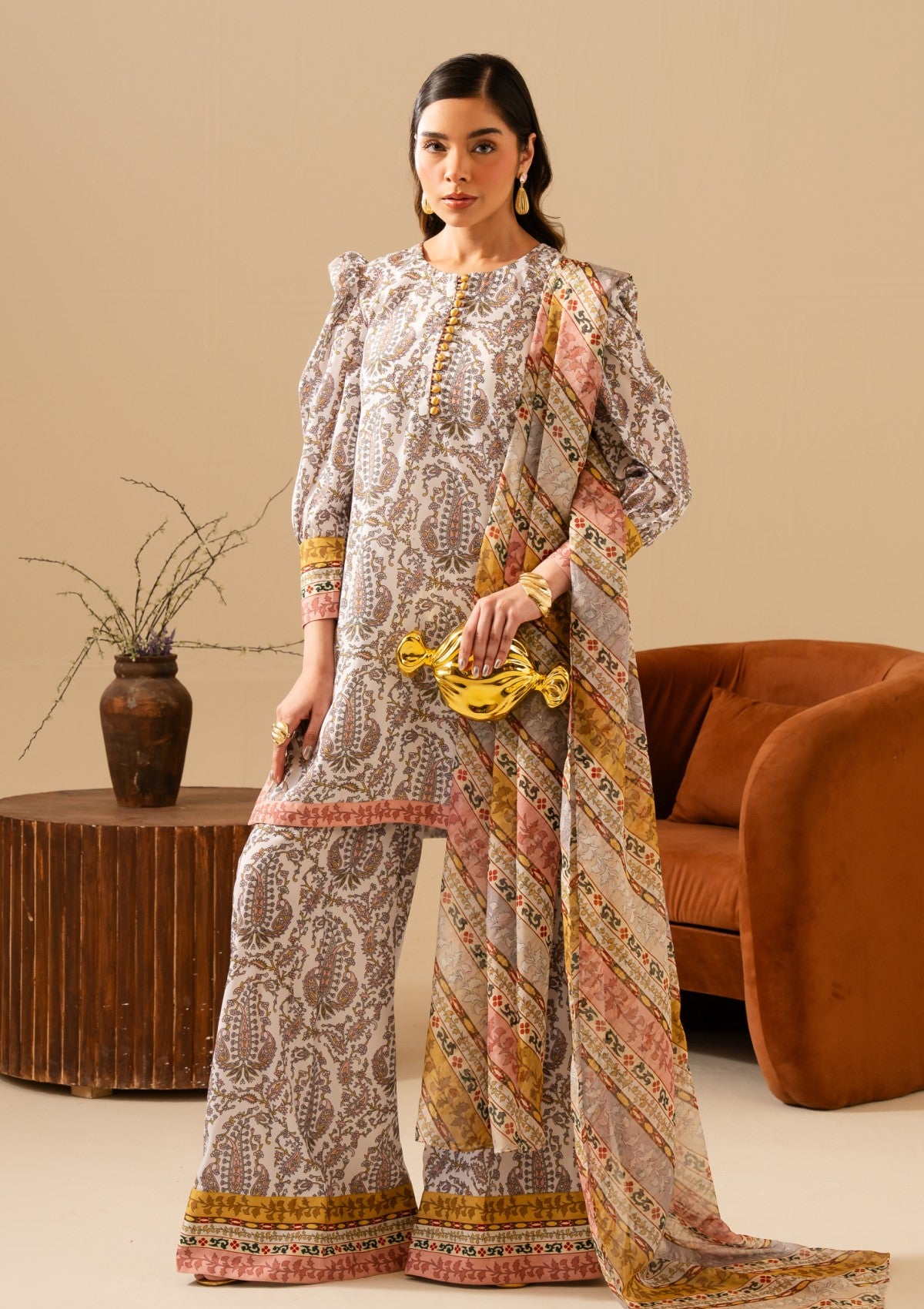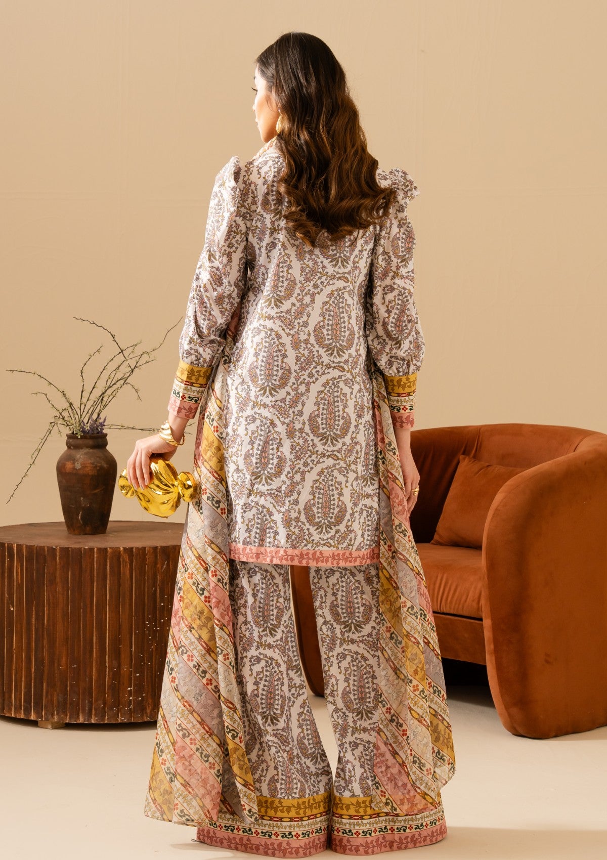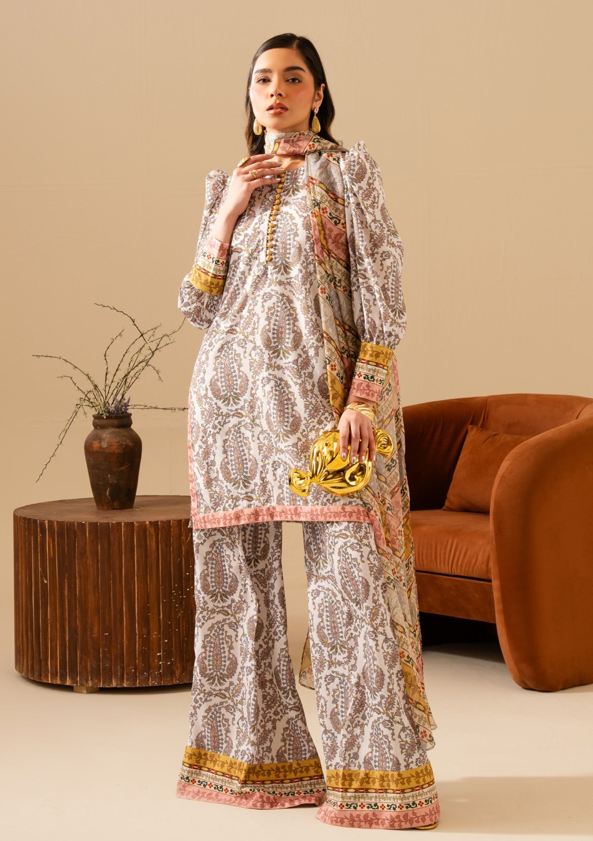 Elegant and timeless, this outfit features a delicate paisley print with soft gold and pastel accents. While the flared trousers and flowing dupatta add effortless charm. making it a perfect fusion of tradition and modernity