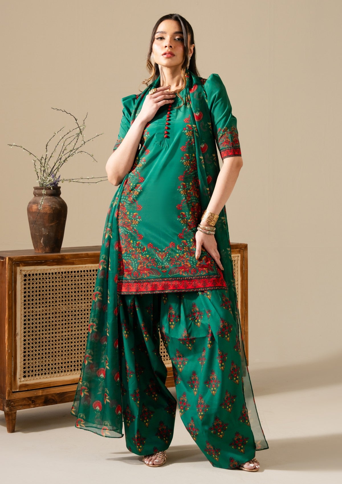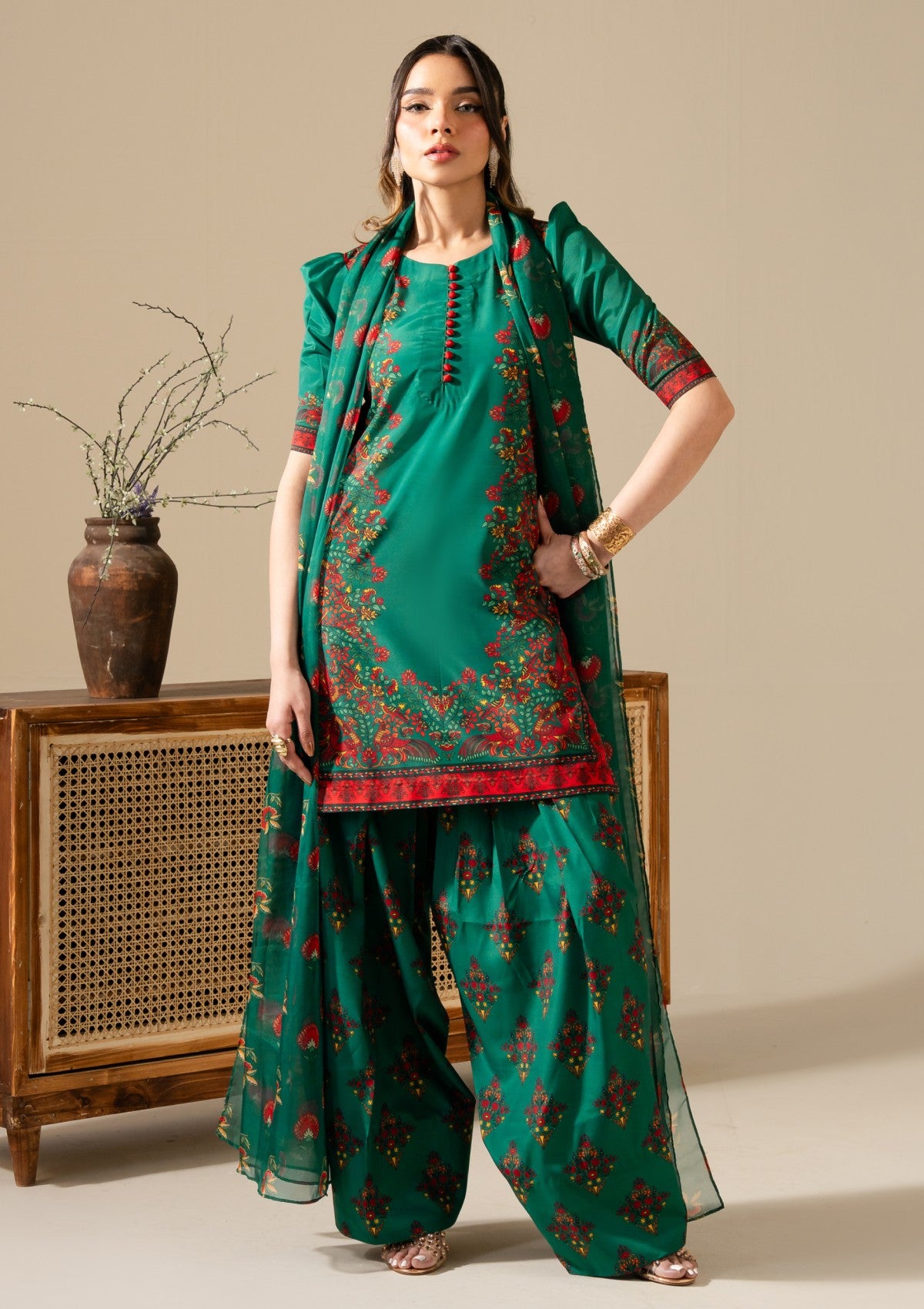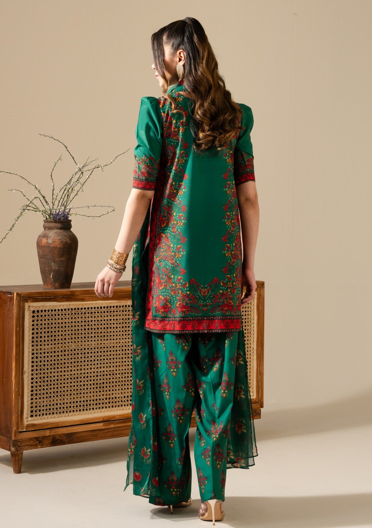 A stunning green printed outfit featuring short kameez with intricate red floral accents, paired with flowy shalwar pants for a graceful look. The delicate button details and printed dupatta add a refined touch, blending tradition with effortless elegance