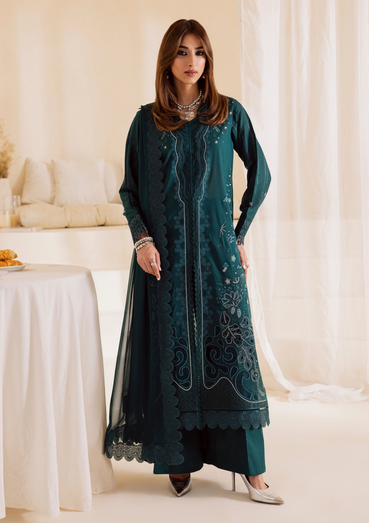 Embroidered Laser Cut Lawn Shirt Paired With Embroidered Chiffon Dupatta And Dyed Cotton Trouser