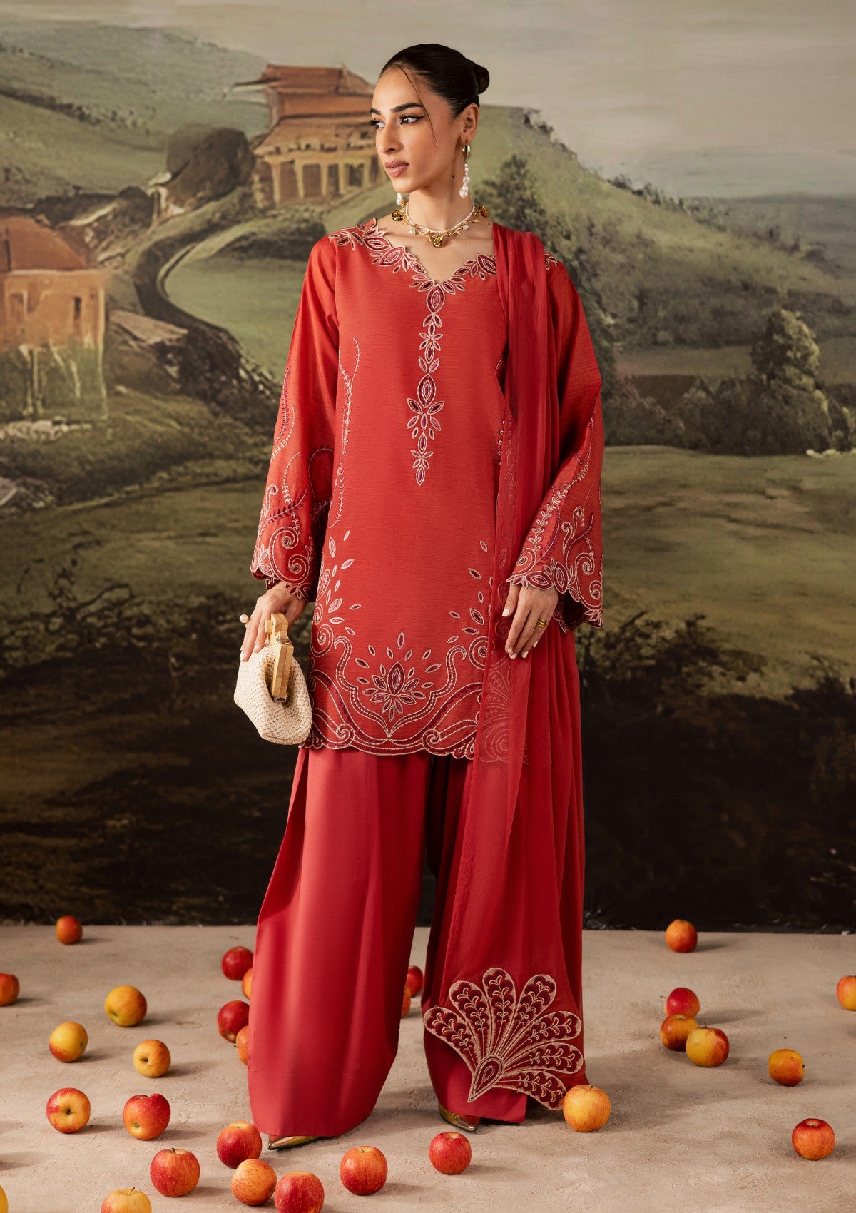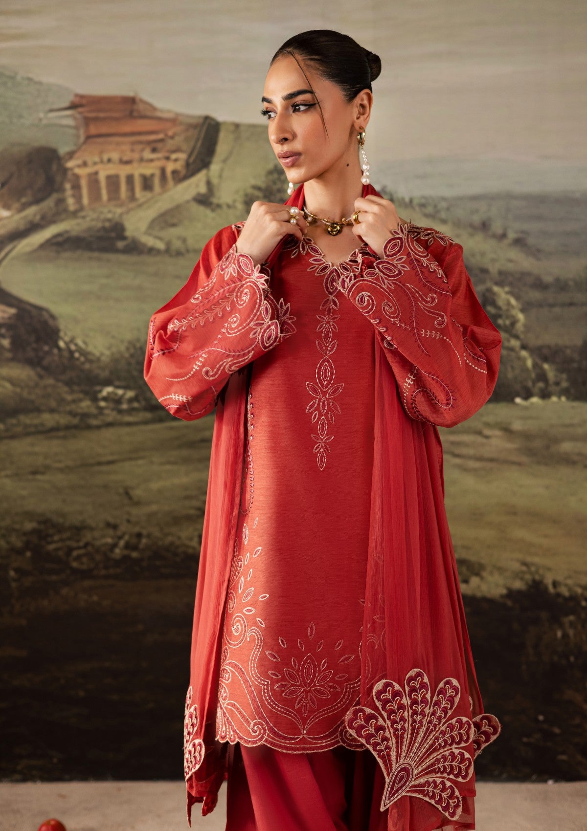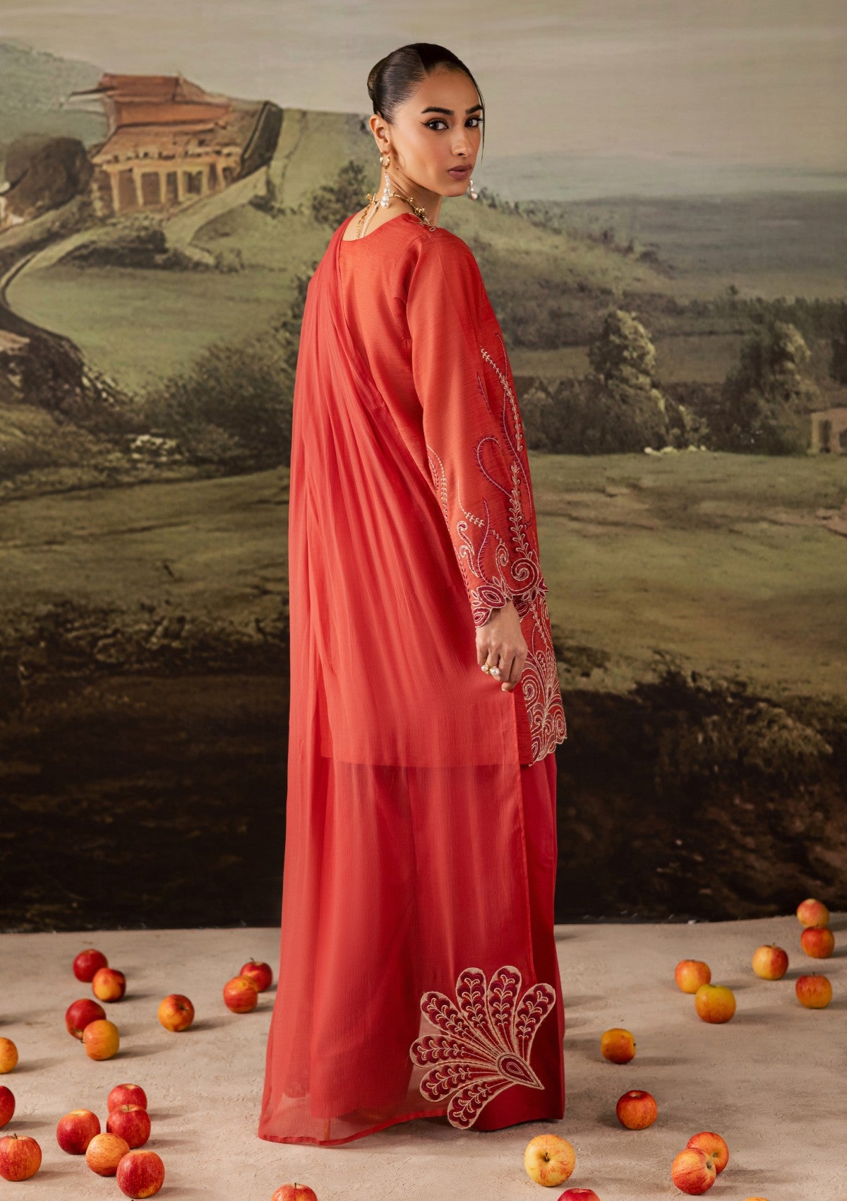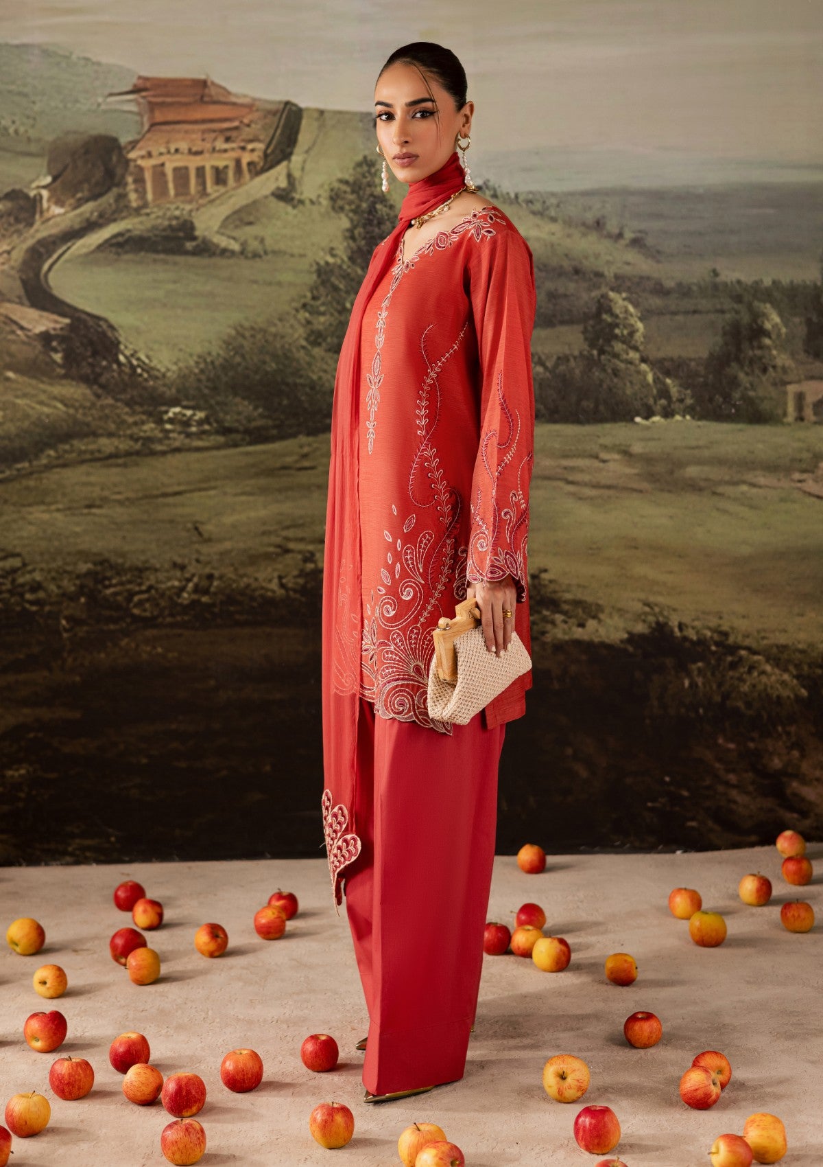 • Embroidered Paper Cotton Shirt Paired With Embroidered Chiffon Dupatta, Dyed Cotton Farshi Shalwar And Inner