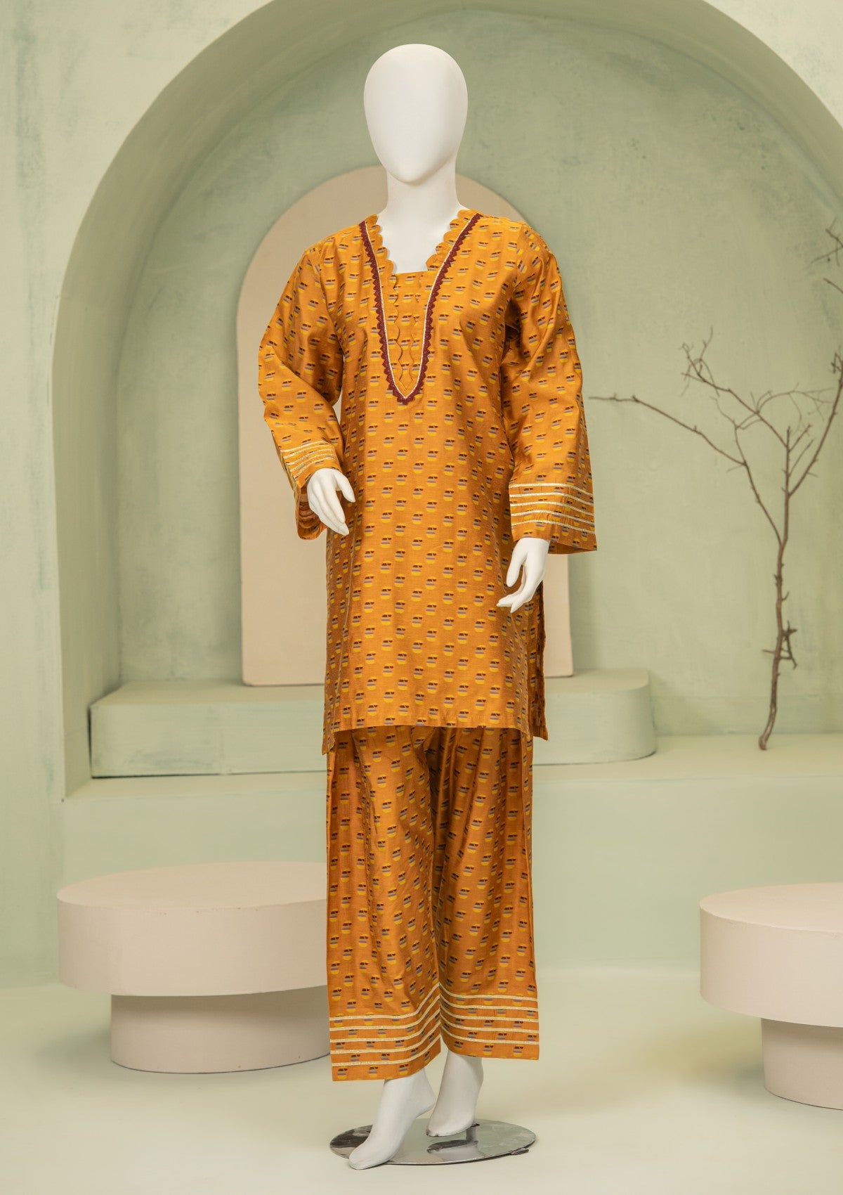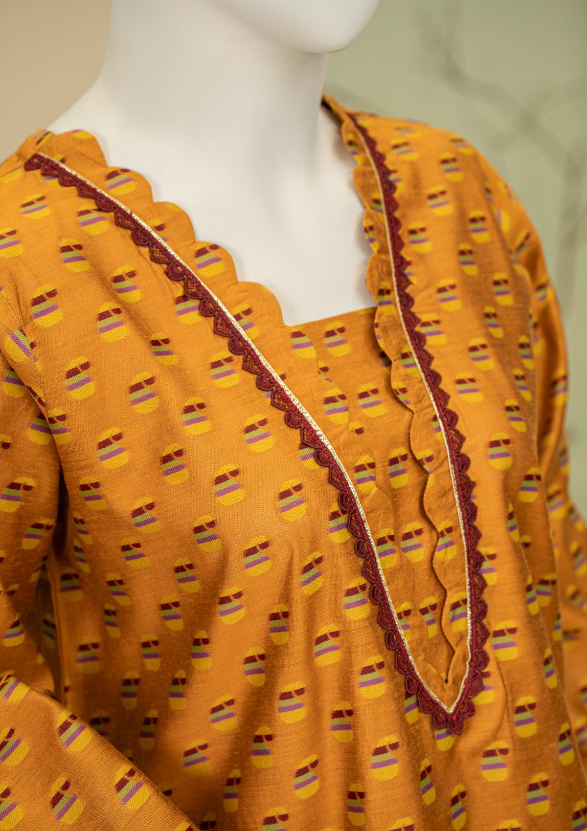 GOLDEN GLOW - A Vibrant Mustard Co-Ord Set Crafted From Soft Viscose Silk. The Kurta Features A Broad Neckline With Scalloped Detailing And Sleeves Adorned With Gotta Accents. Paired With A Matching Shalwar Enhanced With Gotta Embellishment At The Hem, This Ensemble Captures A Refined.