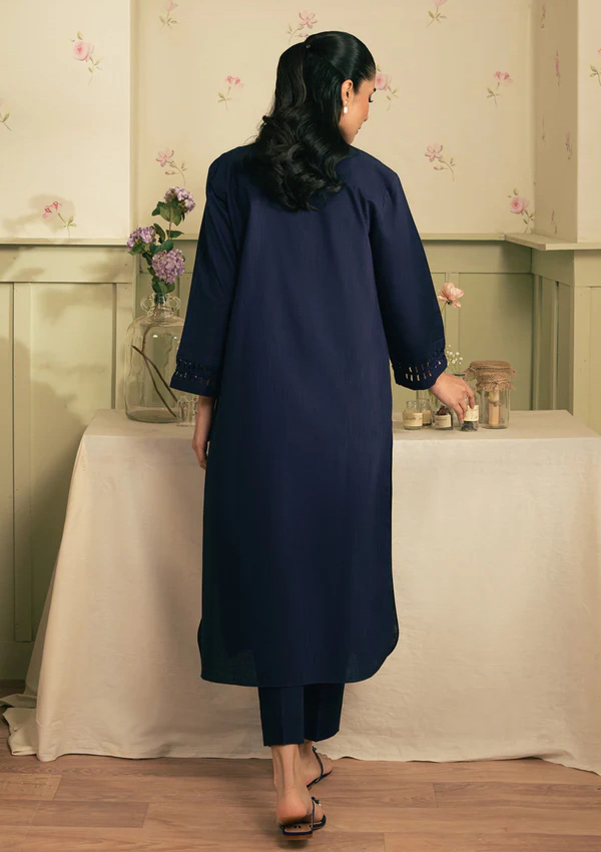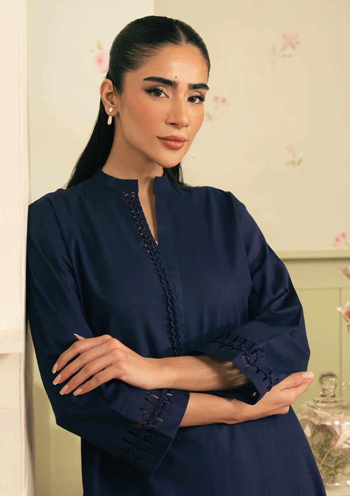 Long-length classic kurta-style shirt with a band collar and y-placket neckline, showcasing intricate fabric manipulation on the sleeves and placket, paired with straight-fit pants.