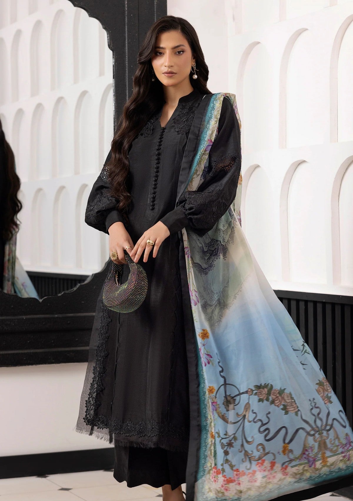 Experience modern sophistication with this A-line long black shirt, featuring button detailing on the neckline, chic styled cuffs, and a unique front scarf design decorated with crystals for a signature touch. Paired with a printed dupatta and sleek trousers, this look stands out with its bold yet elegant aura.