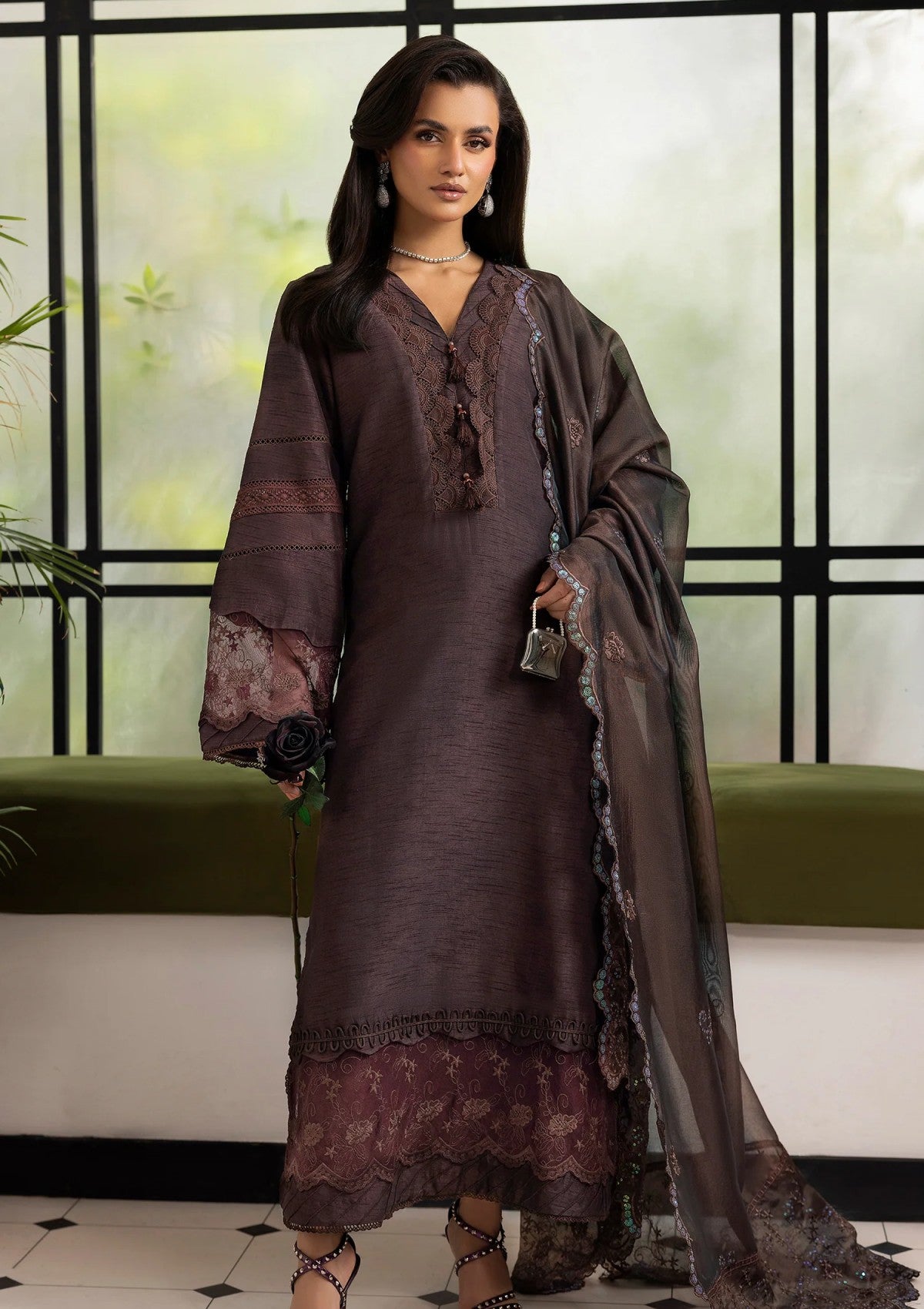 Elegance meets tradition in this long-length brown raw silk shirt, adorned with stylish lace finishing and a gracefully crafted neckline detailed with delicate tassel embellishments for a luxurious touch. The design is enhanced with embroidered net lace on the front hem and beautiful lace detailing on the sleeve openings, giving the outfit a refined and well-finished look. Paired with an organza dupatta beautifully enriched with sequence embroidery and pallu work, this ensemble offers a perfect blend of sophistication and festive charm.