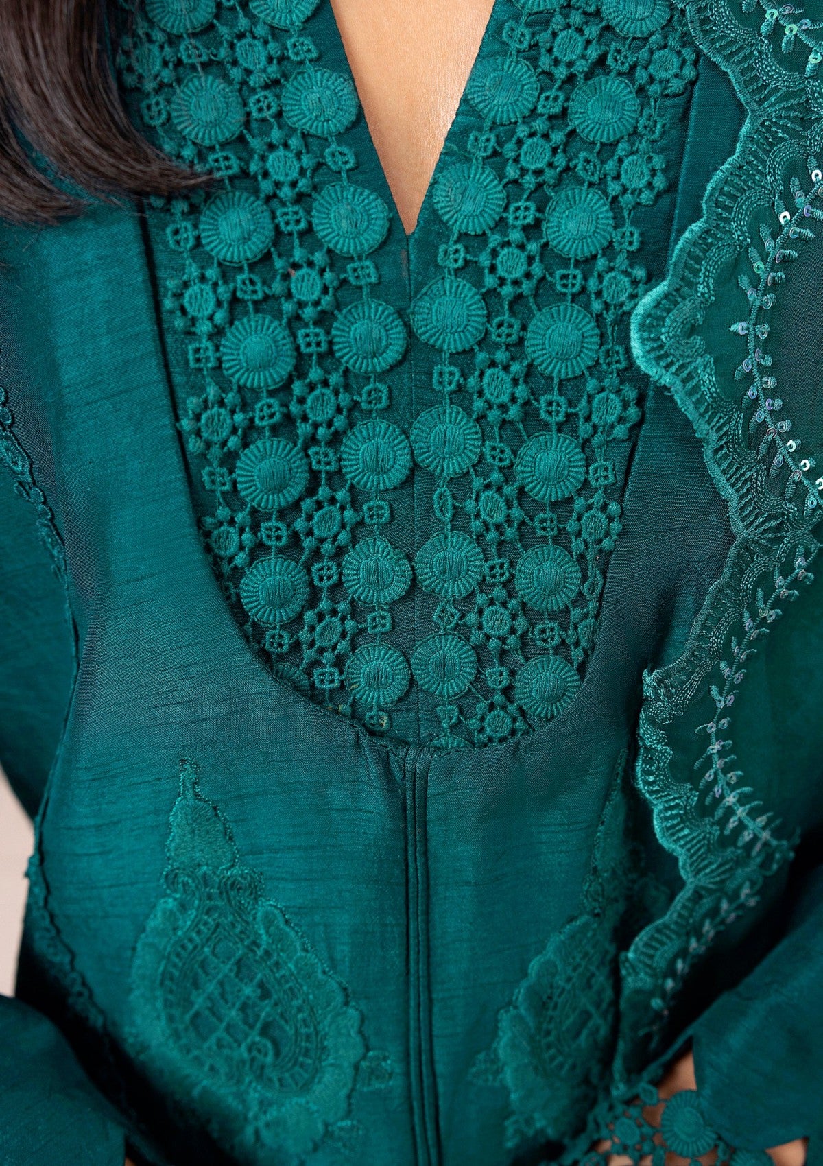 An ultra-luxurious long-length Zinc Raw silk shirt, designed in a gown-style cut and adorned with heavy lace detailing and an elegant neckline. Paired with a organza dupatta beautifully enhanced with sequence embroidery featuring pallu work, this outfit reflects sophistication in every stitch.
