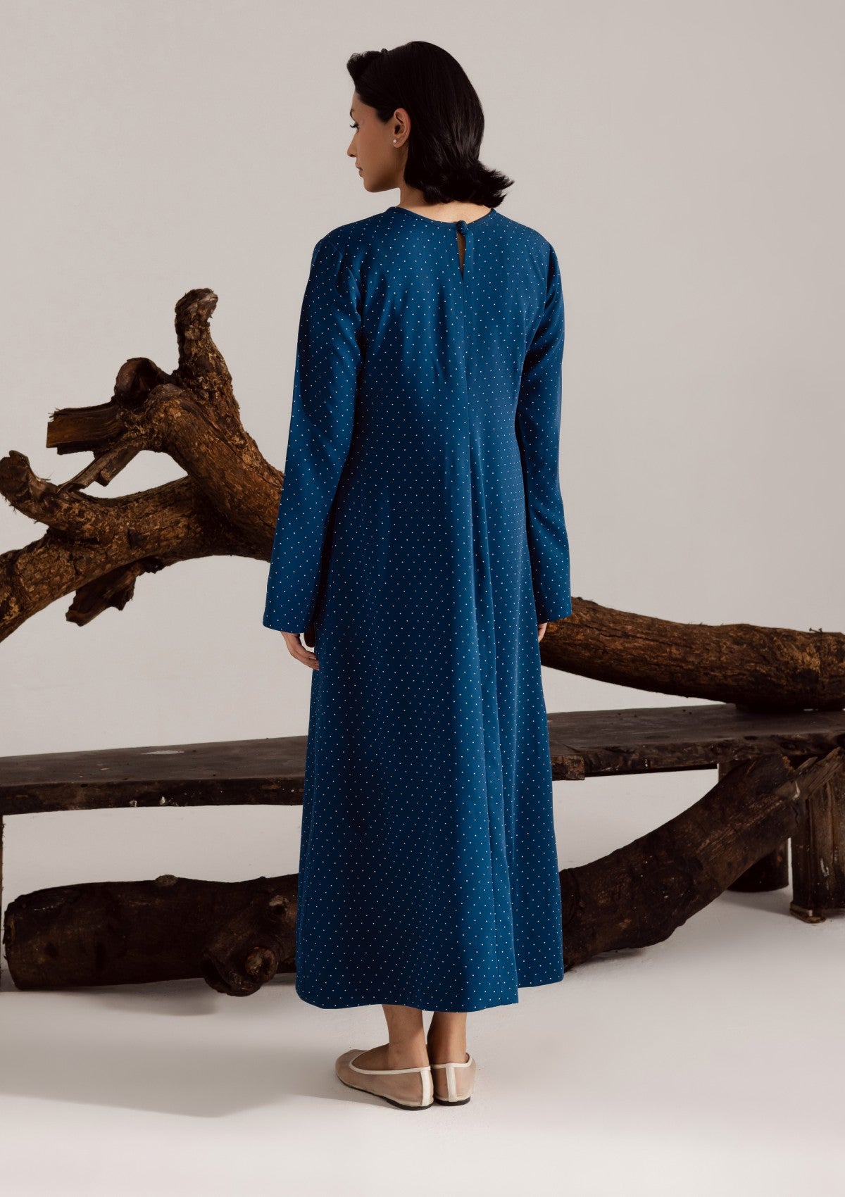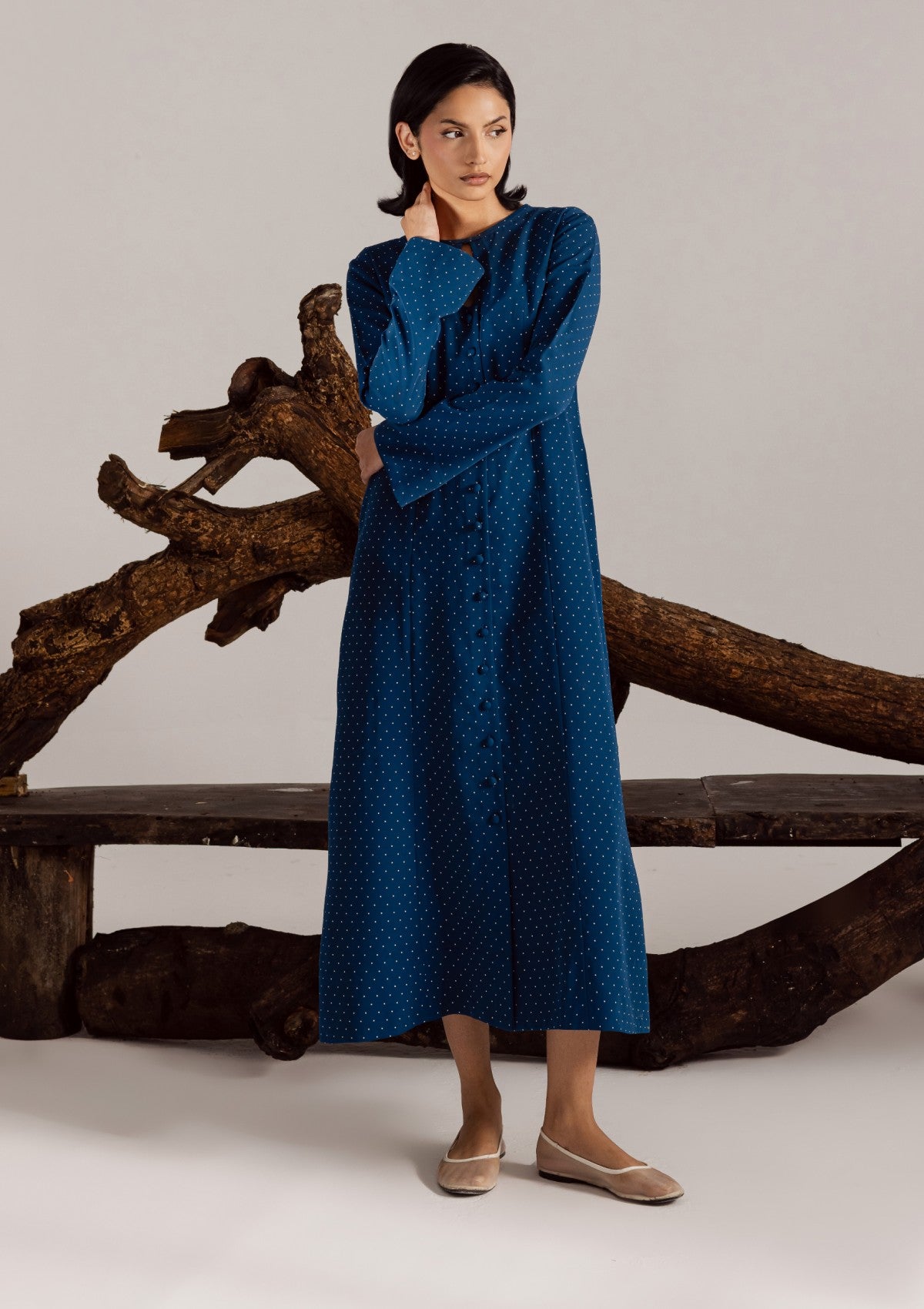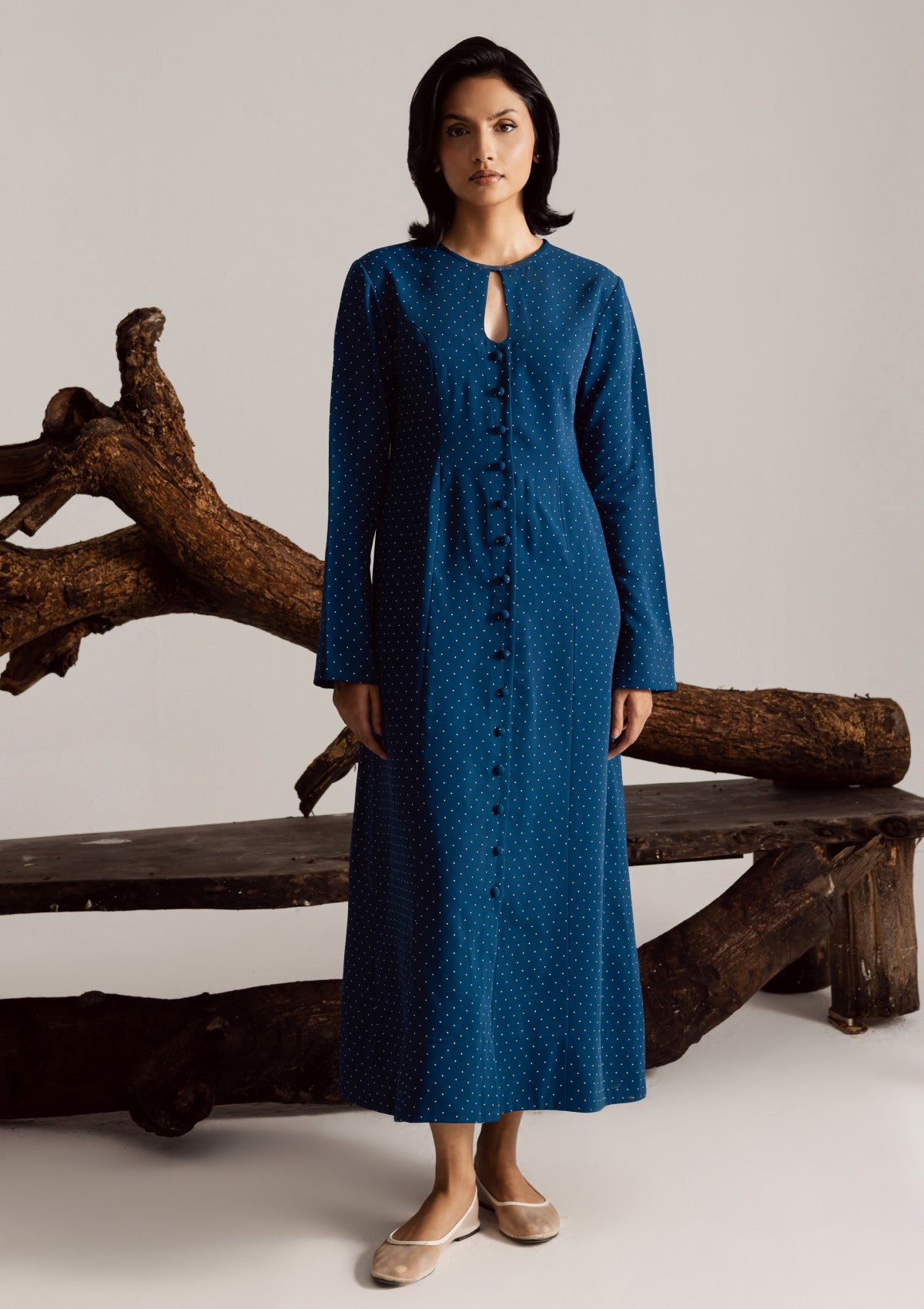 Chic blue long dress in georgette, detailed with subtle polka dots, front button-down style, and a keyhole neckline for a refined, graceful look