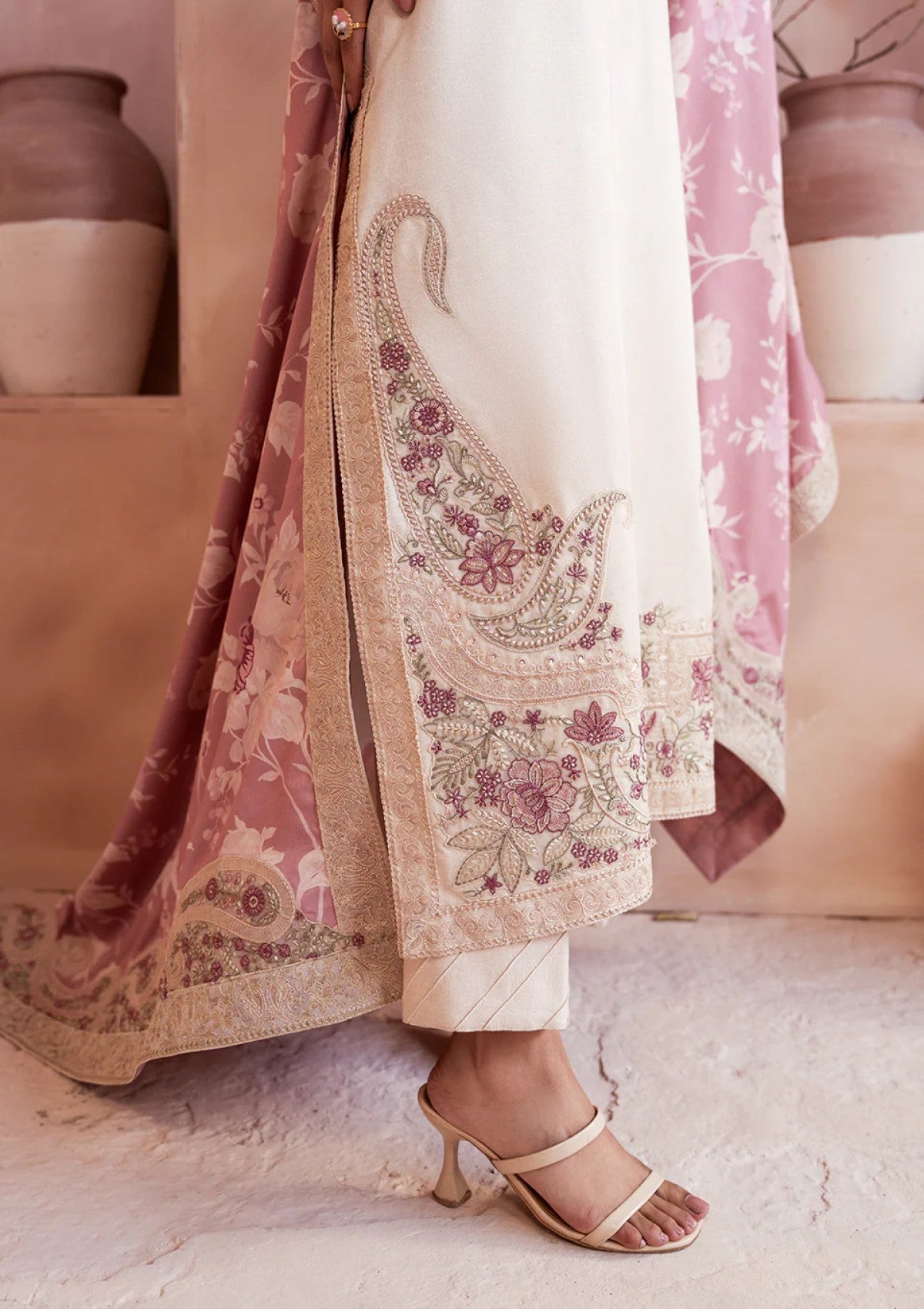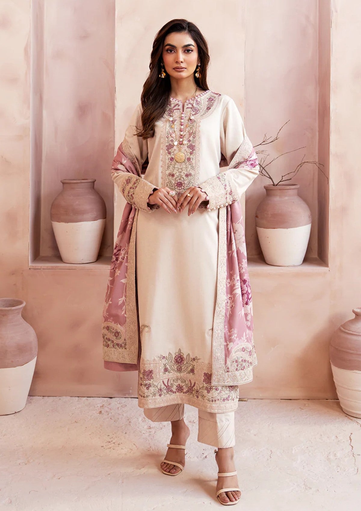 Rendered in soft ivory–beige silk karandi, this ensemble embodies quiet luxury with its fluid drape and winter-weight texture. The shirt features Kashmiri-inspired embroidery, where paisleys and floral elements unfold in blush pink, ivory, and sage. Embroidery frames the neckline, sleeves, and hemline, adding depth while maintaining the outfit’s serene palette. Delicate loop-stitch detailing enhances the silhouette with a refined, handcrafted finish. Paired with tonal pleated pants, the look remains balanced and minimal. A contrasting digital printed shawl, washed in soft florals and bordered with embroidery, completes the outfit with a painterly, heritage-inspired touch.