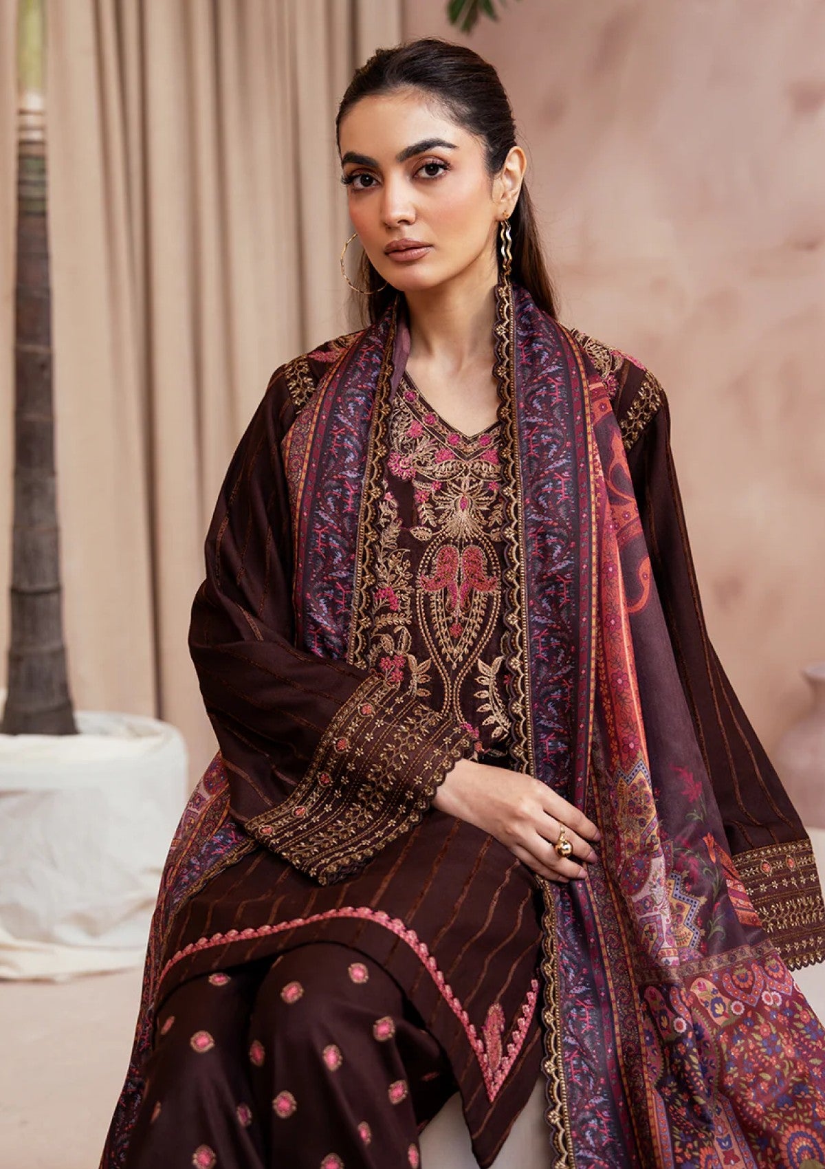 VELVET EMBER is a luxurious deep chocolate velvet-karandi winter suit, crafted for women who love elegant festive fashion. The rich velvet canvas is adorned with Kashmiri-inspired embroidery, framing the neckline with sculpted strokes of burnt orange, fuchsia pink, and soft green. The contrast of color on the dark base creates controlled vibrancy and an artisanal, statement look. The trousers are detailed with delicate dotted embroidery, adding fine texture and harmony to the silhouette. Completing the ensemble is a kalamkar-inspired digital printed shawl, featuring intricate borders and heritage motifs that introduce movement, pattern, and refined drama. Warm, moody, and impeccably crafted, this three-piece winter outfit combines velvet luxury, artisanal embroidery, and festive charm perfect for winter dinners, seasonal gatherings, and evening wear.