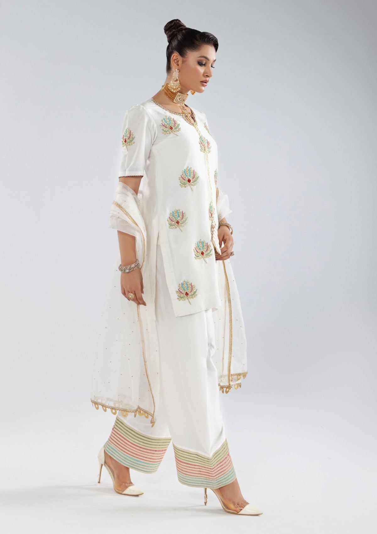 Ice white, shirt with shalwar adorned with traditional flower motifs on the front shirt and sequence embroidery on the neckline along with the half puff sleeves, delicately accented with adda work, exudes understated elegance. The look is completed with an organza dupatta.