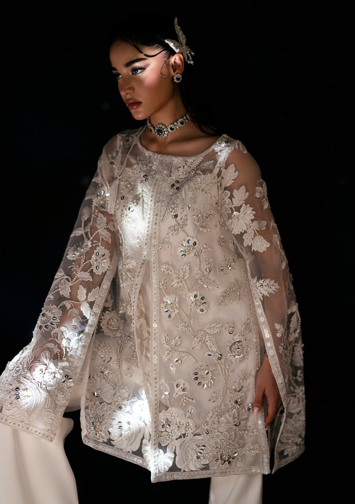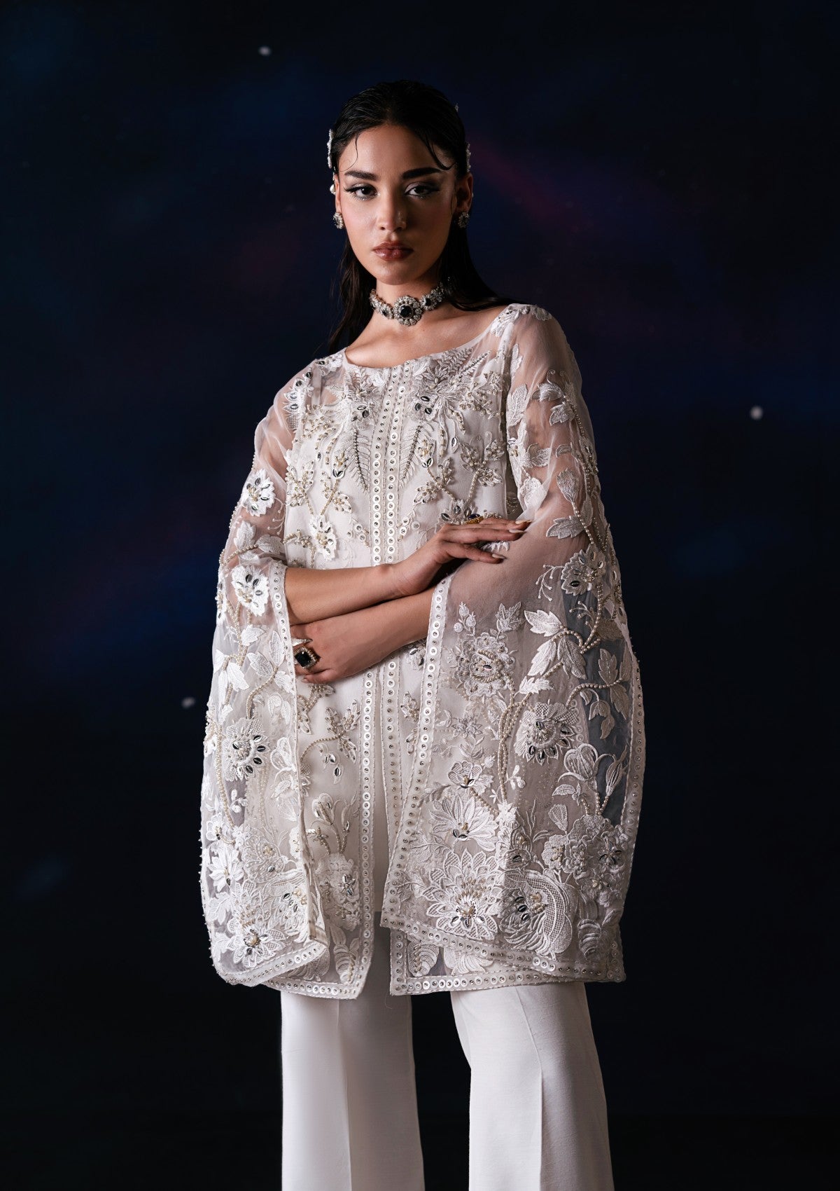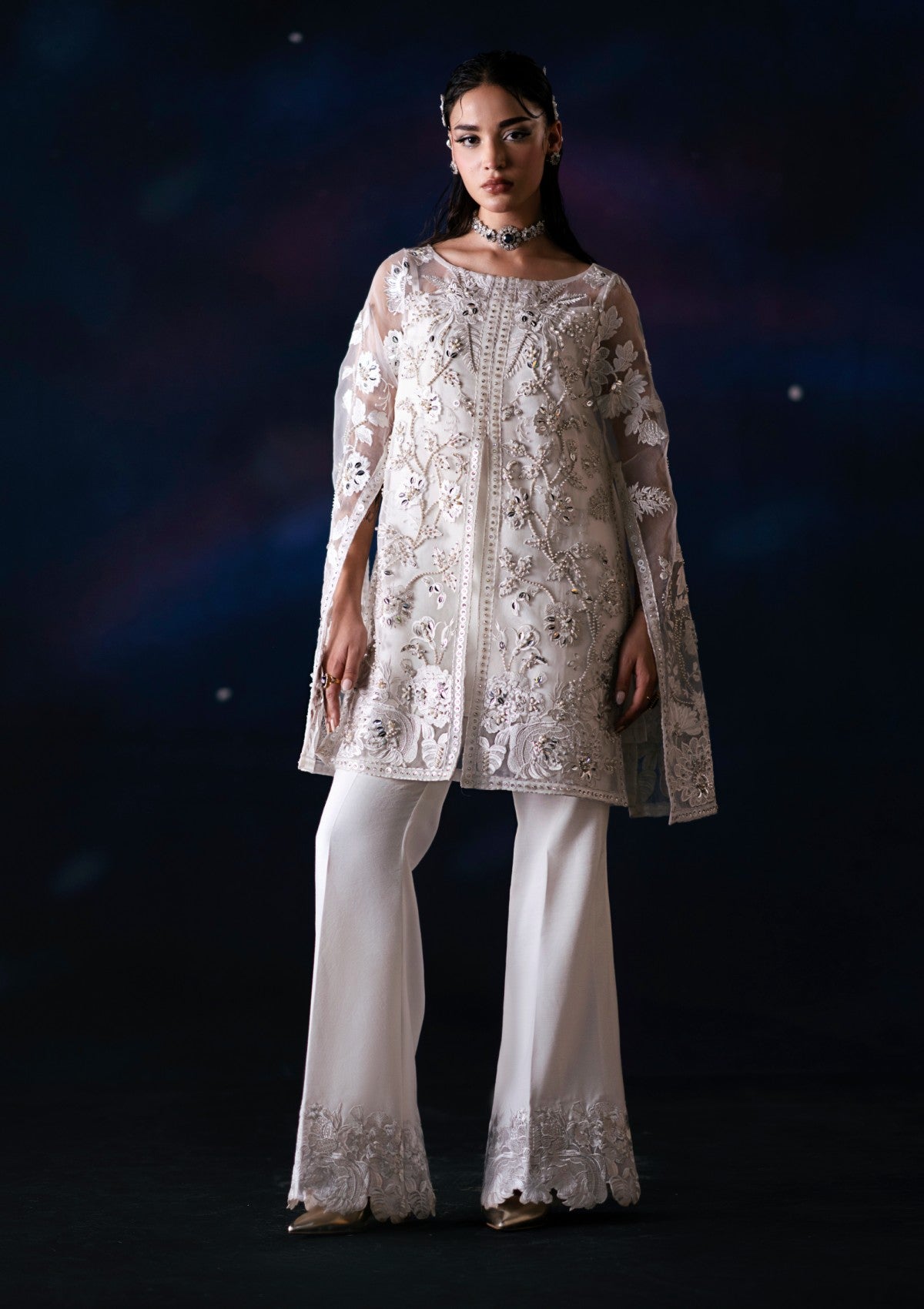 This ethereal white ensemble features a short cape sleeve shirt with detailed work bell sleeves, crafted from sheer organza. The shirt is adorned with floral embroidery and delicate embellishments, creating a luxurious and refined look. Complementing the top, the boot cut pants are detailed with embroidered bottoms, merging sophisticated craftsmanship with modern elegance.