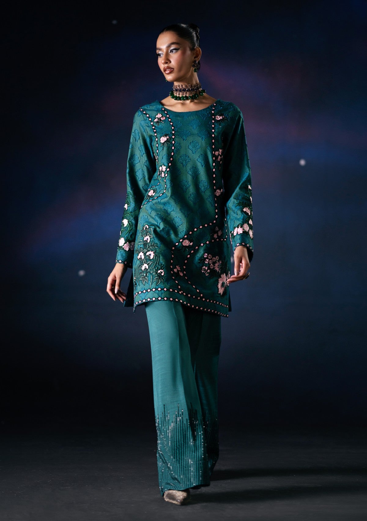 This green ensemble features a textured cotton net shirt with lavish embroidery and embellishments, The straight sleeves are similarly embellished, offering a cohesive design statement. The boot cut pants in luxurious Pakistani raw silk are finished with a meticulously applied elegant stone lines at the hem, merging artisanal refinement with modern sophistication.