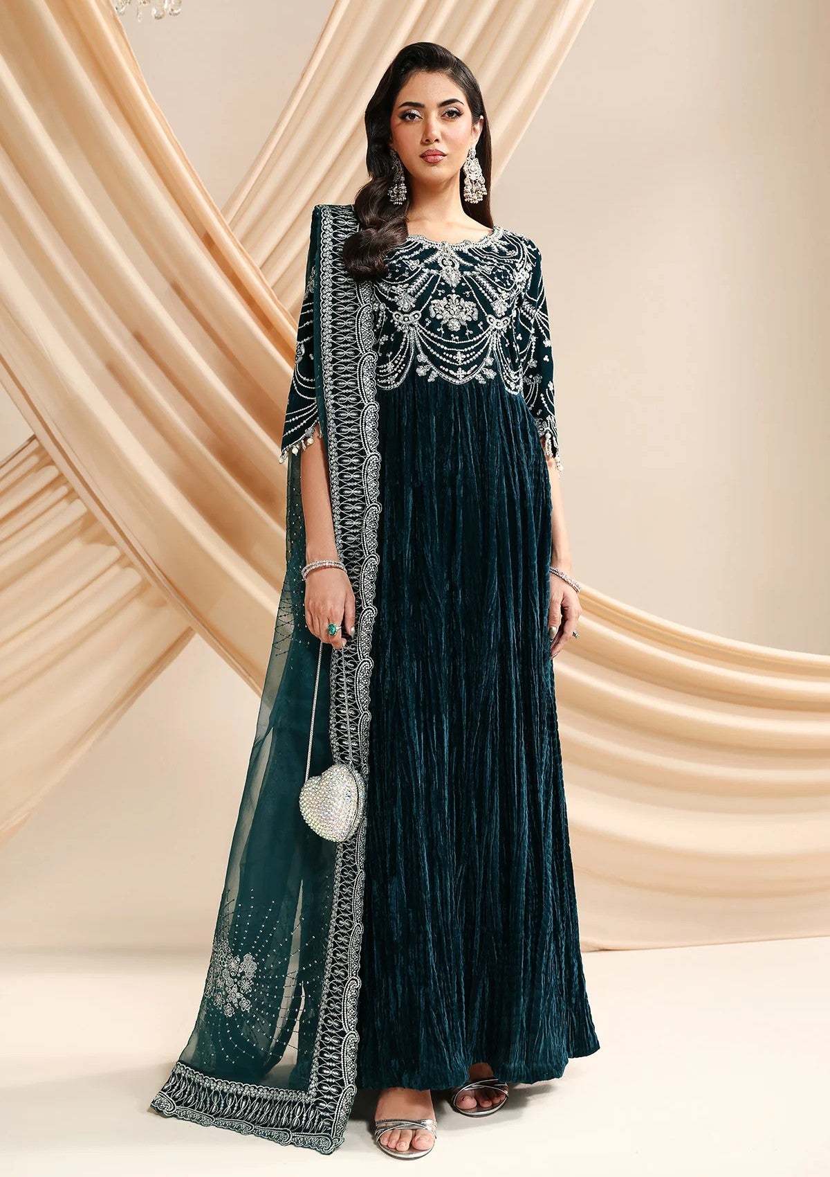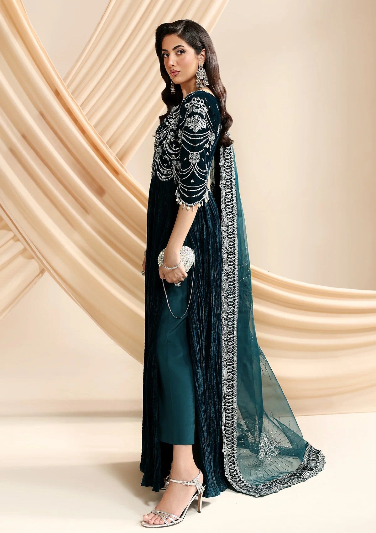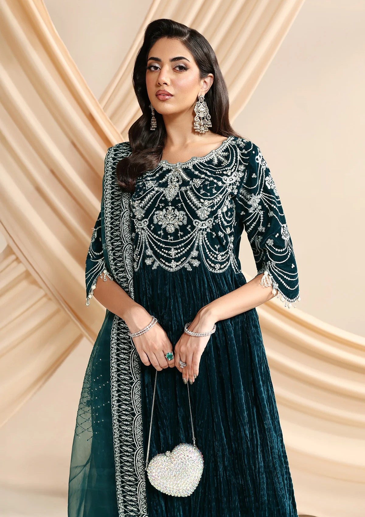 Rendered in a deep teal hue, this ensemble features a hand-embellished front yoke on velvet with detailed embroidery and handmade work. The design is paired with a dyed crush velvet front and a dyed Russian silk trouser, complemented by an embroidered organza dupatta framed with intricate borders. The long flared silhouette lends a refined and elegant finish to the outfit.
