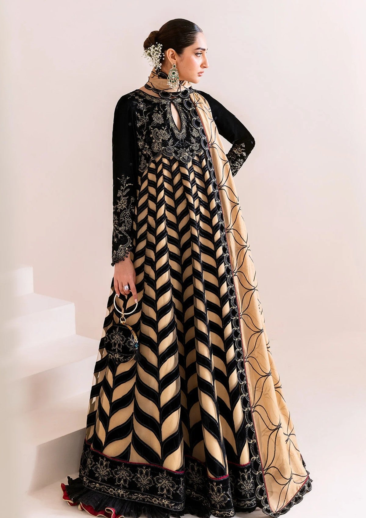A captivating kalidaar peshwas in onyx black and muted champagne gold, featuring a velvet bodice intricately adorned with threadwork and a handcrafted organza neckline. The voluminous flare showcases an artful chevron pattern that adds movement and grace, complemented by an embroidered silk dupatta finished with scalloped borders and tassel details