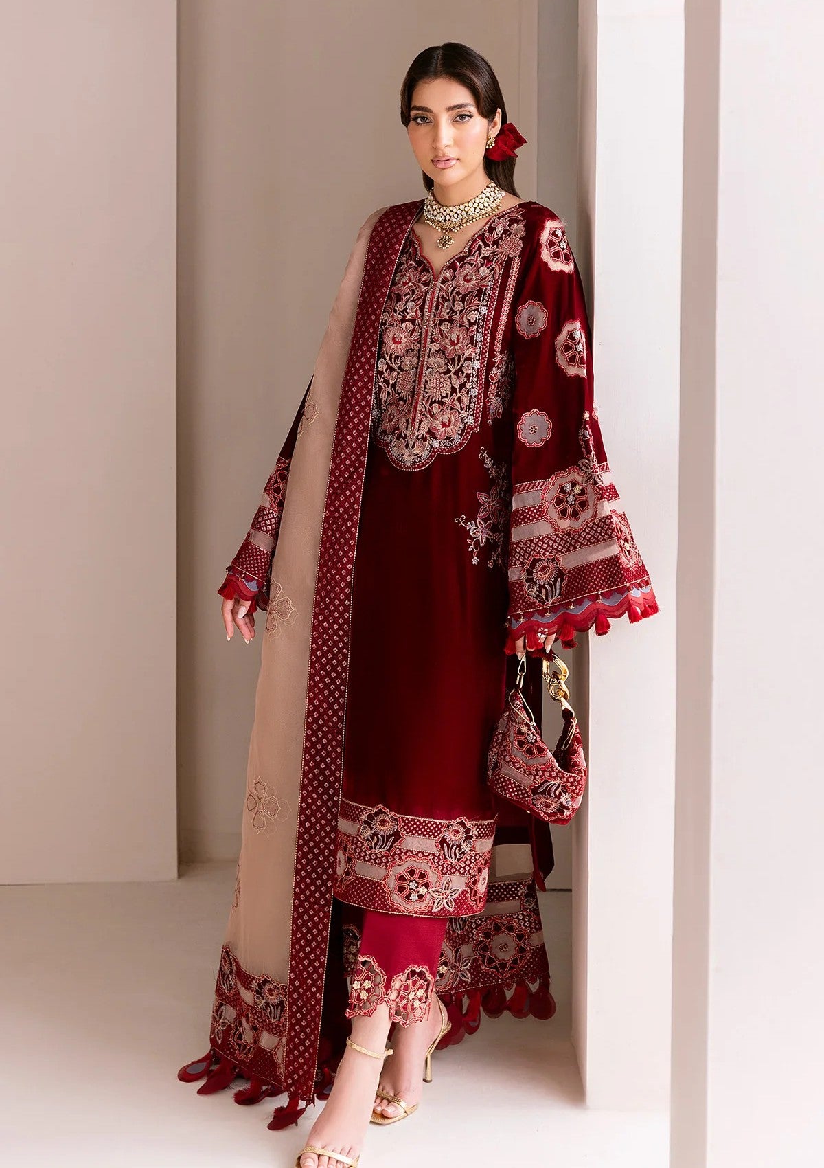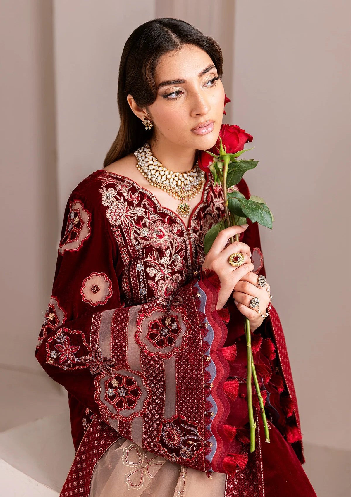 The deep maroon velvet ensemble features intricate embroidery and appliqué detailing on the front and sleeves, tailored into a long, graceful silhouette. Paired with a contrasting organza dupatta and sleek dyed Russian silk trouser, reflects festive sophistication with a regal, modern charm
