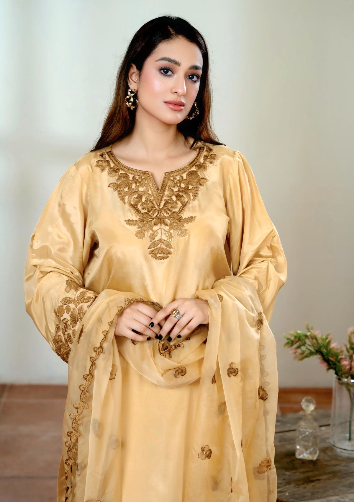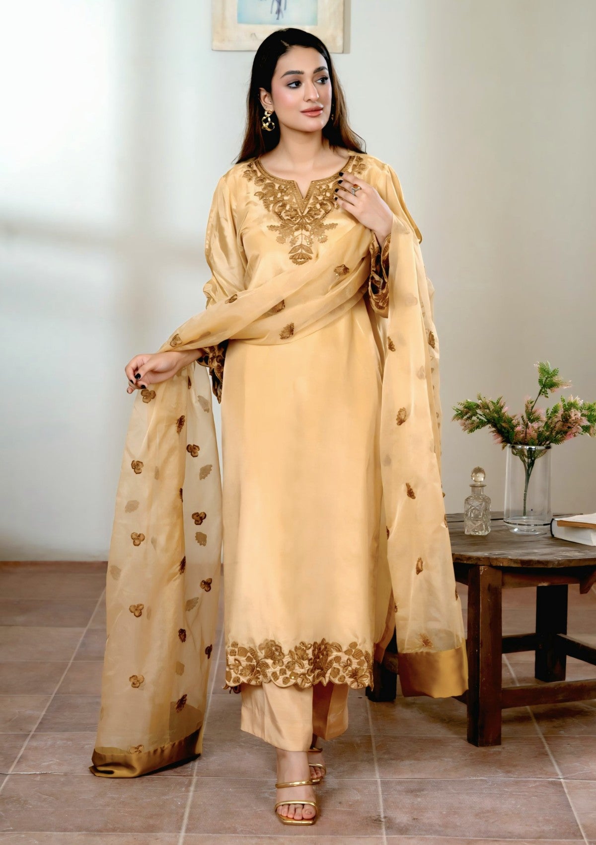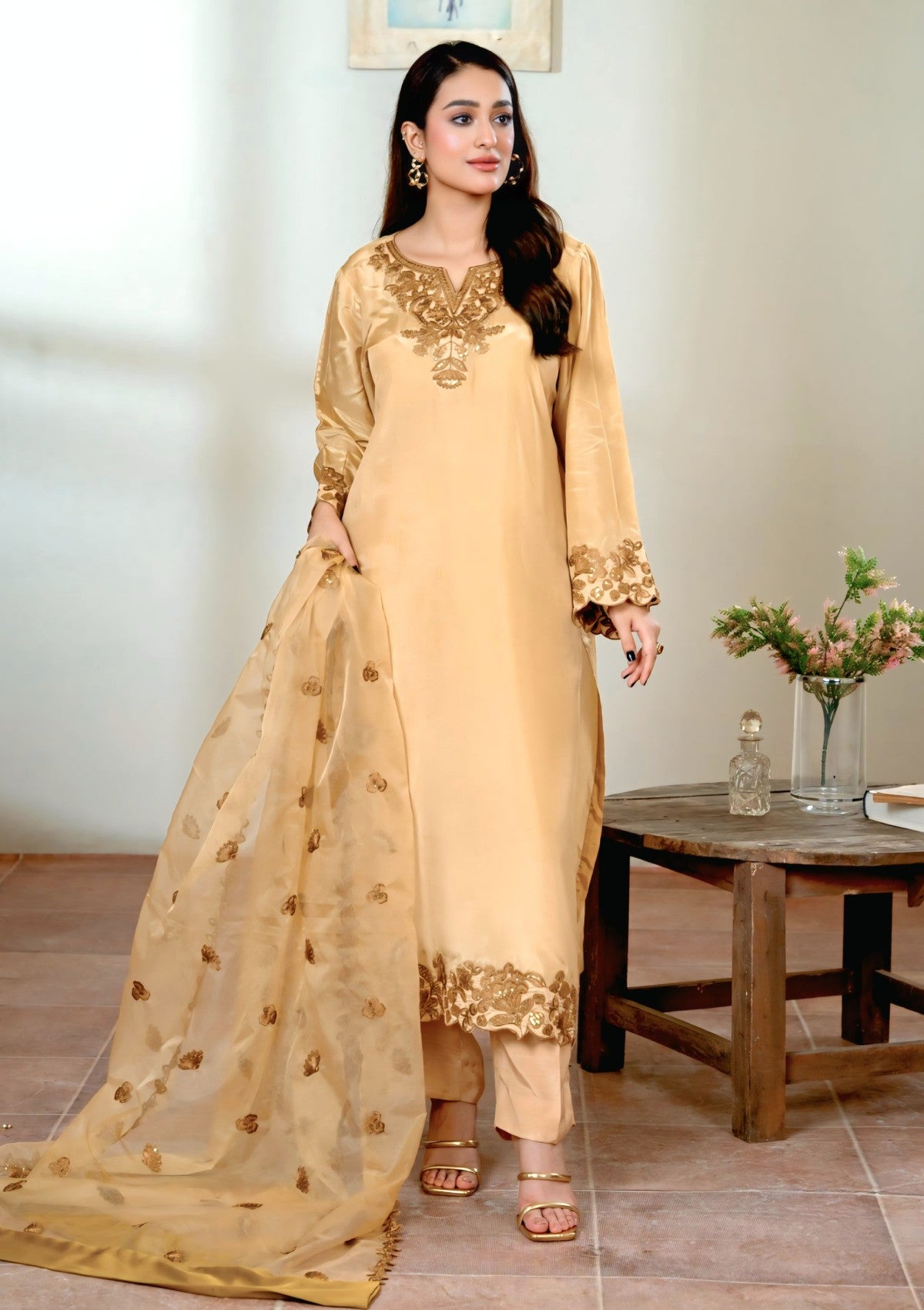 A rich gold base adorned with copper-gold sequin shine embroidery exudes elegance and luxury. The shimmering details add depth and charm, making it a perfect choice for any festive or formal occasion.