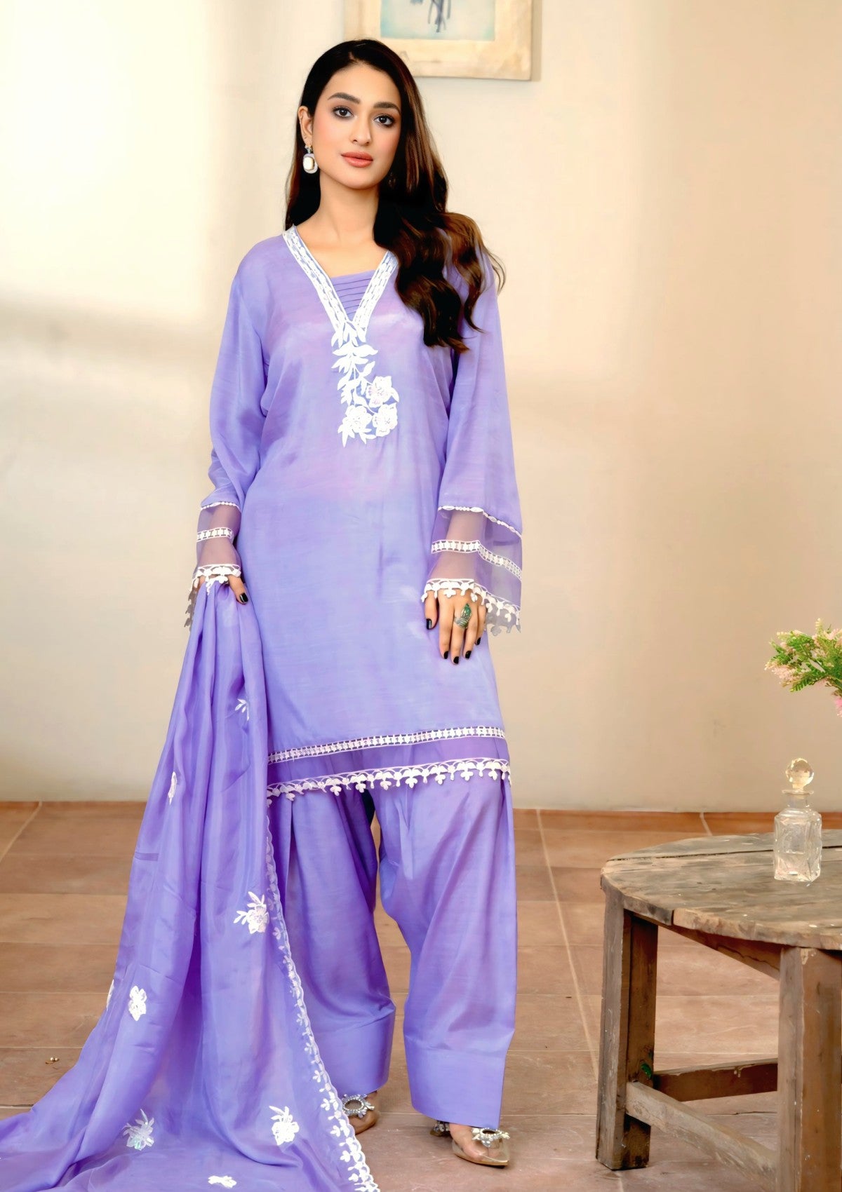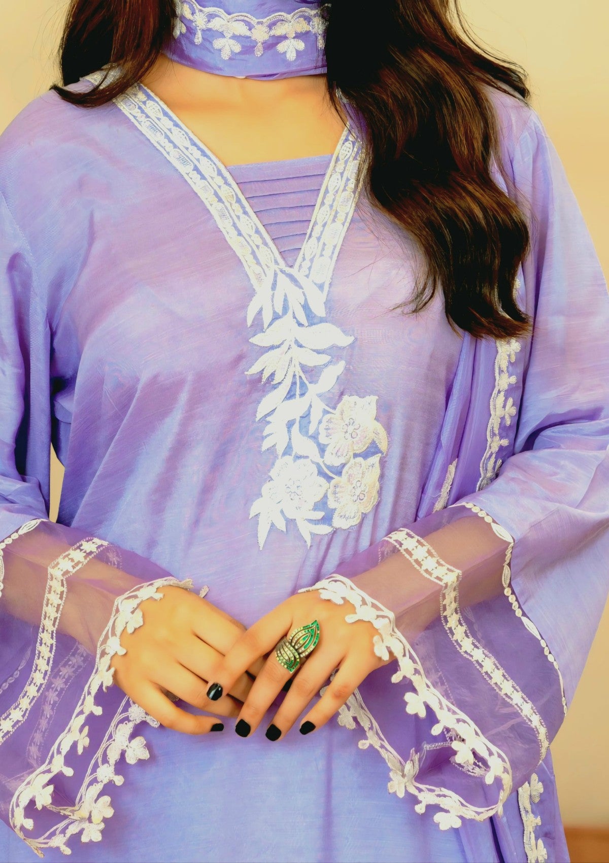 White sequin shine embroidery graces the lilac base of luxurious Sapphire Silk. The delicate shimmer adds a soft radiance to the elegant hue. Perfectly crafted to exude sophistication and grace.