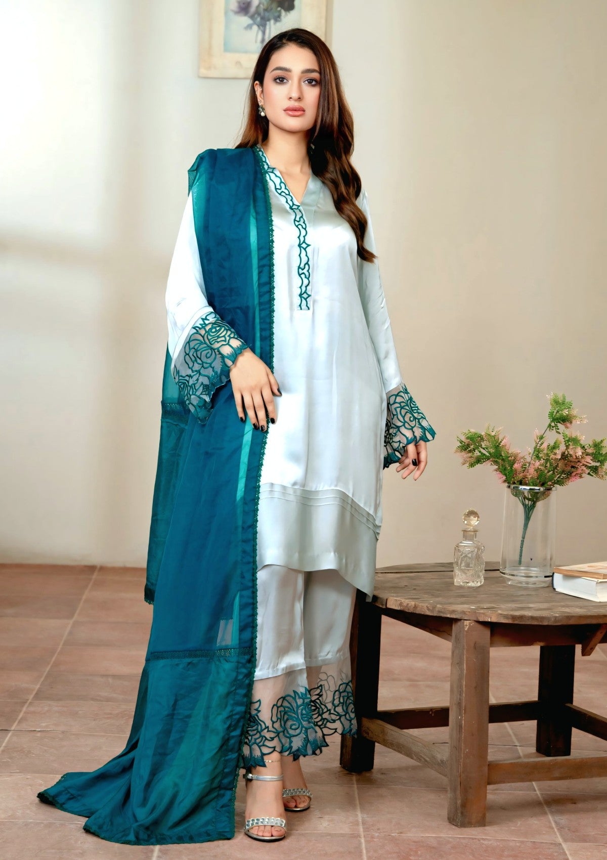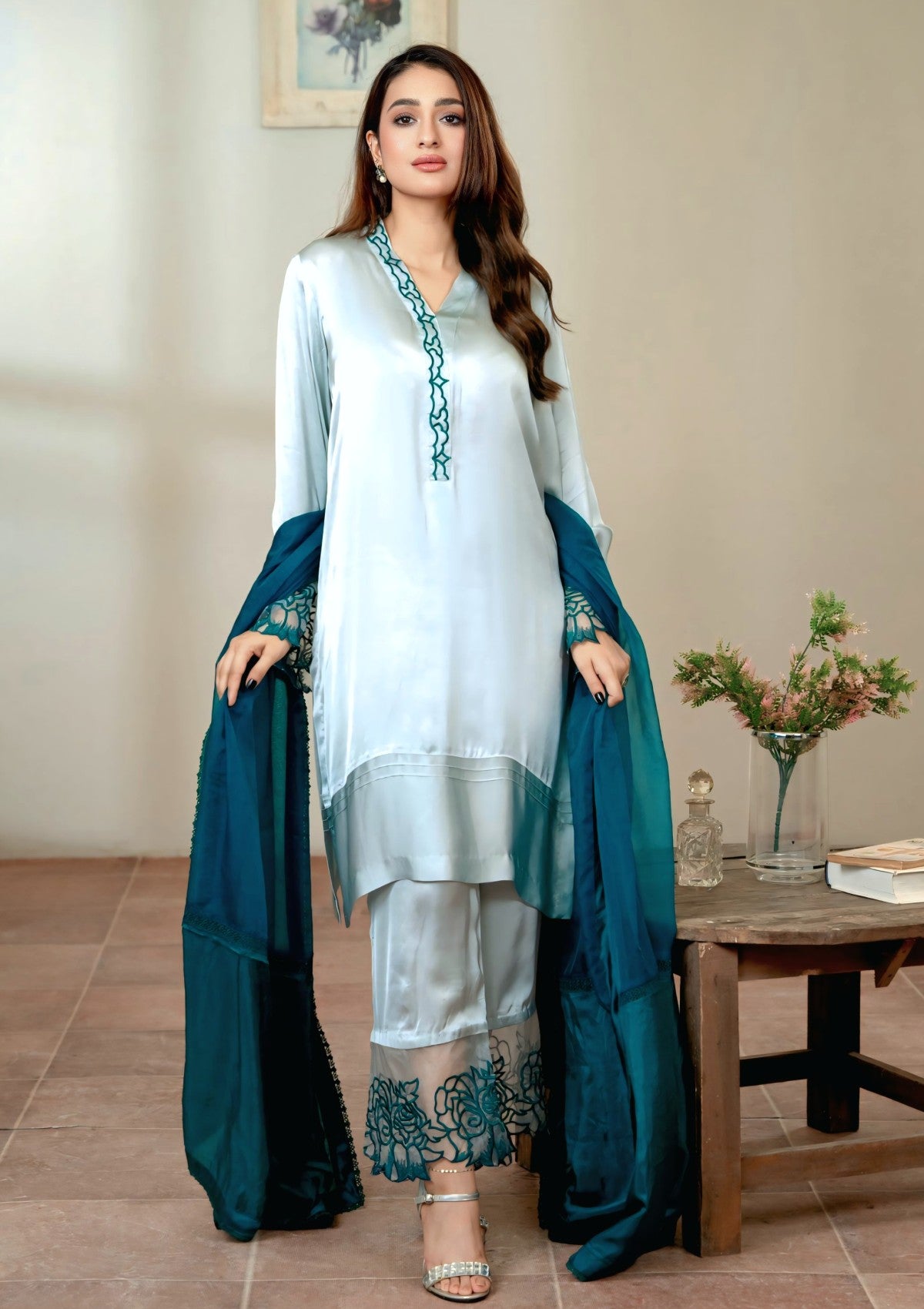 Ice blue color with zinc color embroidery work on neck sleevles & trouser and dupatta consist of 2 fabric organza & Tha silk