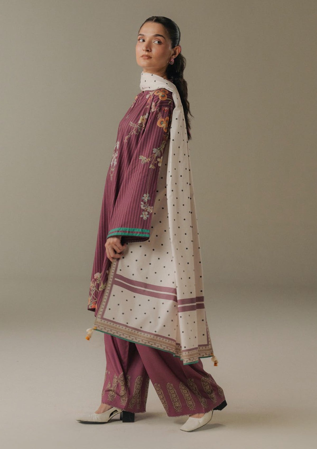 A tan rose striped shirt inspired by delicate floral motifs, paired with a tan rose trouser adorned with subtle paisley patterns. The look is completed with an off-white shawl featuring classic black polka dots, creating a timeless and effortlessly elegant ensemble.