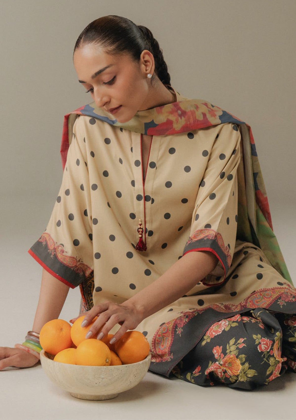 A beige shirt adorned with a blend of paisley and polka dot patterns, paired with a charcoal gray trouser featuring delicate floral prints. The ensemble is elevated with a multi-colored shawl inspired by classic pashmina designs, bringing together warmth, vibrance, and refined sophistication.