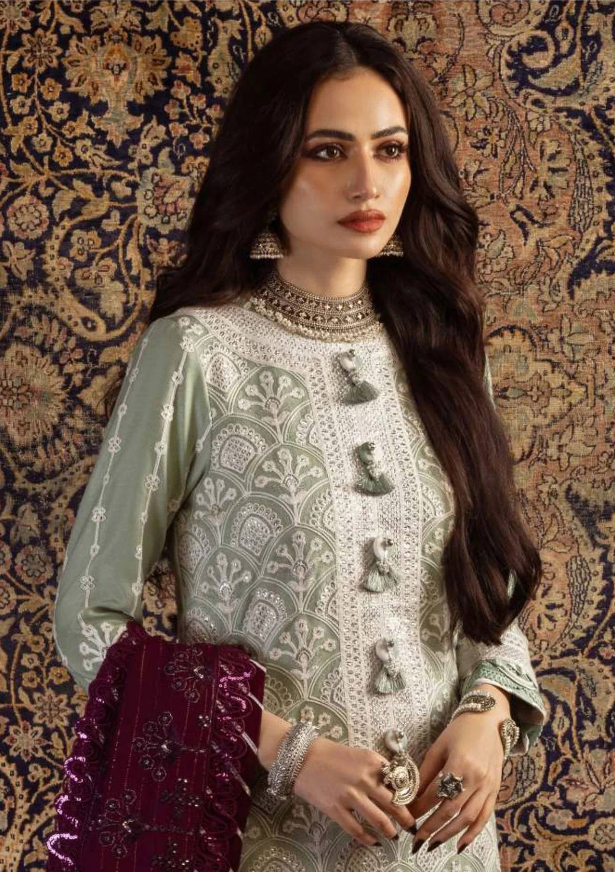 Draped in the splendor of Kashmiri Taanka, this mint green ensemble with a magenta shawl is a stunning piece that embodies the essence of the collection. The Aari Taanka stitch, an age-old tradition, finds new life with off-white thread, cupped silver sequins, and silver zari, paying homage to the region’s rich culture. The arabesque pattern adorns the neckline and mirrors itself on the zari lined self-twill shawl, where contrasting embroidery and sequins create a visual masterpiece. With embroidered front and back on twill, the outfit is a canvas that tells the tale of Kashmir’s charm. Sana Javed’s graceful presence in this outfit further accentuates the timeless grace of Kashmir and the collection’s artistry