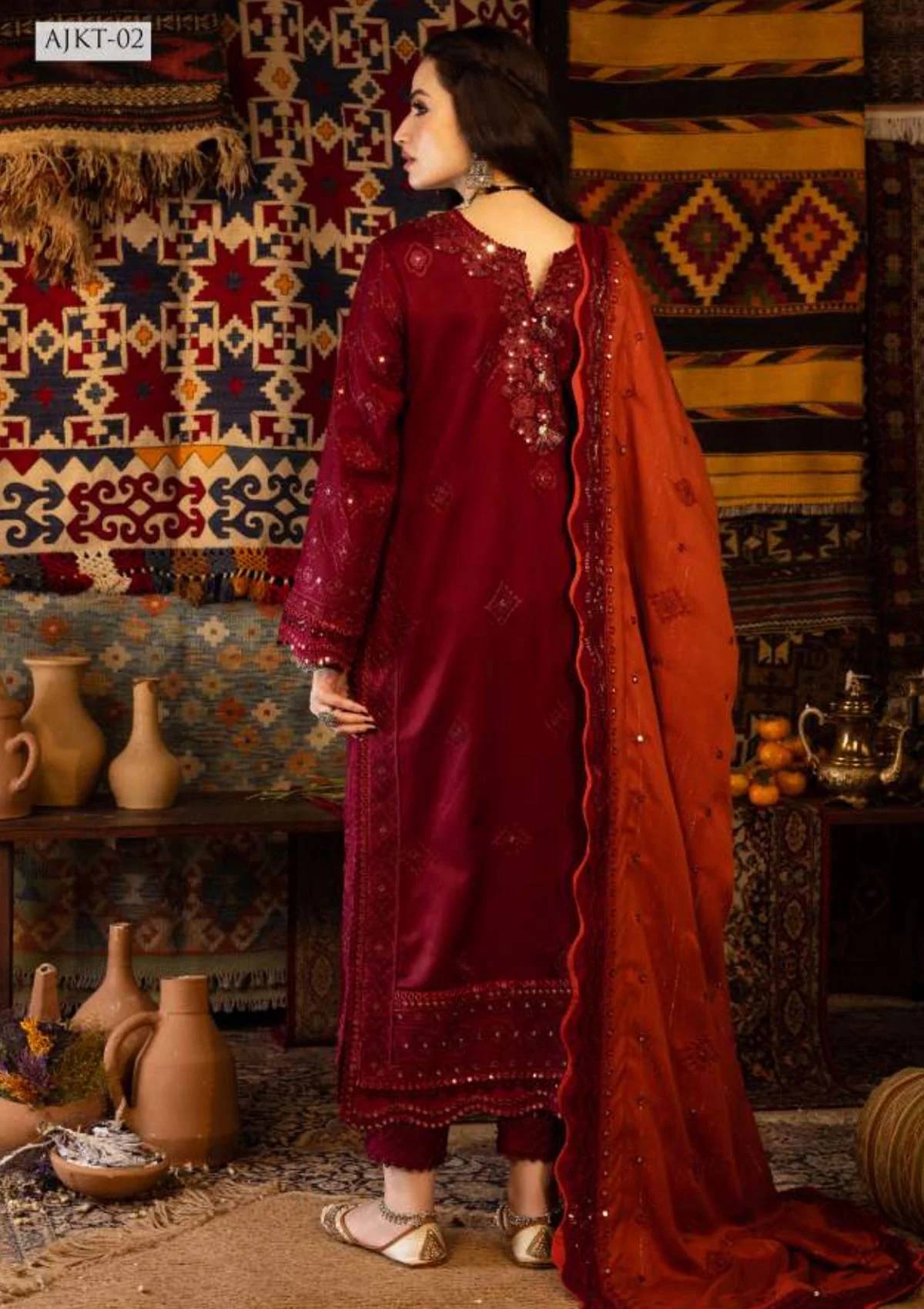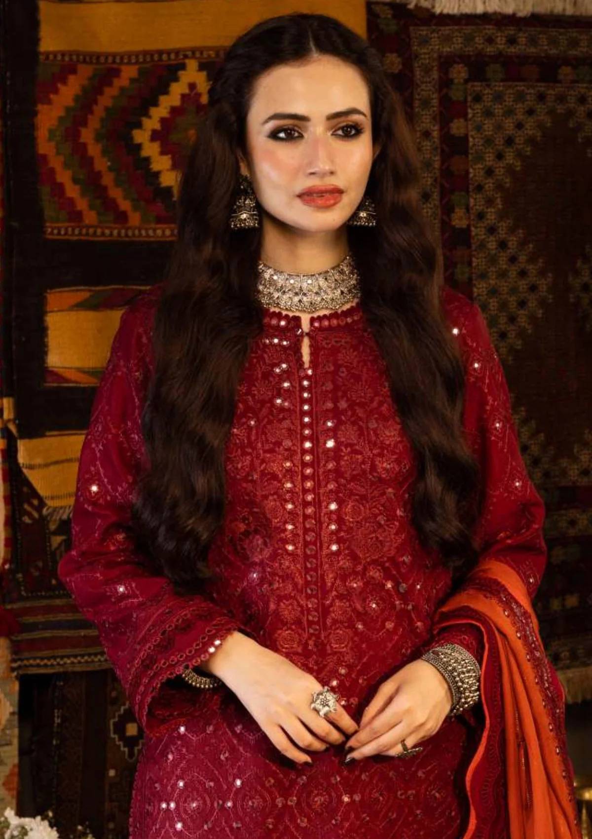 This ensemble is a captivating narrative that seamlessly weaves together the rich heritage of Kashmir with the artistic finesse of the “KASHMIRI TAANKA - Embroidered Shawl Collection.” Adorned with 9mm sequins and thread that replicate the allure of mirror work, it represents metaphorical elegance, much like the whispered tales of Kashmir’s culture. The heavily embroidered shirt, featuring a rhythmic acanthus pattern, echoes the timeless spirit of the region, serving as a testament to tradition and elegance. The shawl reflects the similar design aesthetic as shirt, adorned with 9mm sequins, serving as a metaphorical embrace, inviting you to lose yourself in the enchanting stories of Kashmir. The front and back create a visual tribute to the region’s enduring charm. Sana Javed’s presence adds to its allure, making it a visual ode to Kashmir’s heritage.
