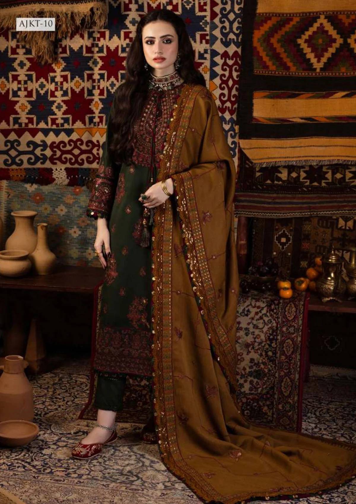 • This ensemble is a reflection of timeless artistry, much like the ageless traditions of Kashmir. The shades of dark green and mustard gold, adorned with deep maroonish red, deep gold, and rust threadwork, illuminated by matte gold sequins embroidery, tell a regal tale. The embroidered front neckline and back neckline set the stage for an enchanting narrative. The embroidered border for chaak is a testament to the enduring spirit of Kashmir’s heritage. The shawl, an embodiment of regality, serves as the final chapter in this captivating story.