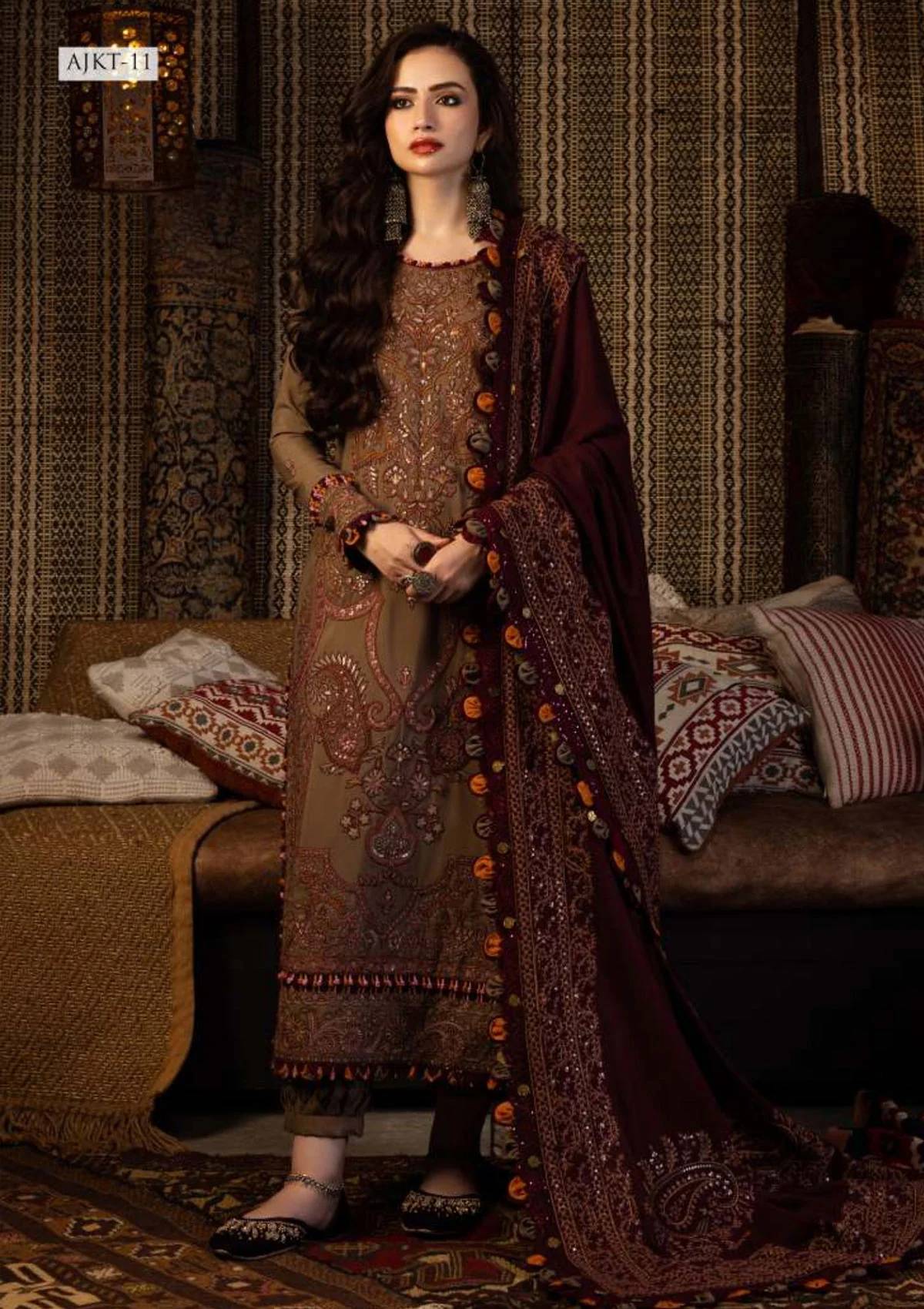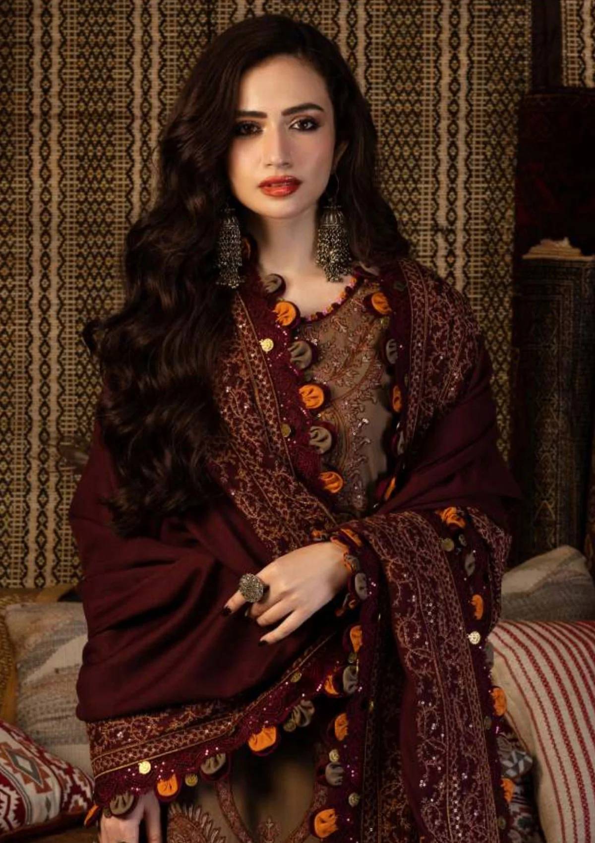 Experience the regal allure of Taupe and Deep Mahogany. This ensemble is an embodiment of cultural elegance, adorned with maroon, taupe, dull pink, and rust thick cotton threadwork, interlaced with transparent sequins. The stitches in this design are inspired by the intricate work on Pashmina Shawls, crafted with single threads and open stitches. Every element of this ensemble is deeply inspired by Kashmiri Taanka, featuring culturally inspired motifs and designs. The embroidered neckline serves as a gateway to the captivating narrative, while the all-over embroidery for the front and back, accompanied by daman borders, creates a rich tapestry. The pair of embroidered sleeves with borders are a reflection of tradition. The embroidered shawl, complete with four-sided borders and additional bunches, envelops you in the allure of Kashmir’s artistry.