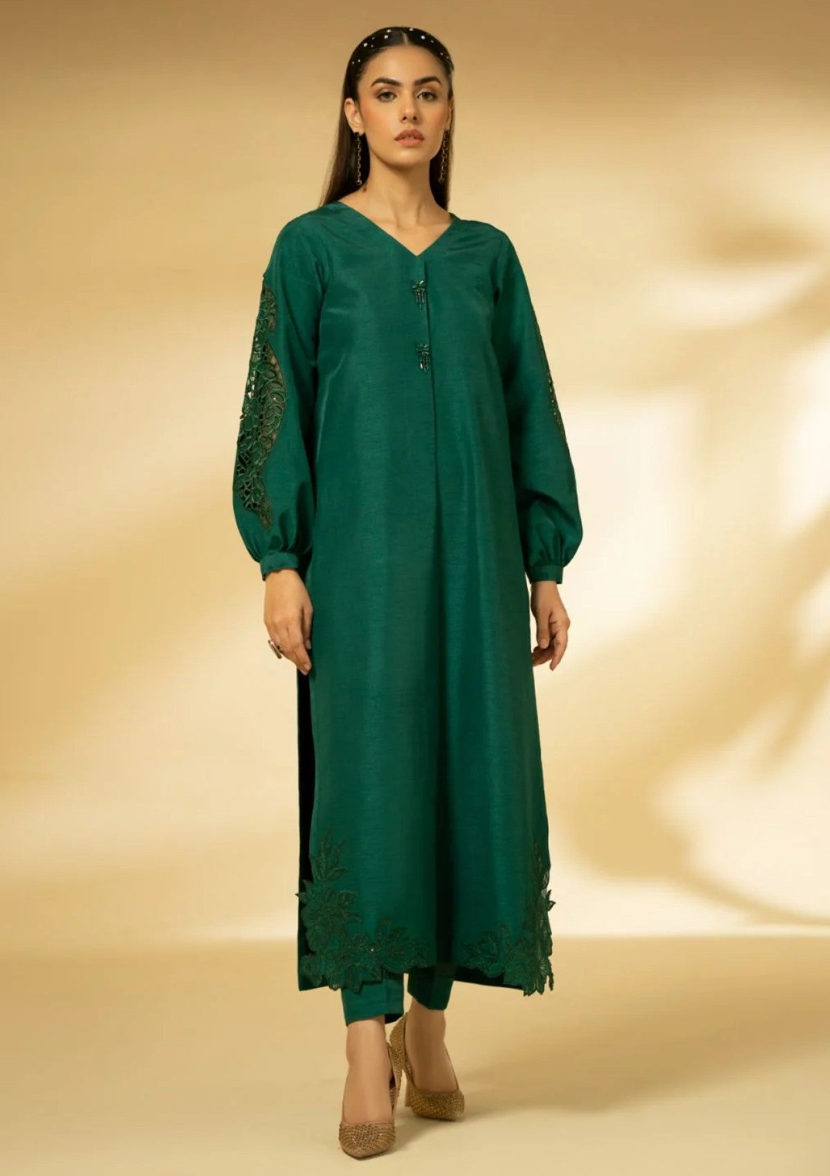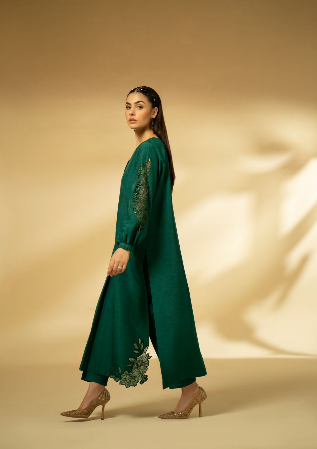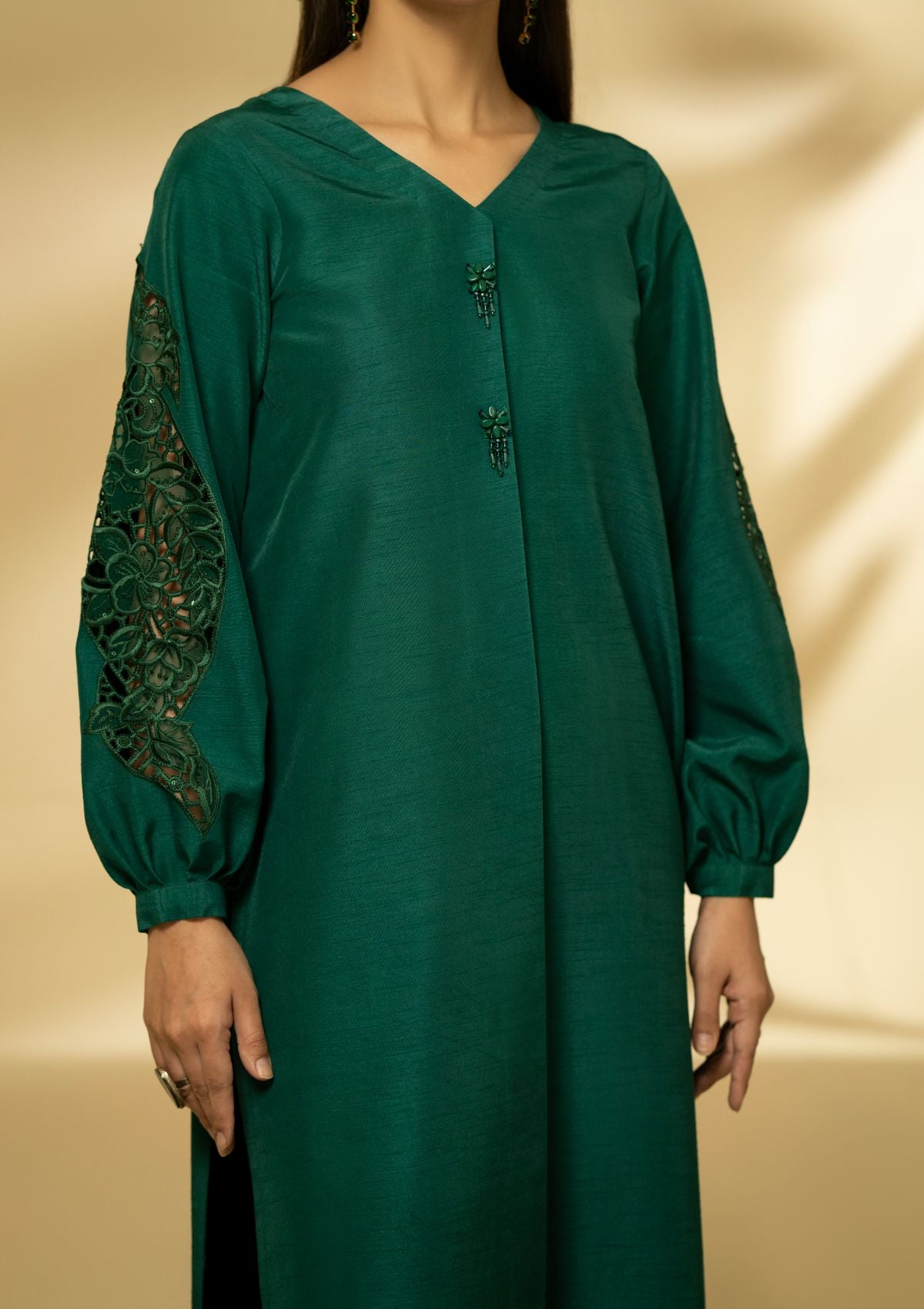 Step into a world of enchanting beauty with "Emerald Symphony”. This captivating outfit features a rich Green color, reminiscent of the deep allure of emeralds. Crafted from luxurious Raw Silk, the shirt boasts a front cutline and is adorned with meticulously handcrafted buttons on the front, adding a touch of elegance and uniqueness. The sleeves are a work of art with bold embroidery and cut work details, featuring gathers and cuff sleeves that create an aura of sophistication. The outfit is paired with a Korean Raw Silk narrow trouser featuring embroidered border, ensuring both comfort and contemporary style. |
