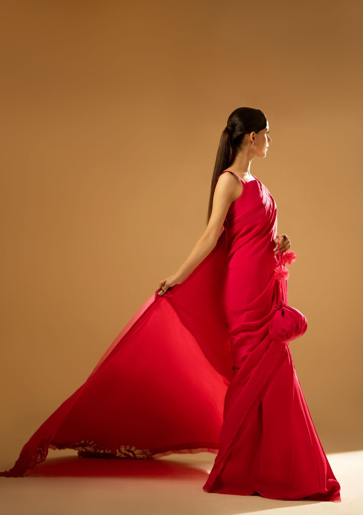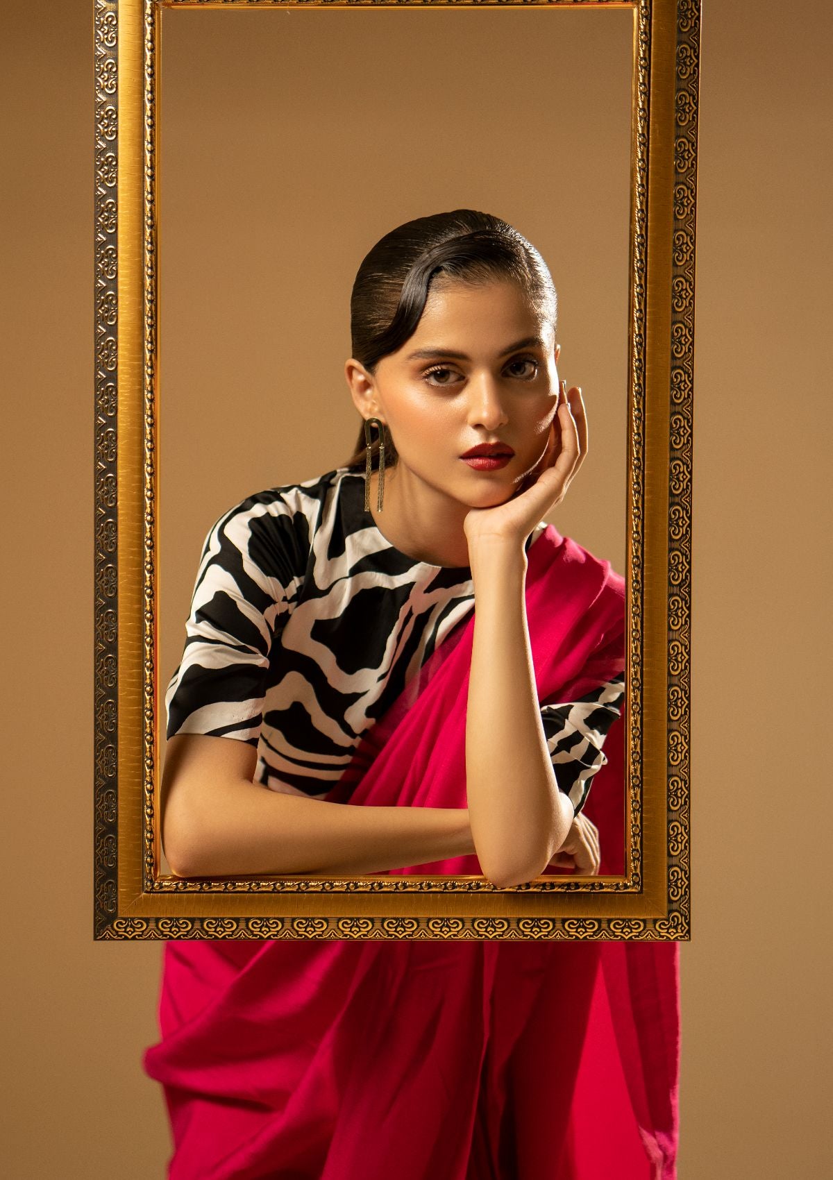 Dive into the world of vibrant elegance with "Fuchsia Finesse." This captivating saree ensemble showcases the bold and beautiful Fuchsia Pink hue, a symbol of confidence and allure. The luxurious raw silk saree features meticulously embroidered Organza motifs on the pallu, adding a touch of artistic flair. The versatility of this ensemble is accentuated by two blouse options: a Plain Self-color blouse for a classic look and a Black and White contrasting blouse adorned with tassels on the back, perfect for a contemporary twist. "Fuchsia Finesse" is more than just clothing; it's an expression of your vibrant personality and timeless grace |