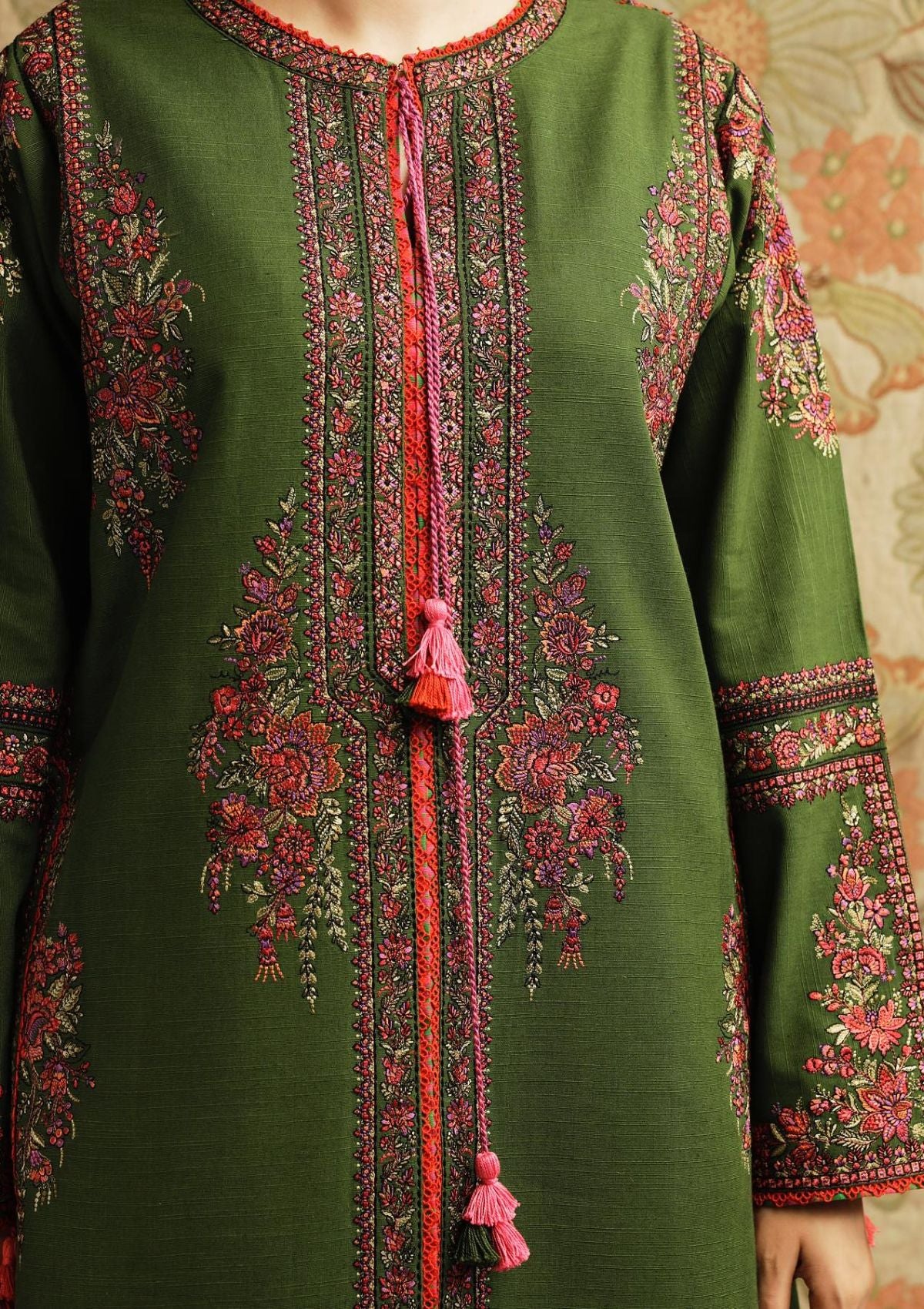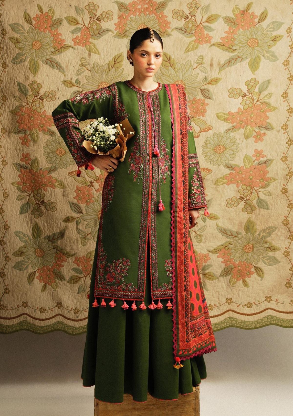 This olive green khaddar jacket with beautiful motifs is designed to perfection. It is embroidered with intricate details on the borders and motifs. It has also embroidered pockets on the front and back that truly give the statement of the outfit. To complete the look it is paired with a gorgeous green and pink printed shawl