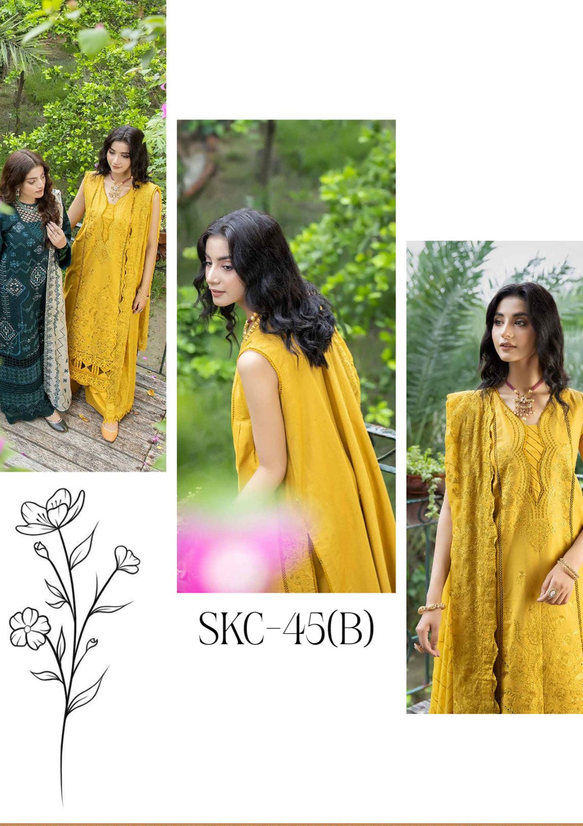 DYED KARANDI EMBROIDERED FRONT DYED KARANDI EMBROIDERED BACK DYED KARANDI EMBROIDERED SLEEVS EMBROIDERED ORGANZA LACE FOR SLEEVES EMBROIDERED CHIFFON DUPATTA DYED KARANDI TROUSER