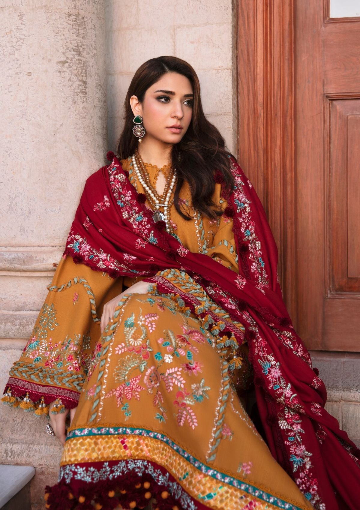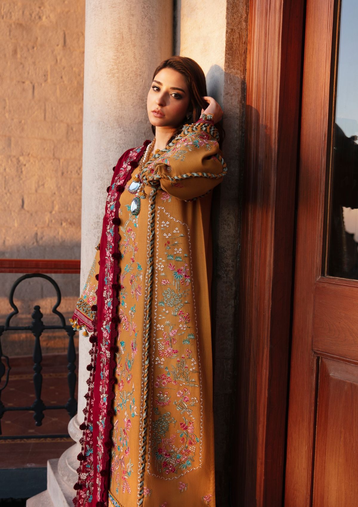 A three panelled mustard shirt unfolds, decked in resplendent allure and graced by the presence of intricate floral motifs engraved onto a radiant tapestry of mustard khaddar. Masterpiece unfolds, adorned with the artistry of satin stitches with intricate floral multi colored embroidery with acrylic shawl, elevated to extraordinary heights by a daring and swirling four sided floral embroidery adorned with vivid hues.