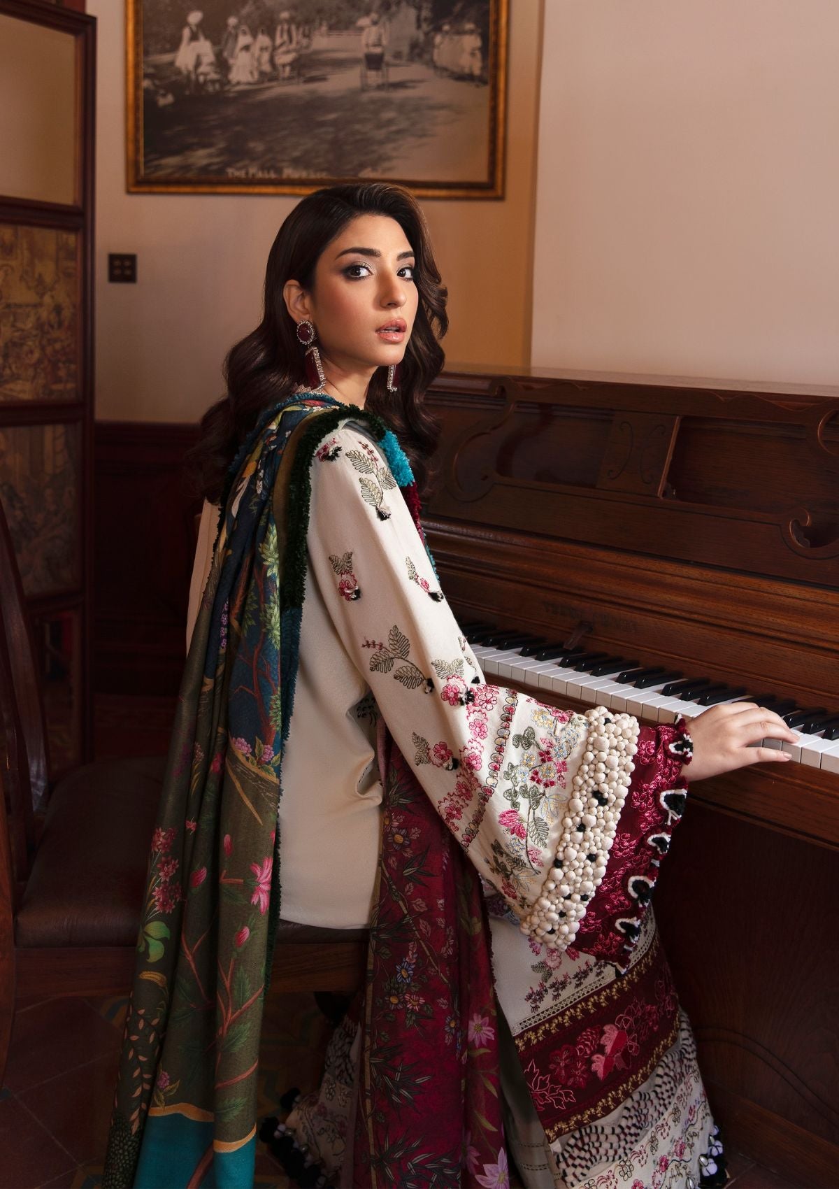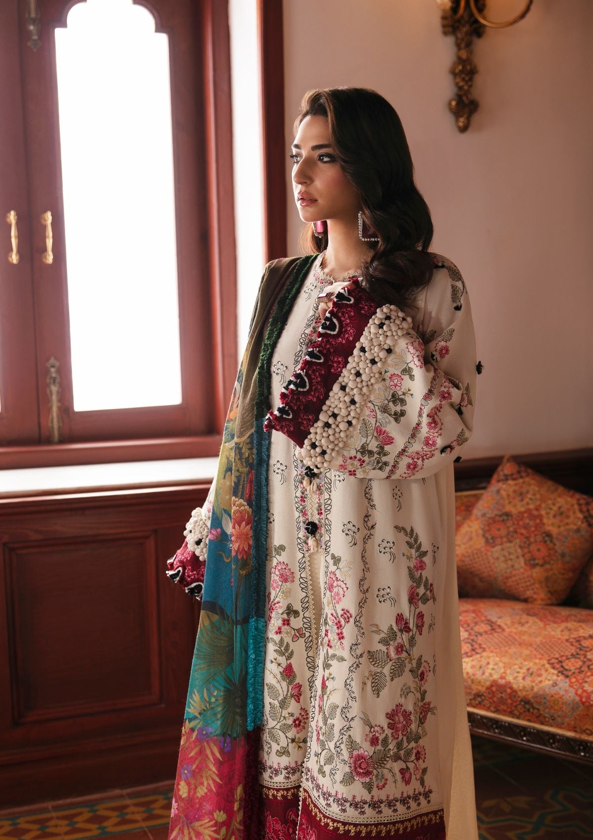 A luxuriously crafted piece of karandi fabric, resplendent in a creamy white hue, showcases exquisite floral embroidery that unfolds in a harmonious symphony of reds, pinks, lime, and feroza shades. The printed floral pashmina, a testament to refined design, exhibits a masterful play of color blocking, enhancing its visual allure. This opulent textile represents a fusion of traditional craftsmanship and contemporary aesthetics, making it a captivating and timeless creation.