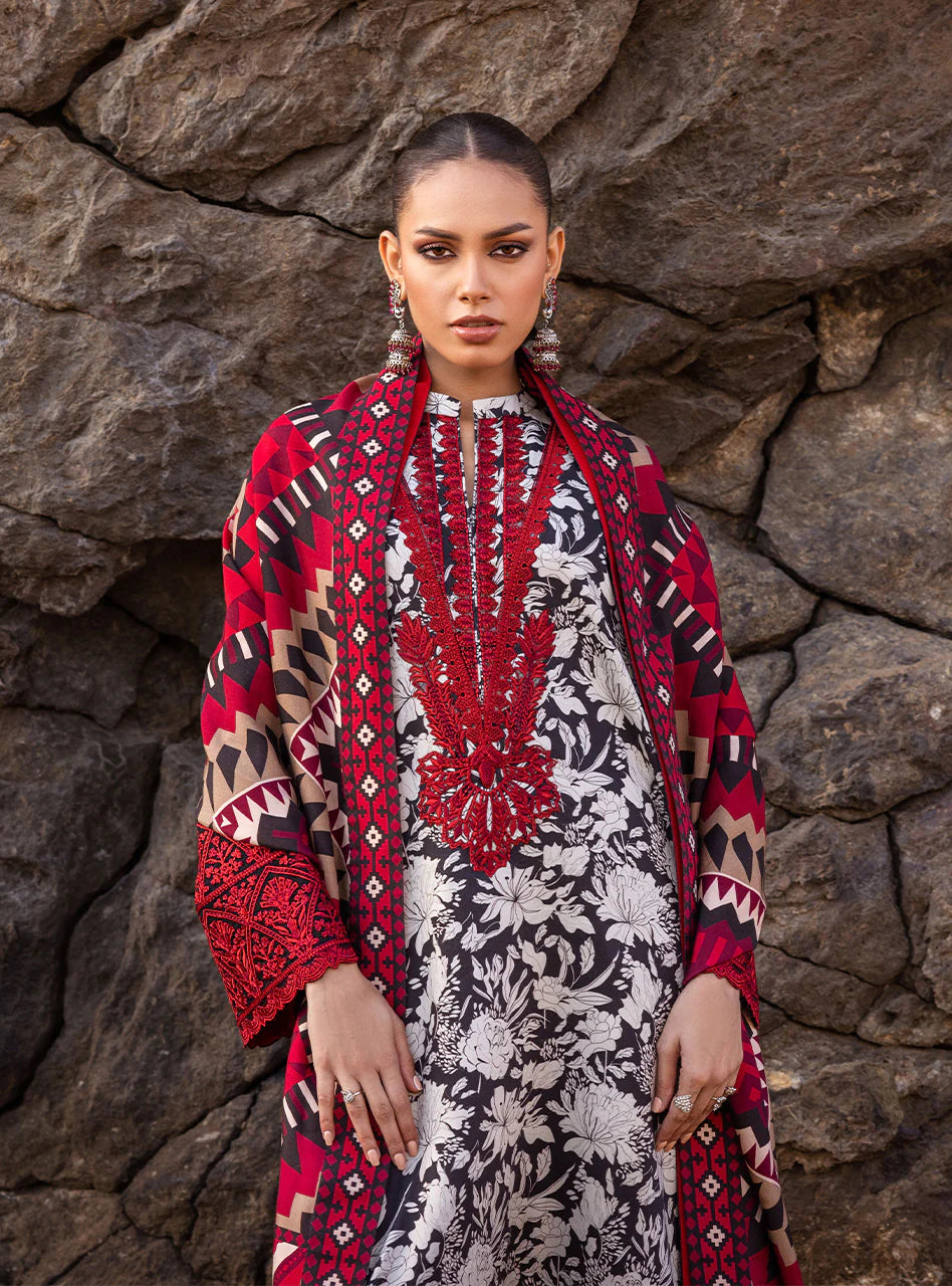 Step into the world of winter sophistication in this eye catchy black and white classic, with delicate red embroidery across the neckline, sleeves and daman. Paired with a shawl not only functional but also serves as a statement accessory that elevates your entire look.