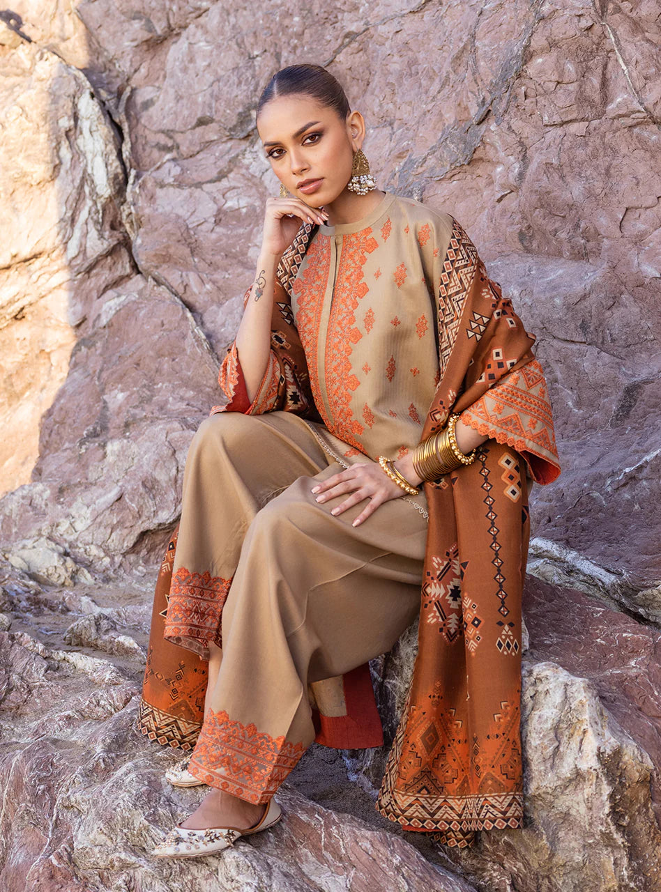 Indulge in the cozy embrace of this look, with a beautifully embellished neckline with motifs all over the sleeves and daaman. This subtle look is highlighted with a captivating printed shawl. Elevate your winter ensemble with these uniquely designed shawls with a bold Aztec print.