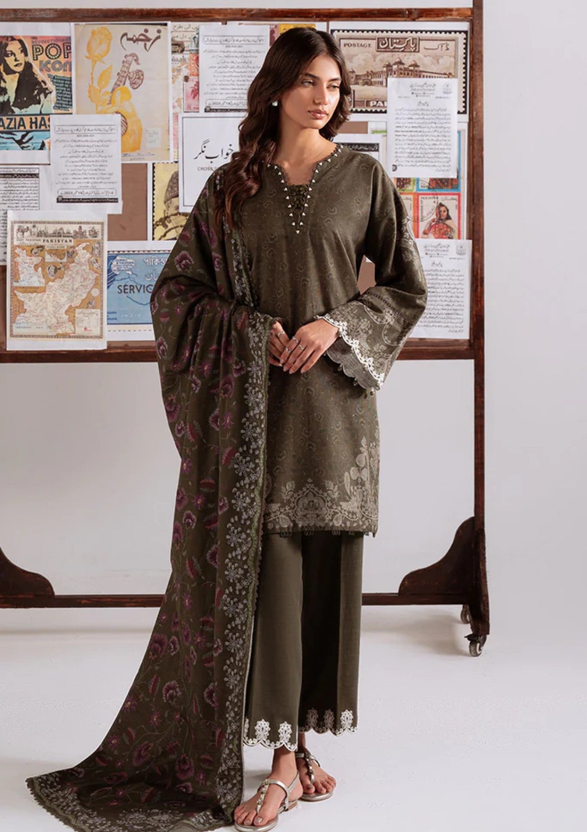Experience timeless elegance with the OLIVE CHARM-3PC Khaddar Printed Suit. This expertly crafted ensemble features a Khaddar printed shirt enhanced with 80" intricate embroidered patti along the hem and 40" delicate embroidery on the sleeves, adding refined detail. Paired with a Khaddar dyed trouser for a cohesive and comfortable fit, and completed by a matching Khaddar printed dupatta, this suit offers both warmth and style suitable for cooler seasons. Perfect for those who appreciate traditional craftsmanship combined with sophisticated design.