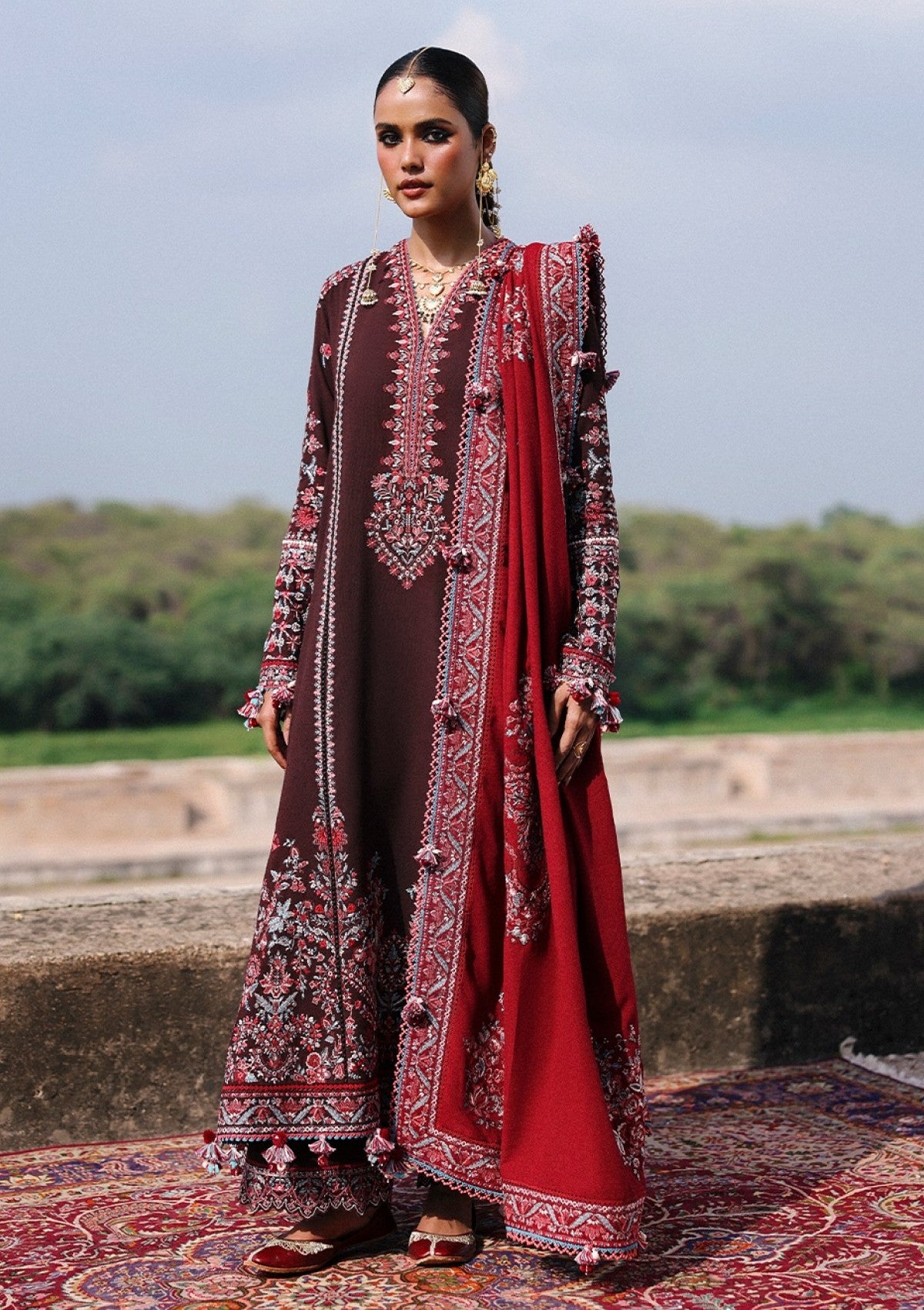 A stunning dark brown karandi ensemble that perfectly blends classic tradition with modern sophistication. Detailed with delicate embroidery and paired with a rich red embroidered shawl, it creates a graceful and luxurious contrast. Completed with a matching embroidery trouser, this outfit is ideal for festive occasions and winter gatherings — a true symbol of timeless elegance and refined style.