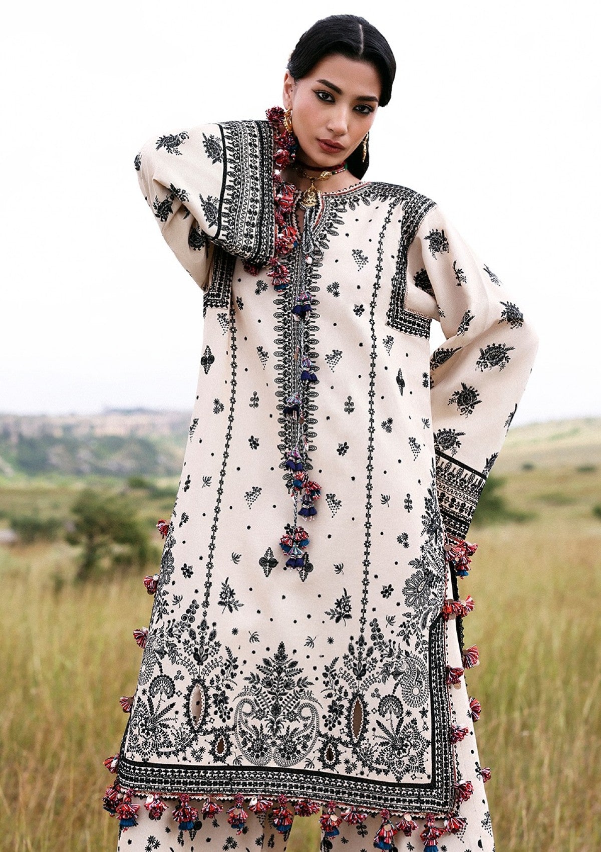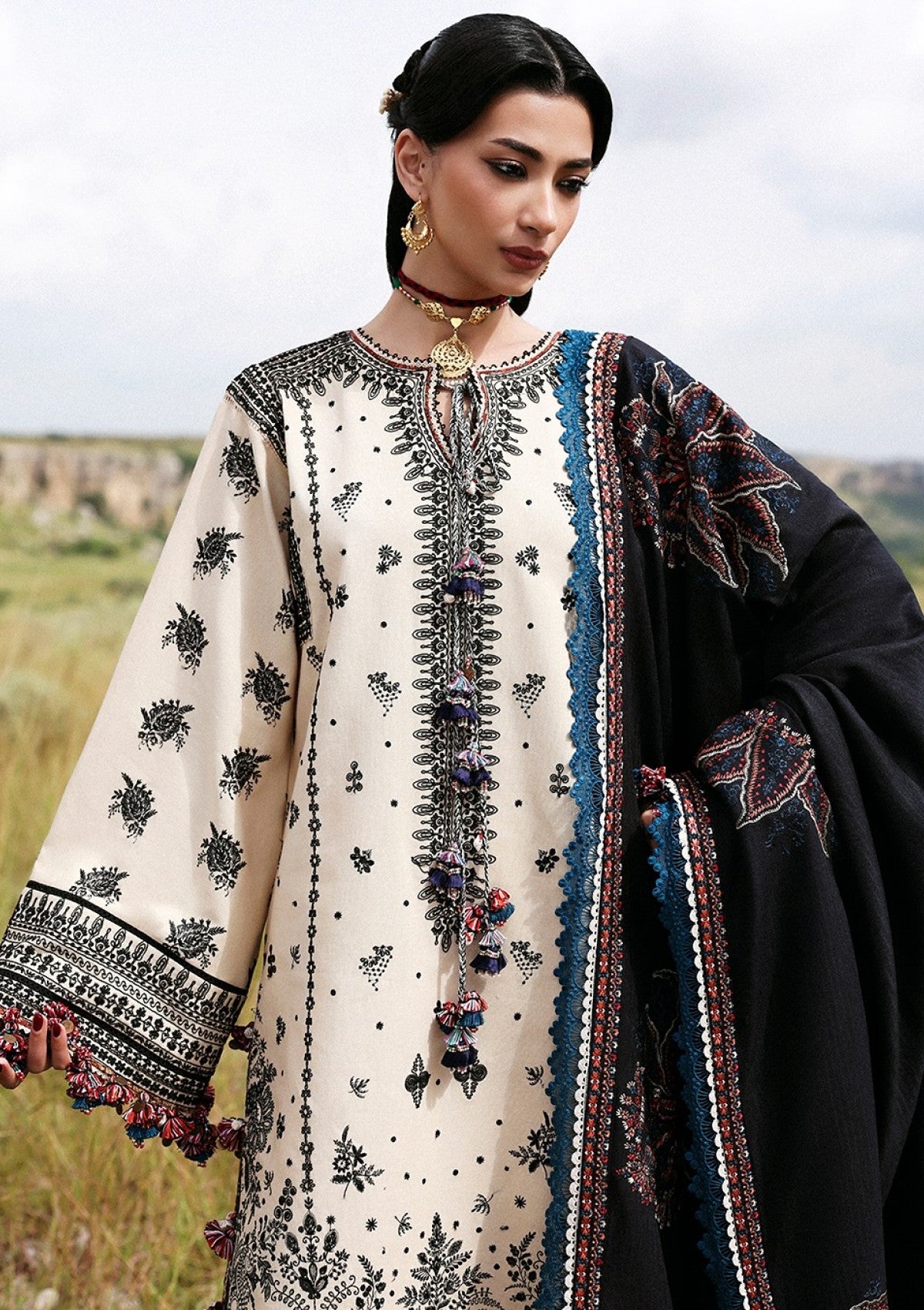 A long beige khaddar shirt with a dori-style neckline and keyhole detail, featuring delicate boti spray panels and a heavily embroidered dori-inspired hem and sleeves. Paired with embroidered culottes and a contrasting black wool shawl adorned with bold multicolored florals and embroidered borders — a perfect blend of warmth, grace, and timeless style.